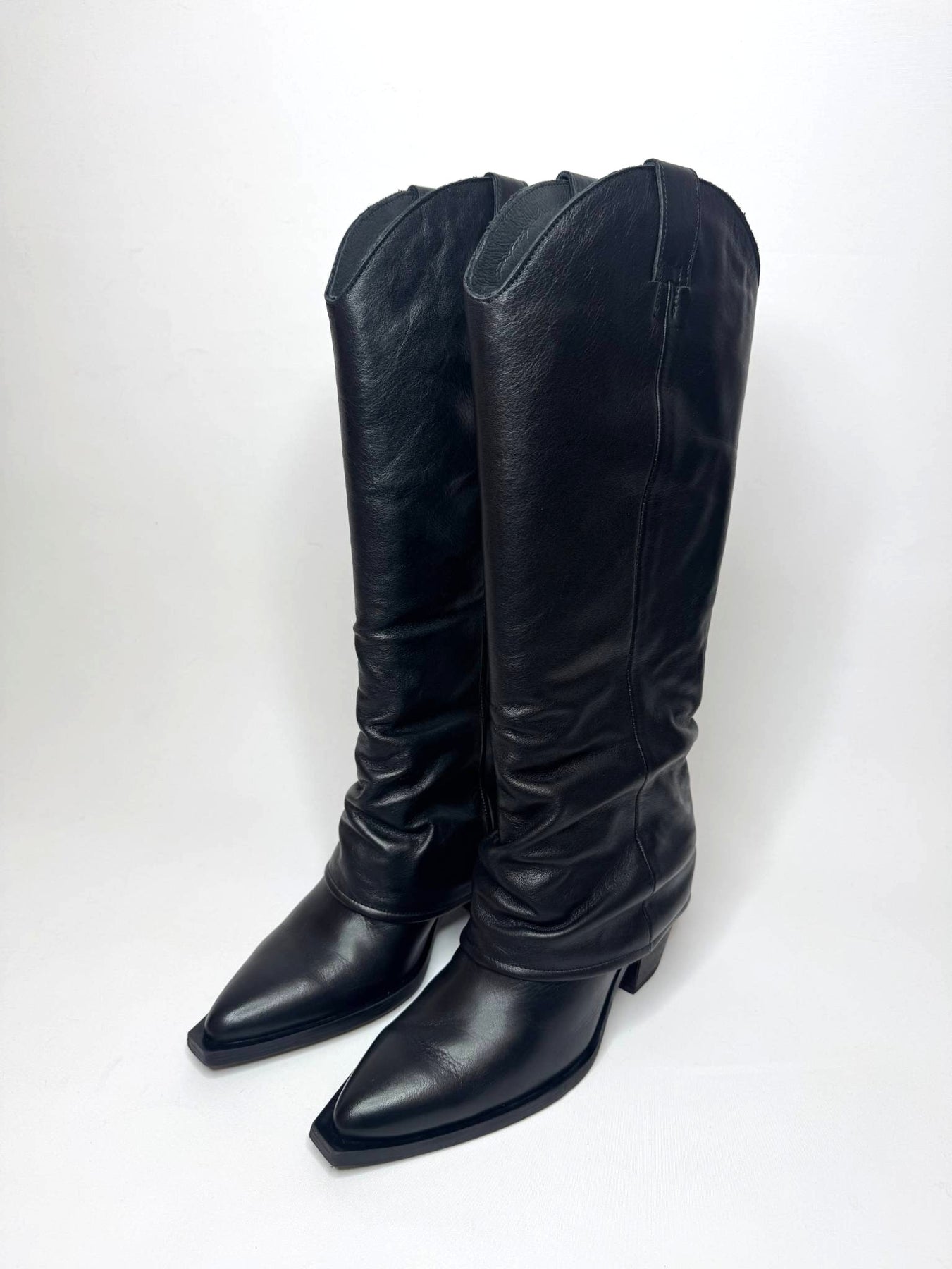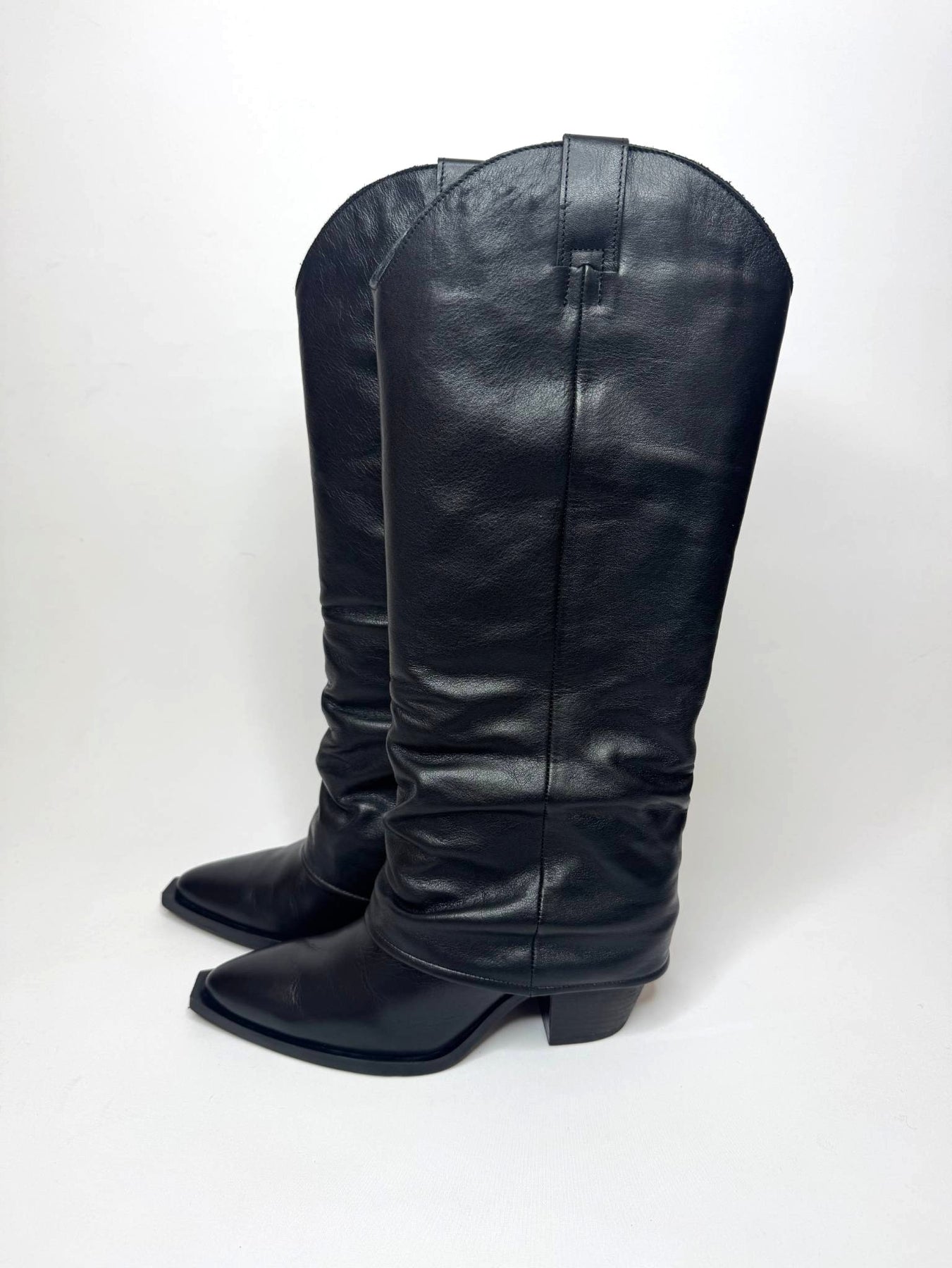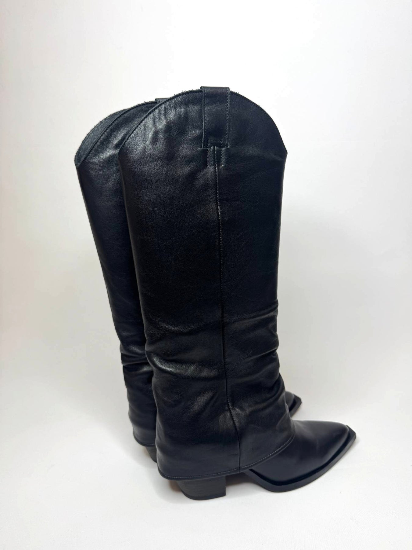 Stunning black western-style boots, leather look overlaid on top with the cowboy style. lovely pointed toe with a heel.
