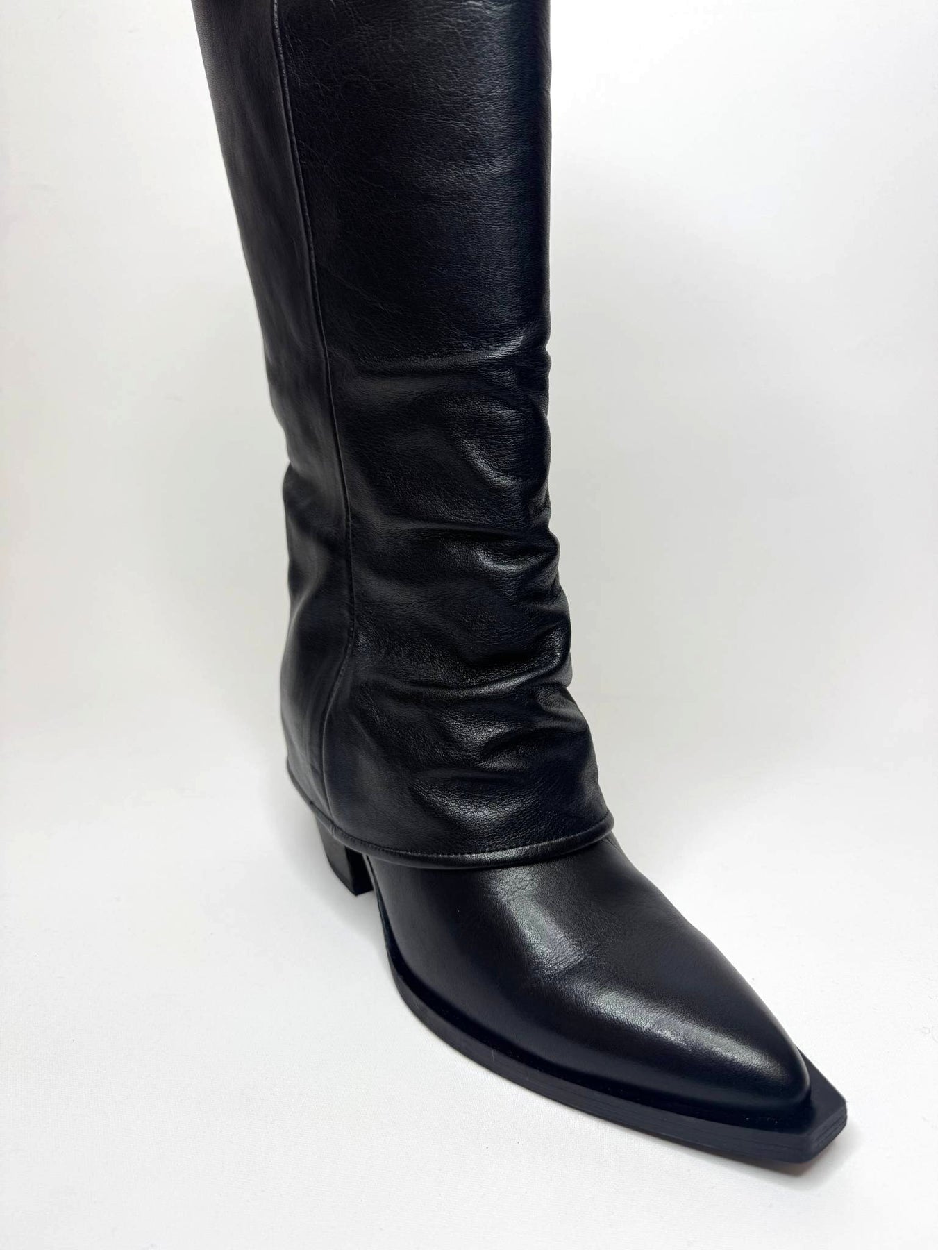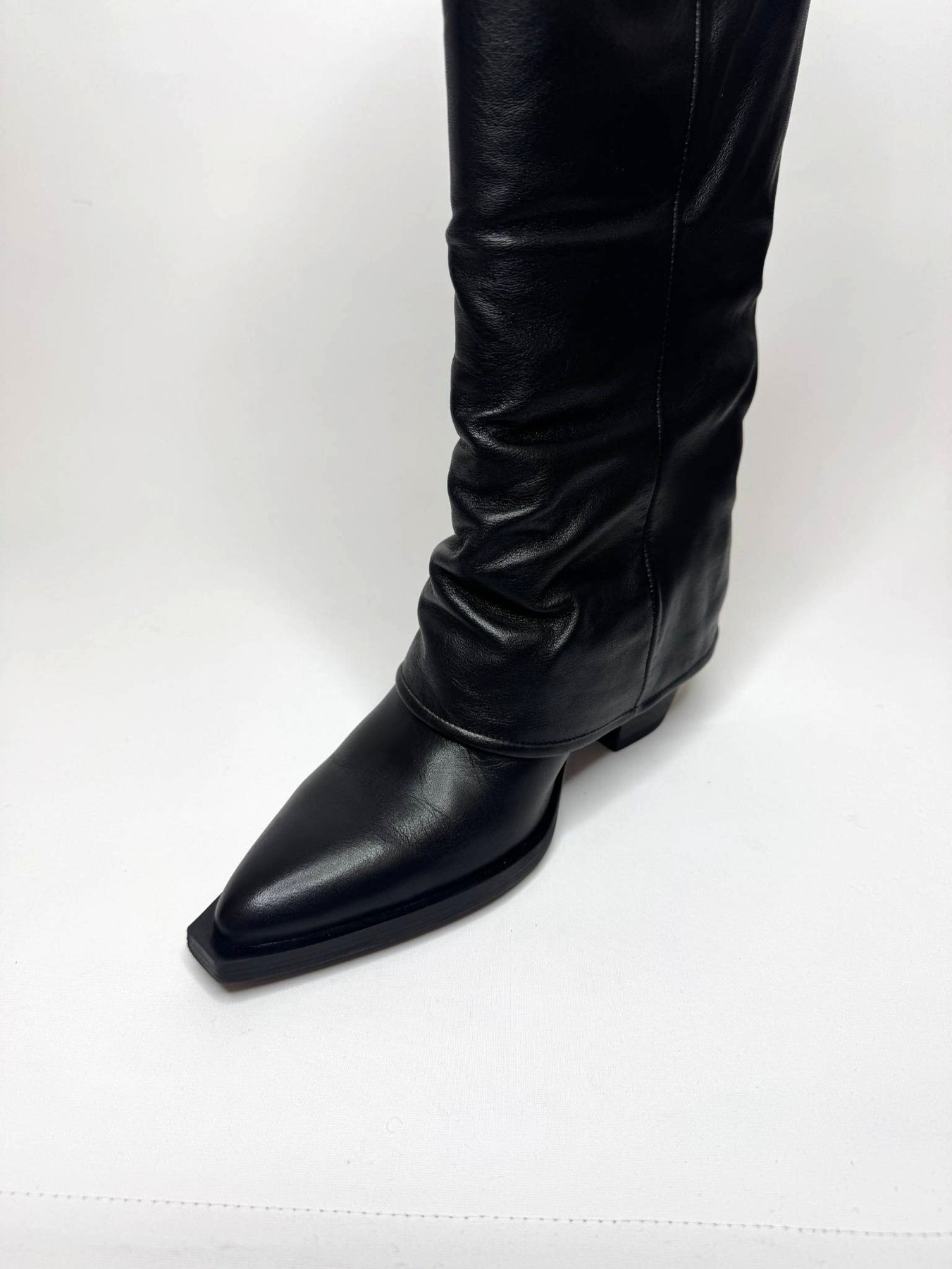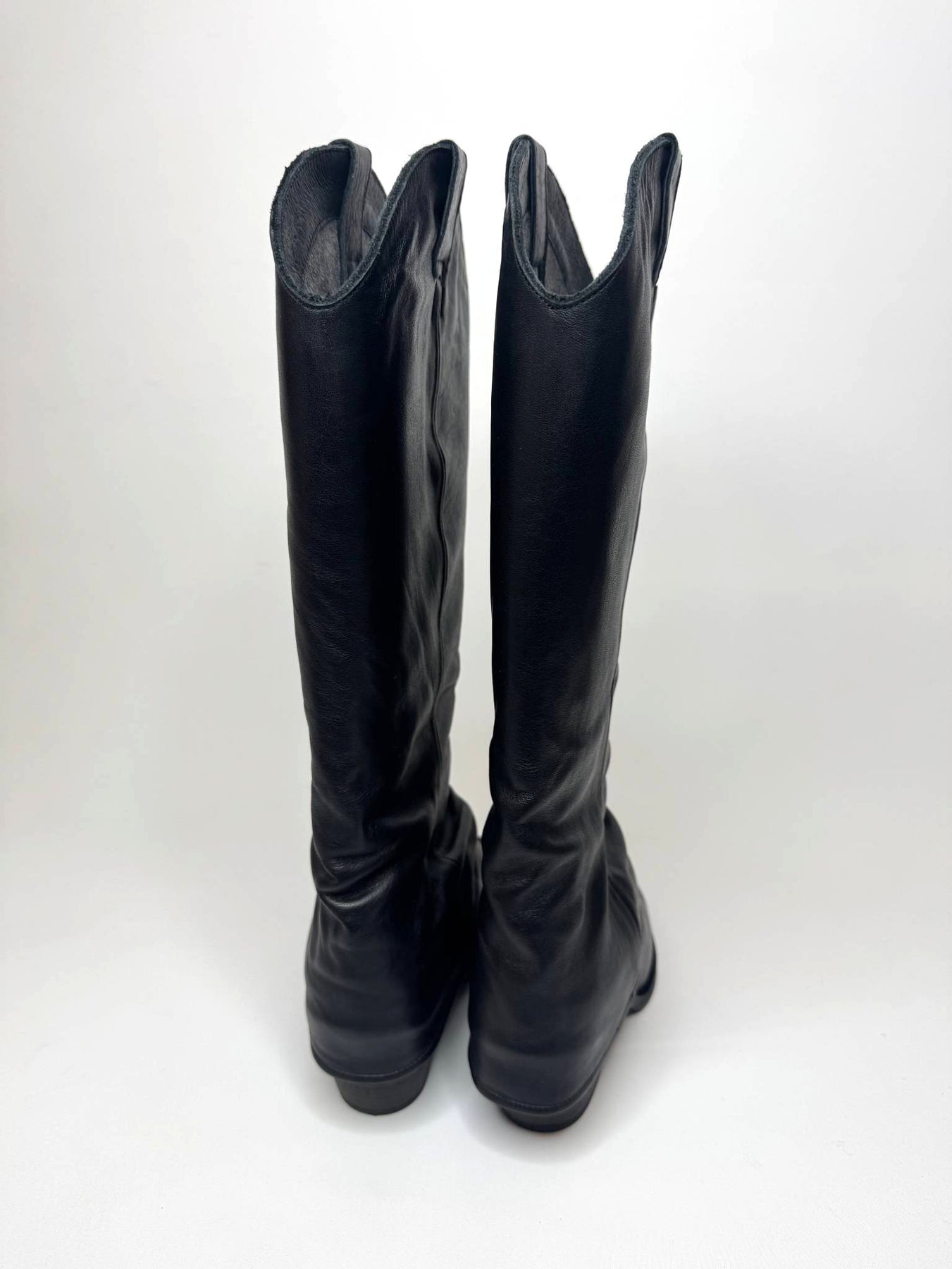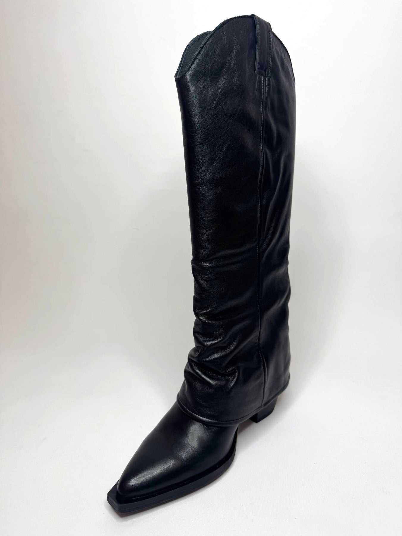 Stunning black western-style boots, leather look overlaid on top with the cowboy style. lovely pointed toe with a heel.