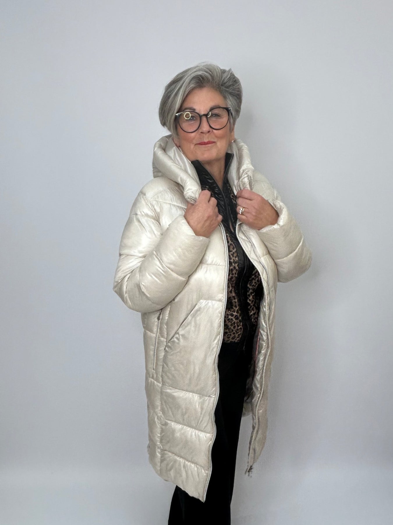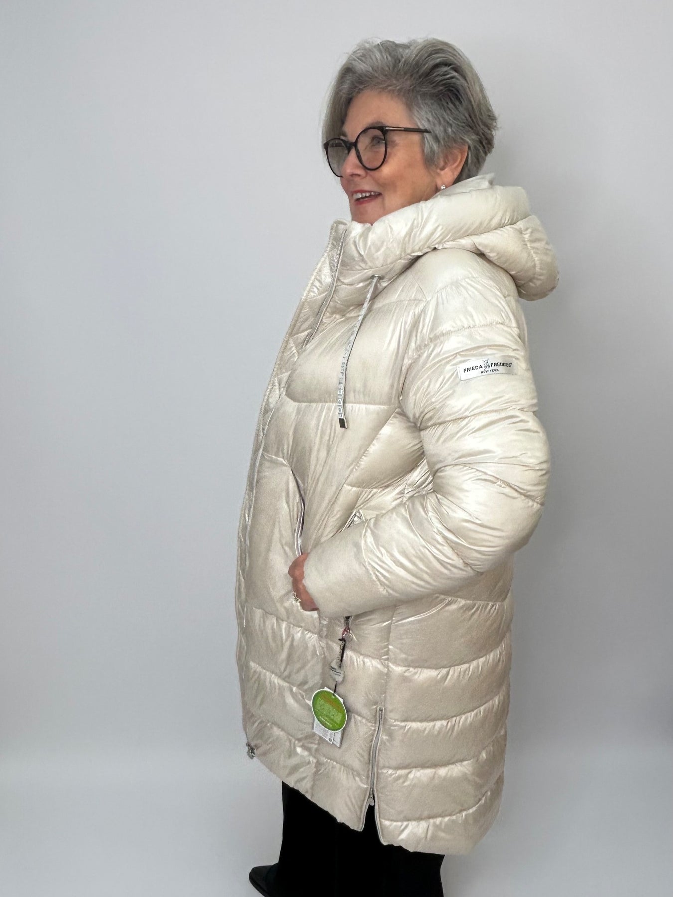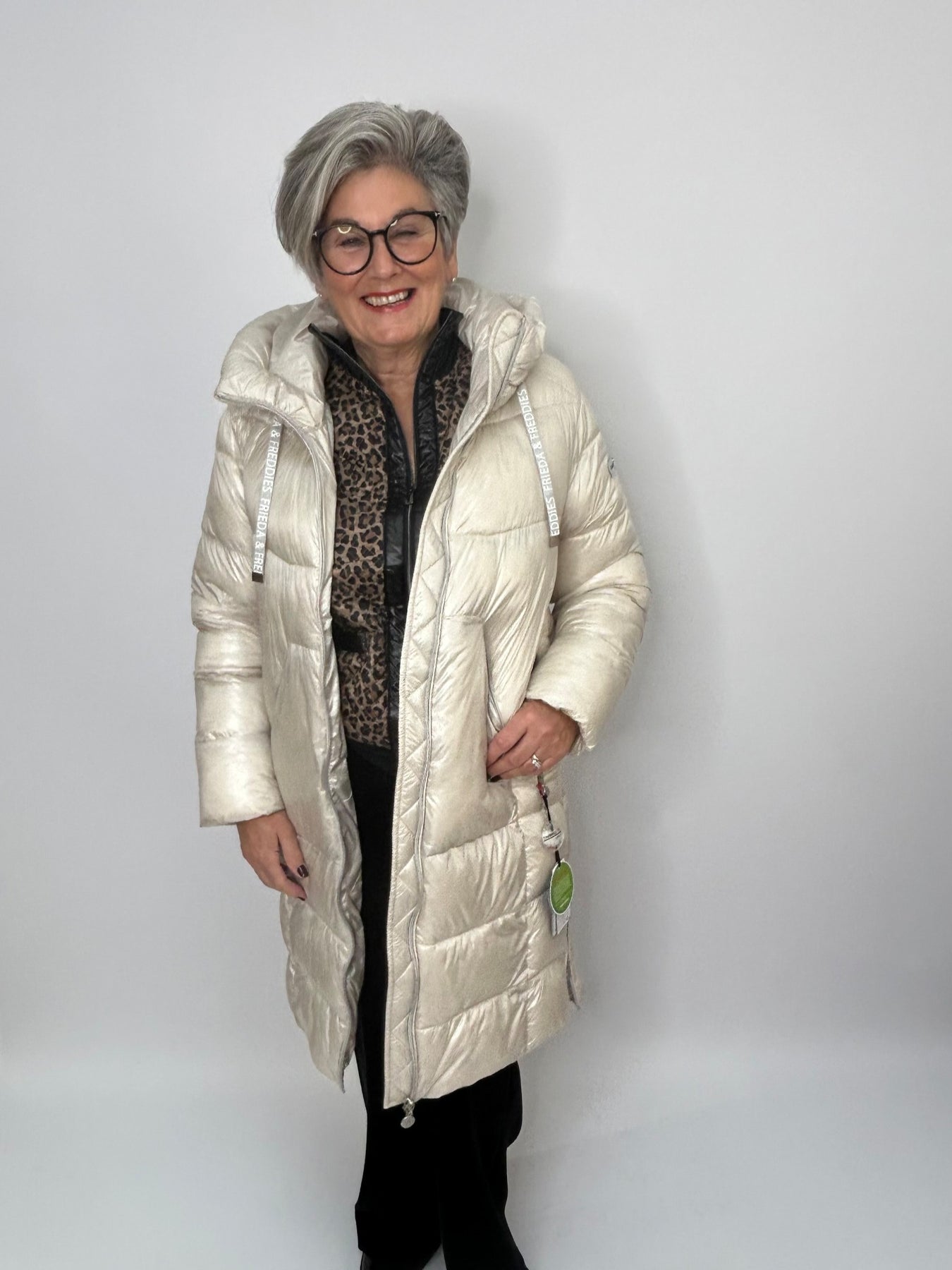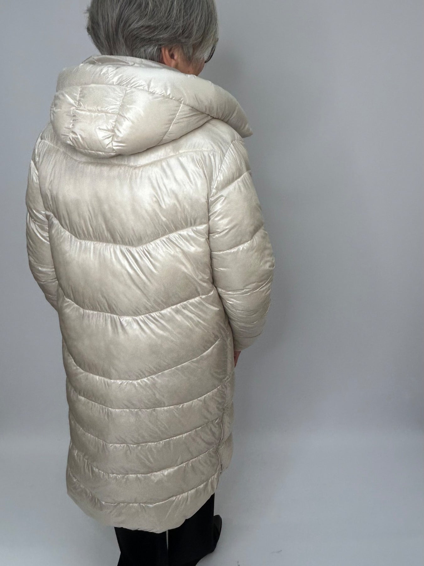 This is a brilliant white coat, perfect for staying warm in the cold and wet weather. This is a great coat with its neutral colour you can wear it with any colour. This coat features a hood, long sleeves, long in length, drawstring through the hood, two side pockets, a zip on the side to open for more room and a zipper to fasten.