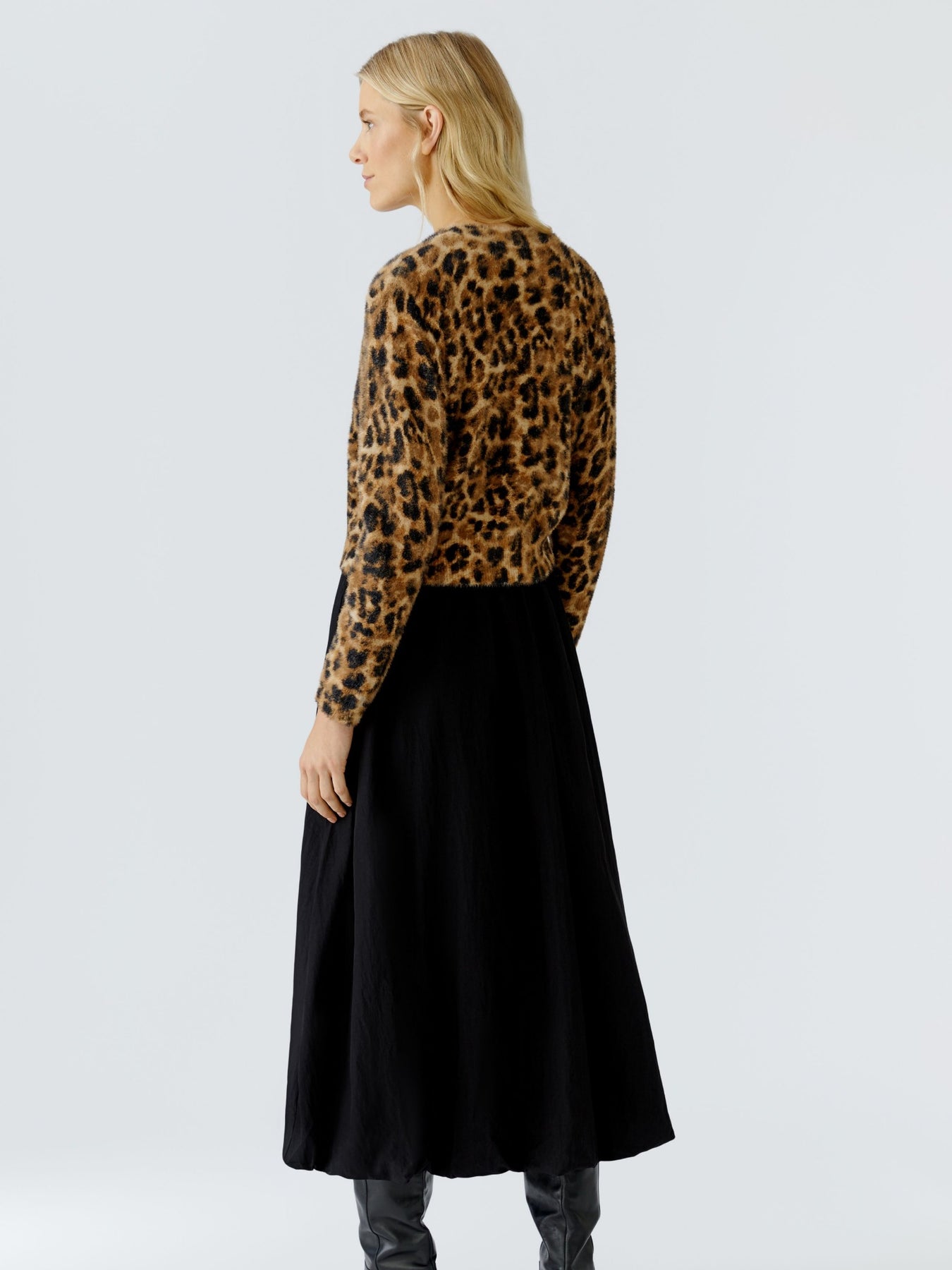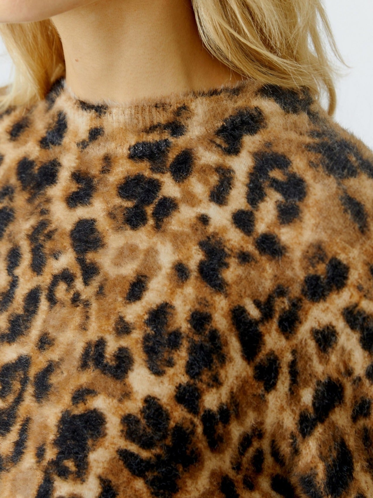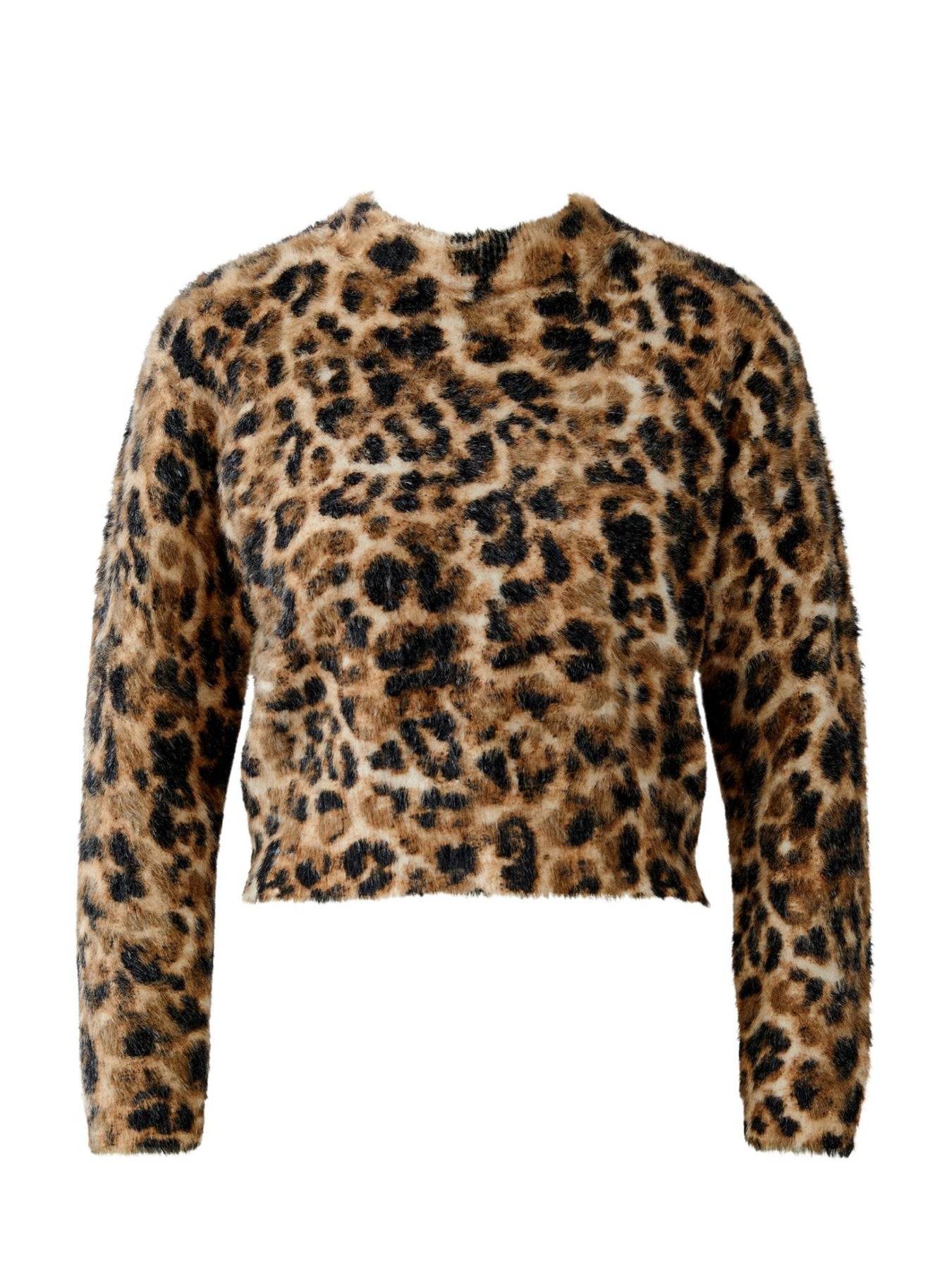 Regular price £129.95This is a fabulous leopard print sweater, in a modern shape like small or short. However the shape and style goes perfect with dress, high waisted trouser and wide leg trousers. This features fur yarn on the outside, high-quality bonded with a smooth viscose blend on the inside, printed with a leopard print all over, slim fit, in cropped length, short, double stand-up collar in fine rib, narrow, straight long sleeve and all cuffs are knitted tighter and printed all over.