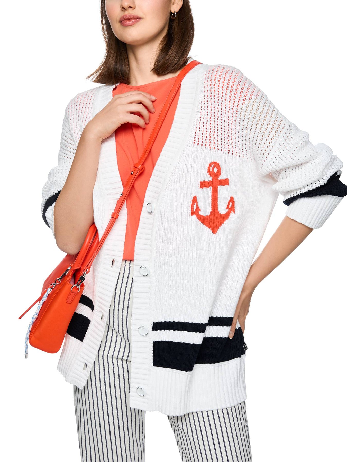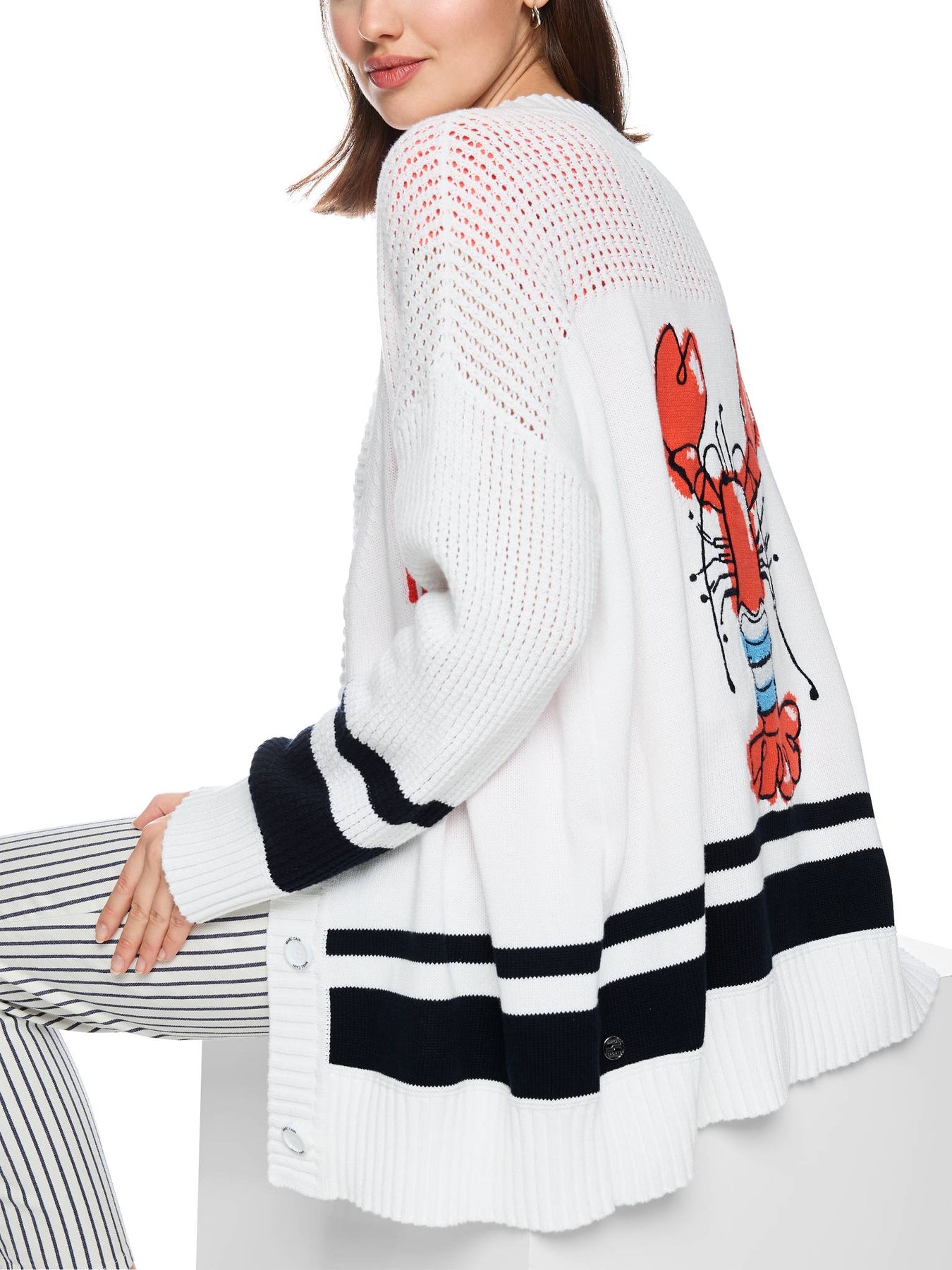 Oversized cardigan, Wide-cut cardigan in a trendy oversized style with a nautical look. The shoulders are dropped and the upper part of the cardigan features a lace knit pattern. There are dark blue stripes at the bottom. The highlight is the large lobster embroidery on the back. The cardigan is made of cotton and is therefore pleasantly soft and comfortable to wear. The jacket fastens with a button placket. Wide shape, Maritime print, Button placket, With embroidery. The model is 179 cm tall and wearing size N3 / UK 12.