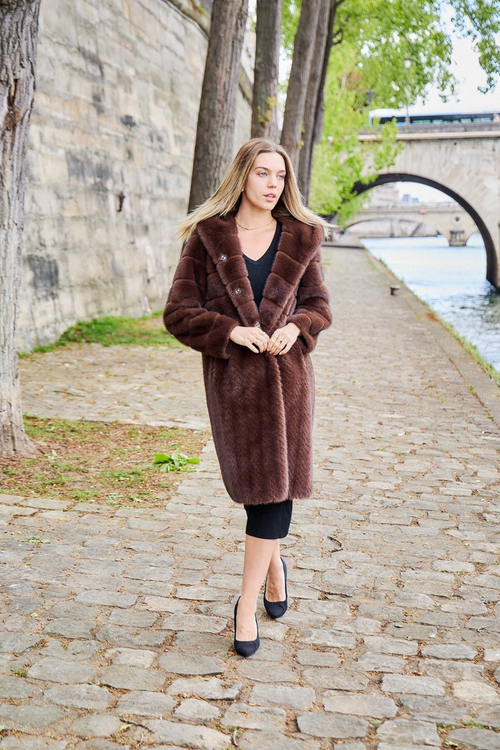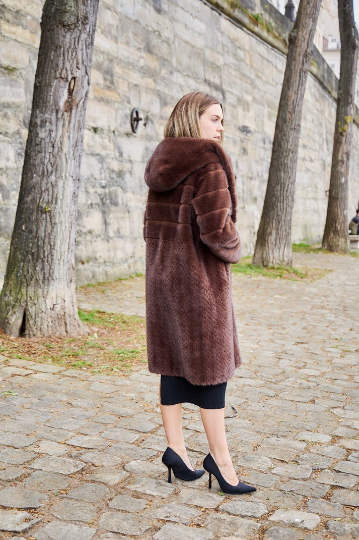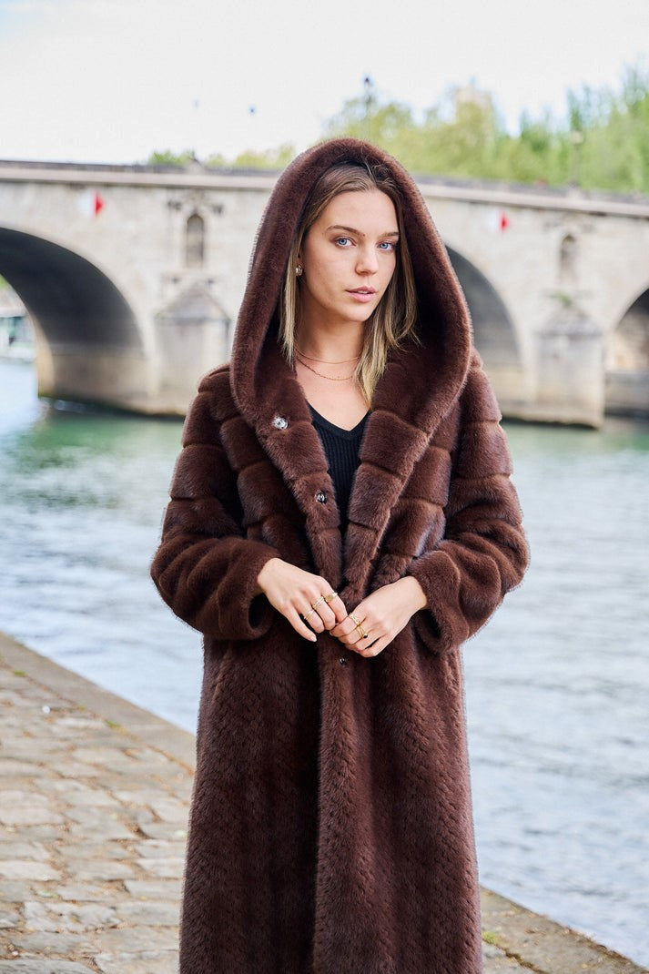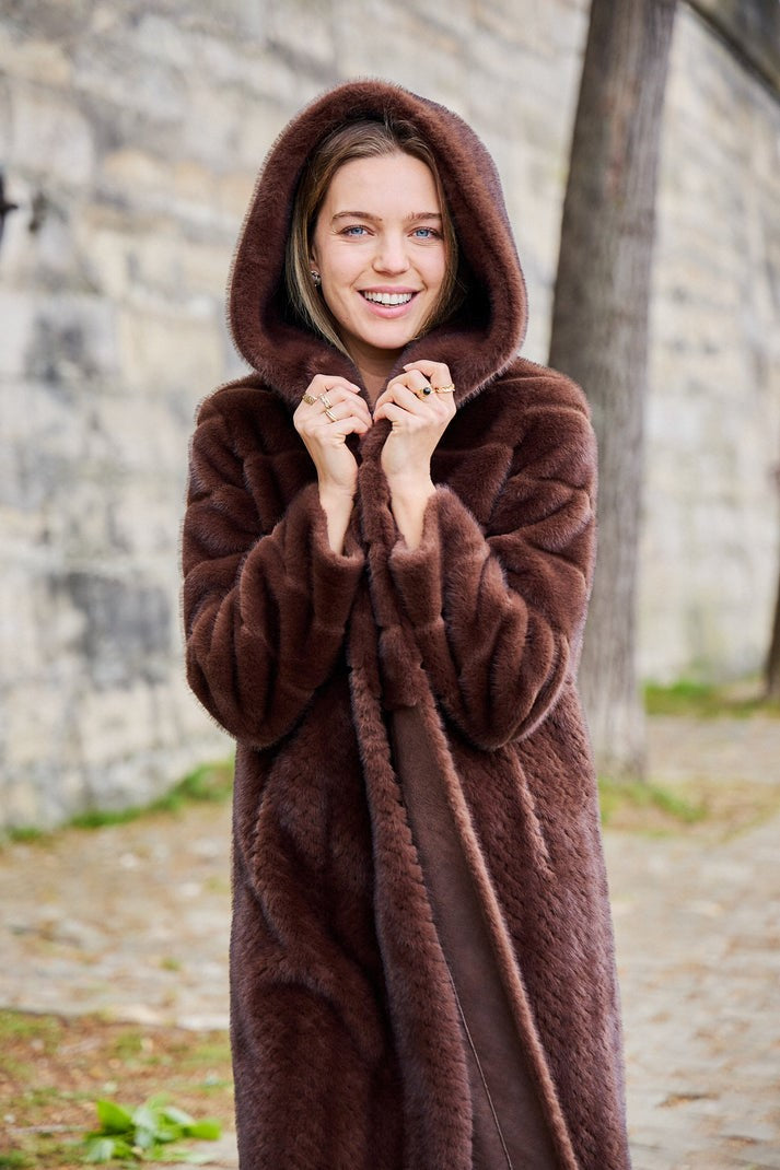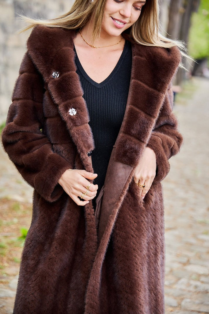 Regular price £215.00The Liz coat seduces with its elegant length and flowing cut. Perfect for facing cool temperatures, it adds a touch of refinement to any outfit. This coat features a snap closure, a wraparound hood, long sleeves, long straight cut and faux fur effect fabric.
