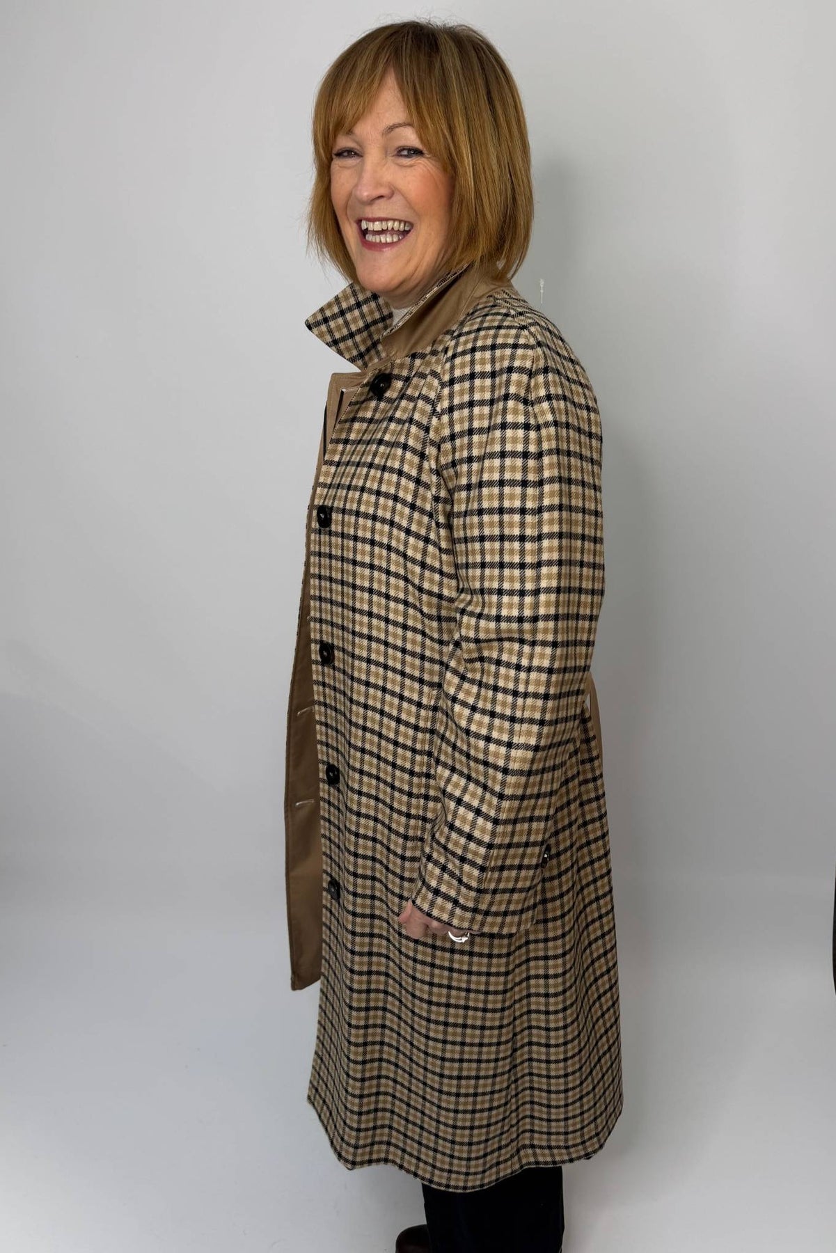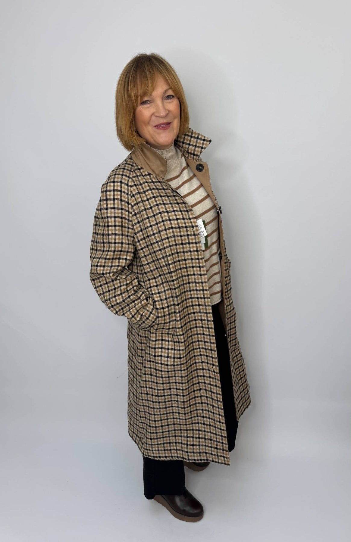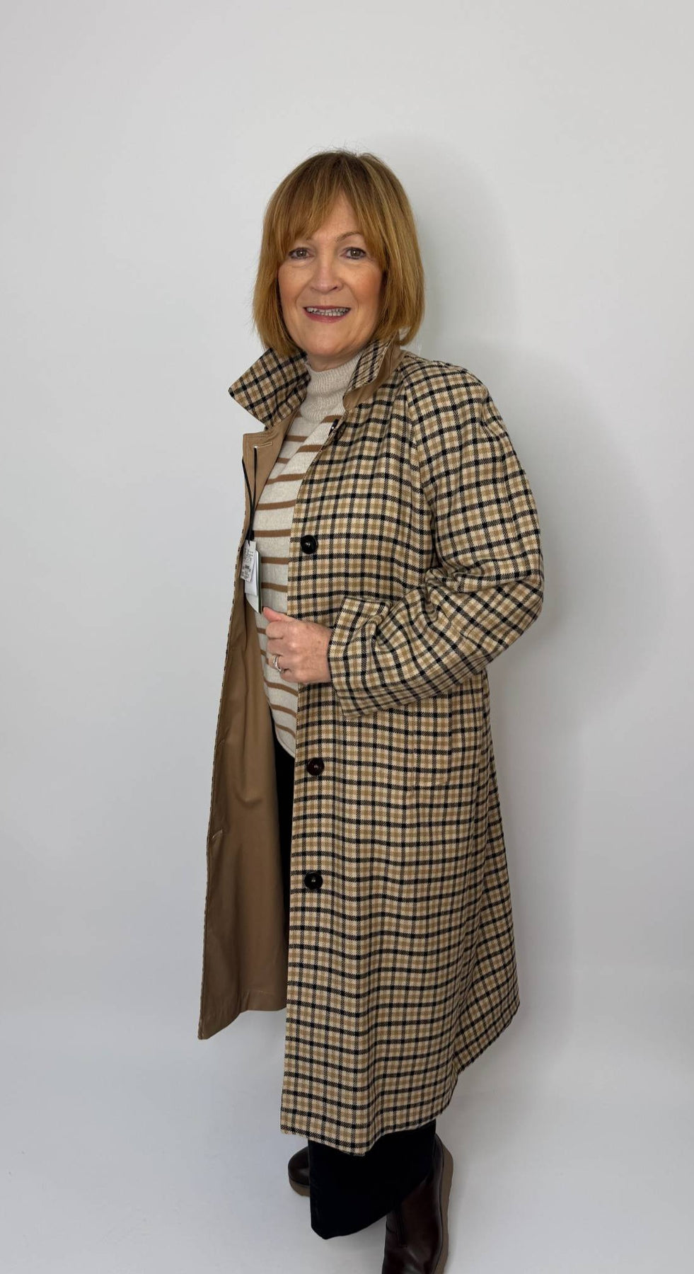 Regular price £355.00This gorgeous Marella trench coat is a lovely line, with black buttons down the front and, belt detail. Reversible coat with this fabulous check look.