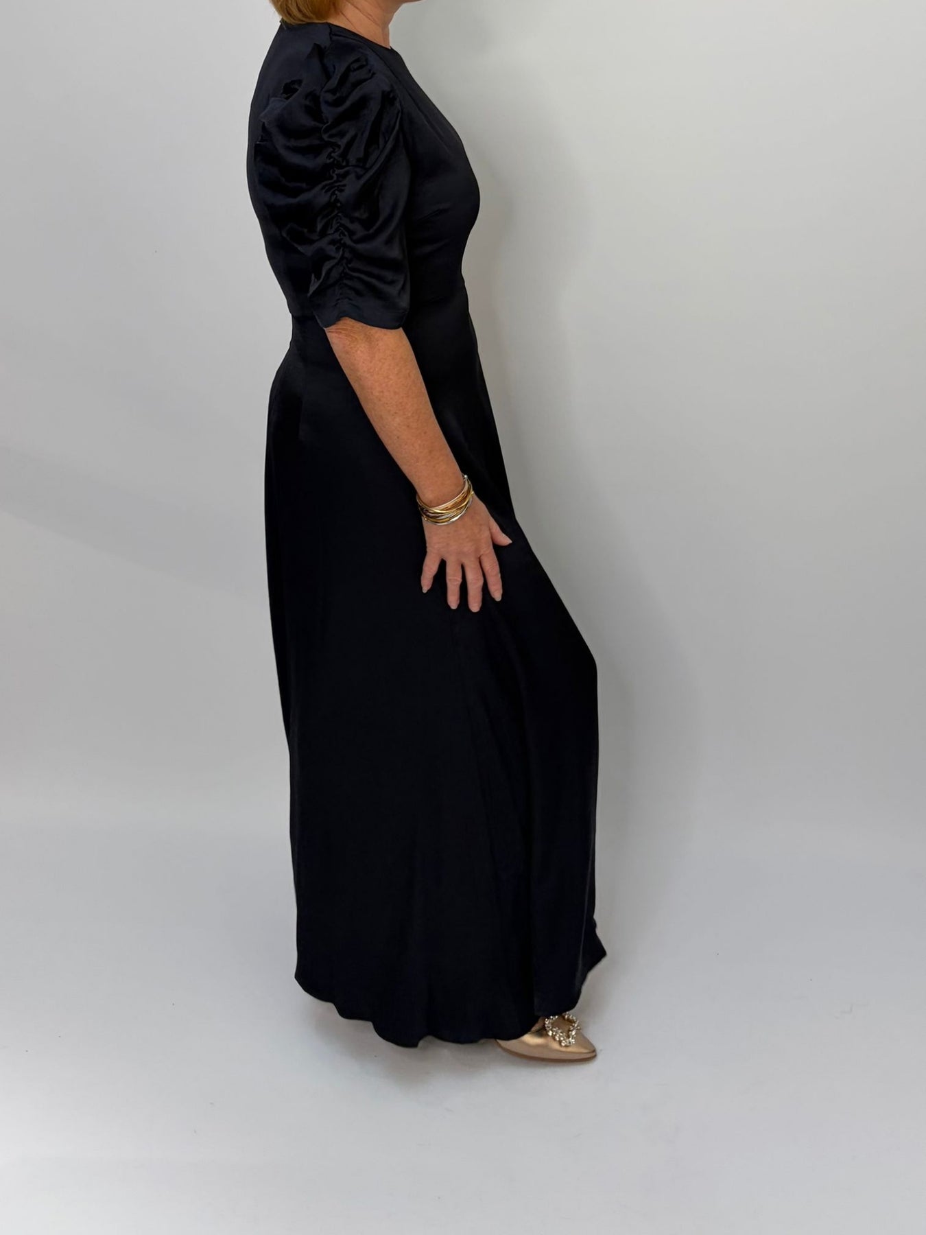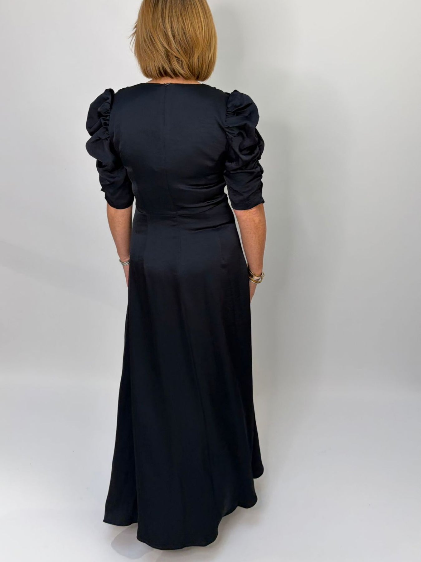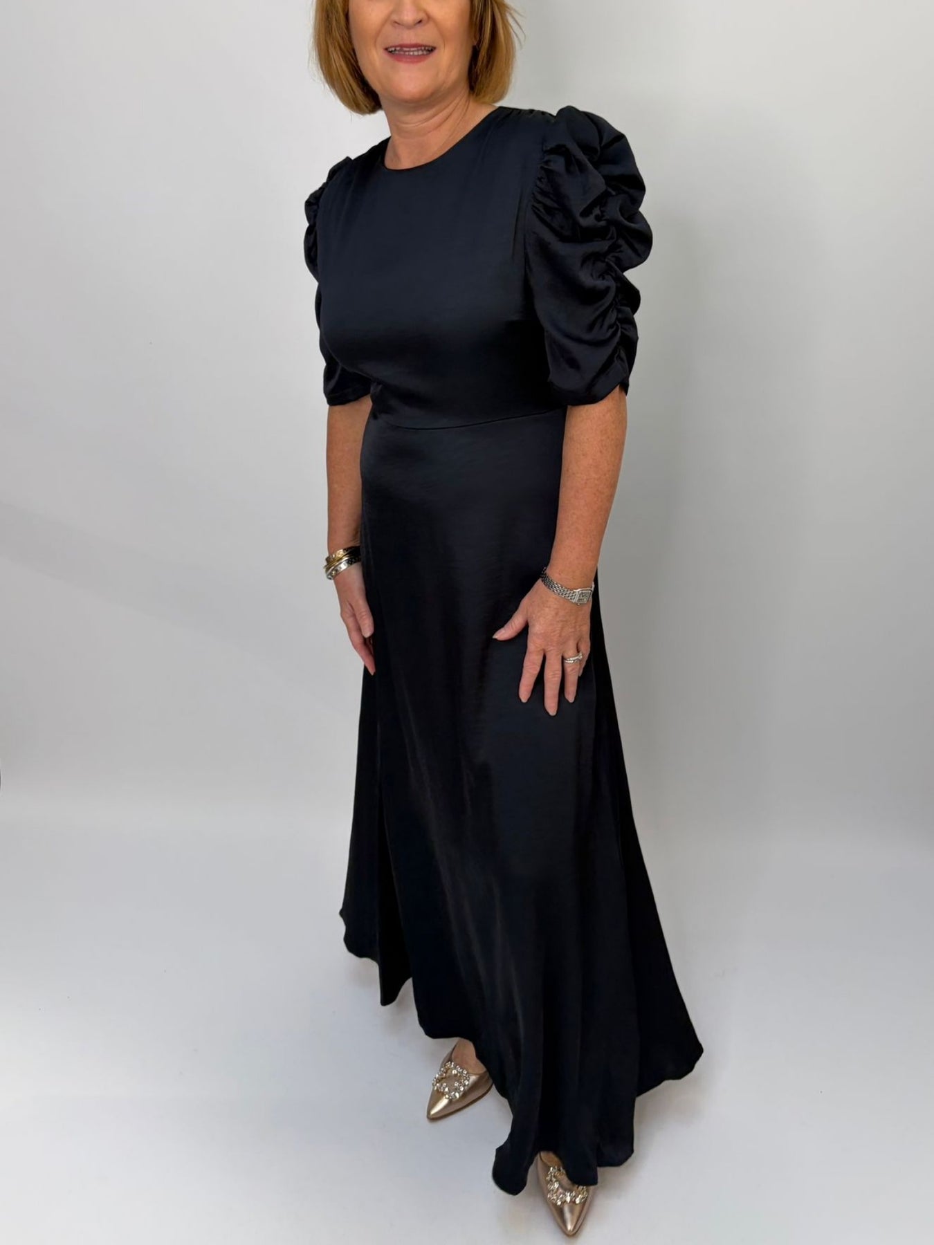 Regular price £89.95The is a lovely navy satin style dress. This is perfect for a formal event or a wedding. This dress has a round neck line, puff sleeves, full length, ruffle on the puff sleeve. This dress is slightly neat so we recommend sizing up.