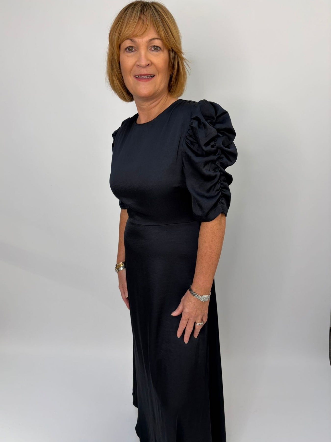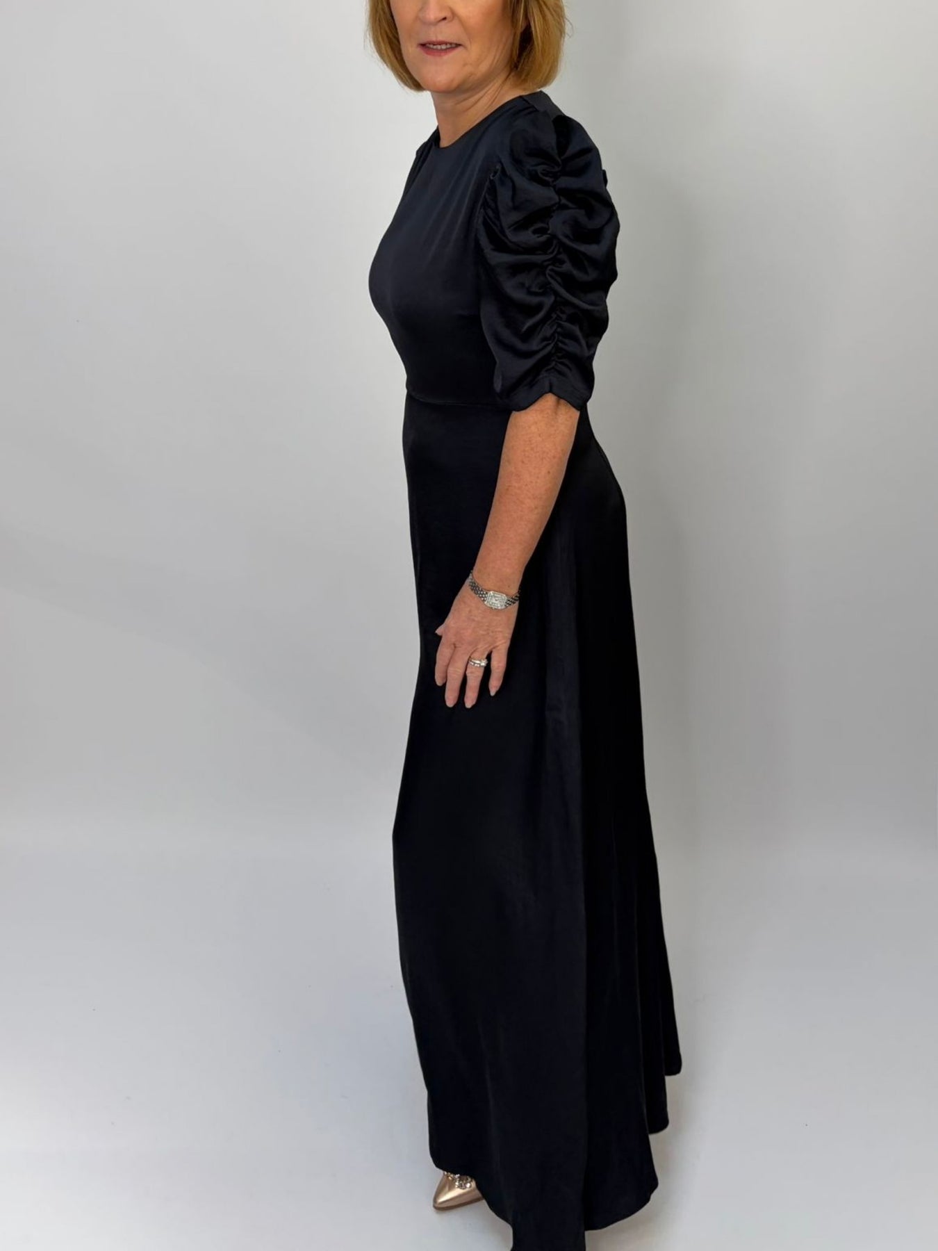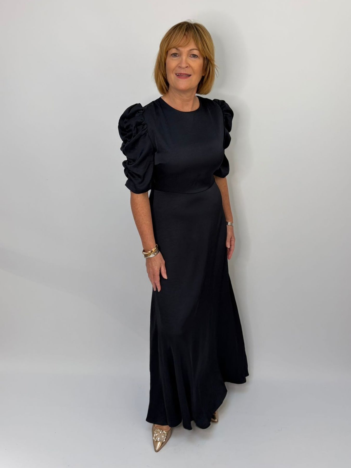 Regular price £89.95The is a lovely navy satin style dress. This is perfect for a formal event or a wedding. This dress has a round neck line, puff sleeves, full length, ruffle on the puff sleeve. This dress is slightly neat so we recommend sizing up.