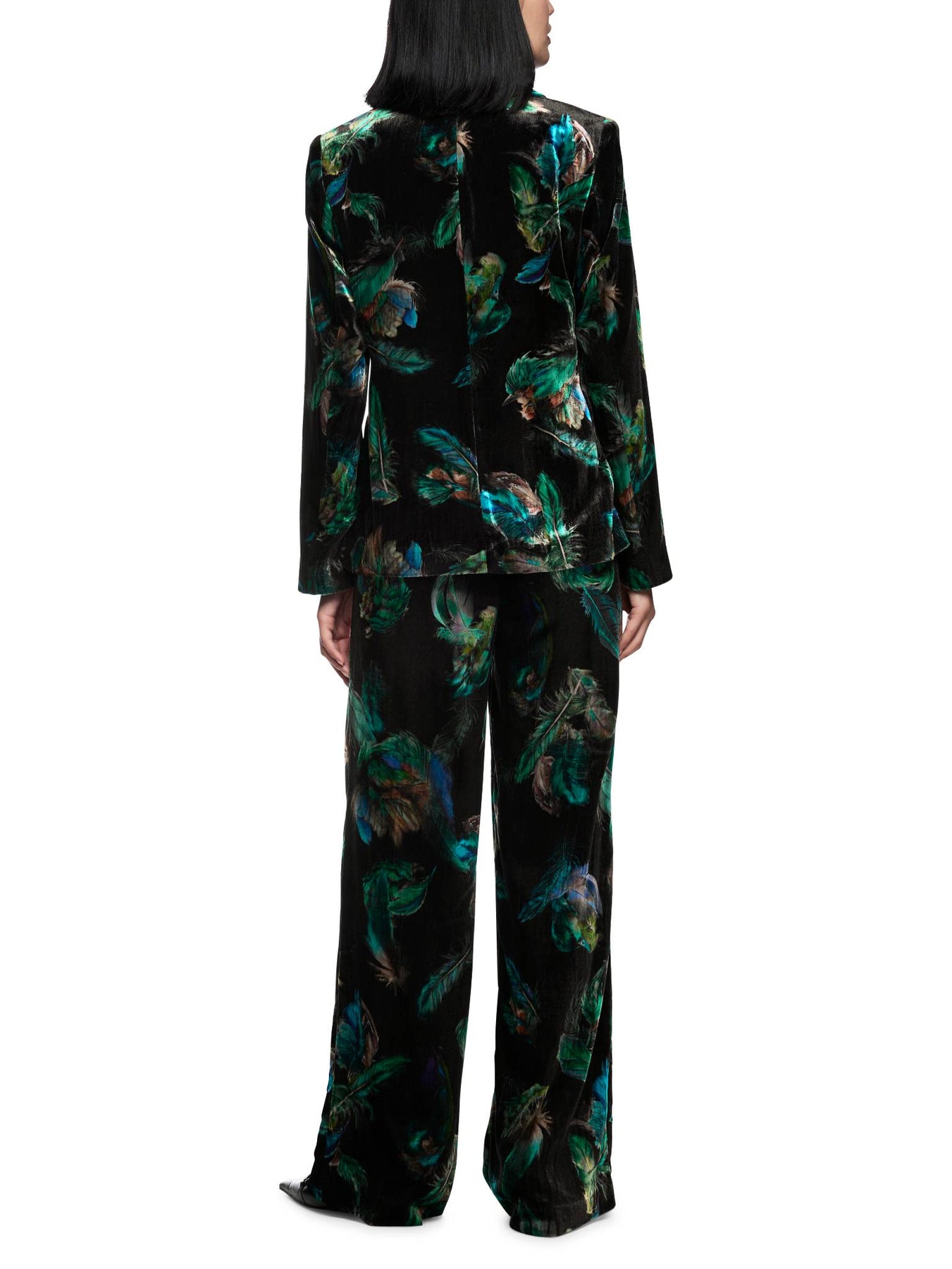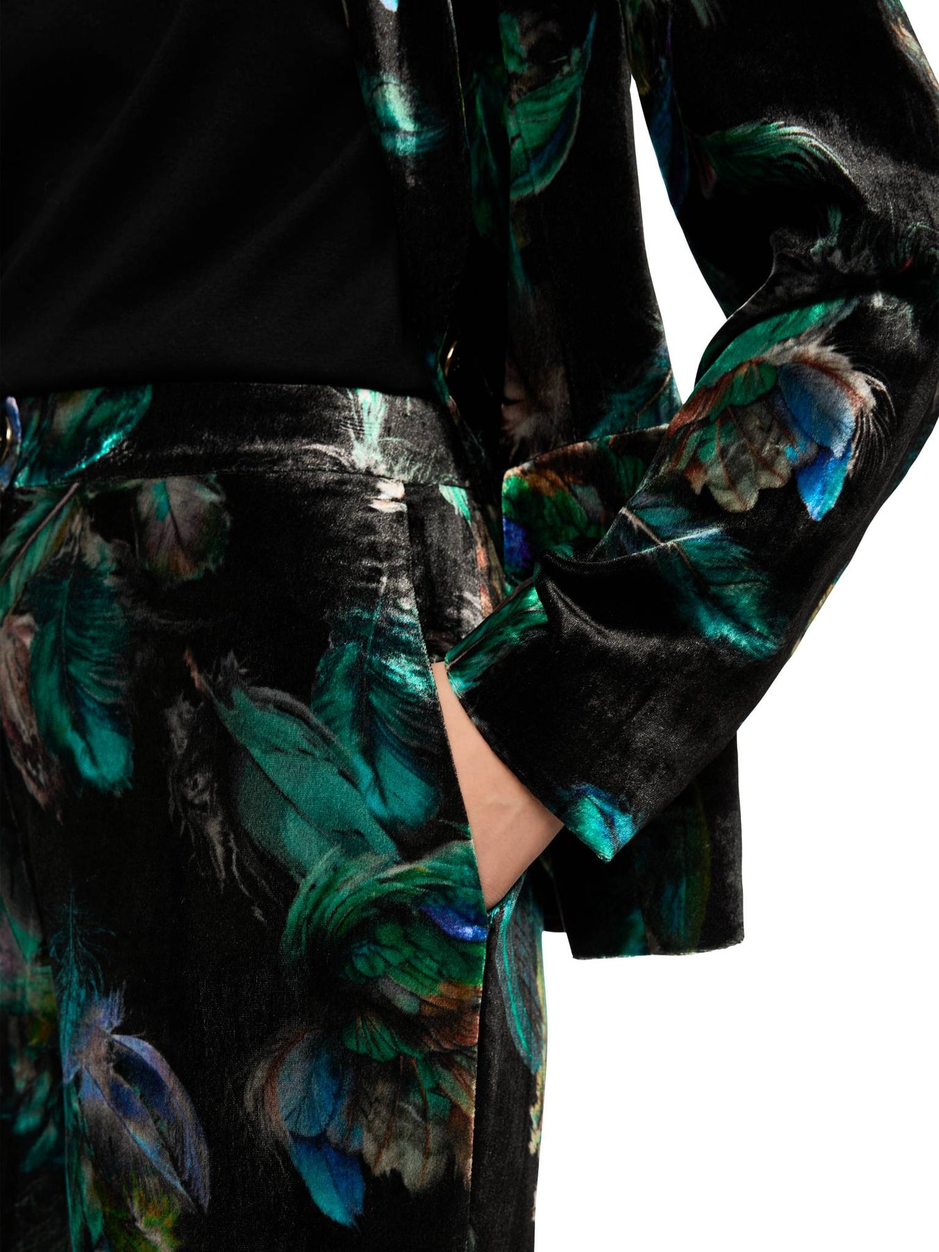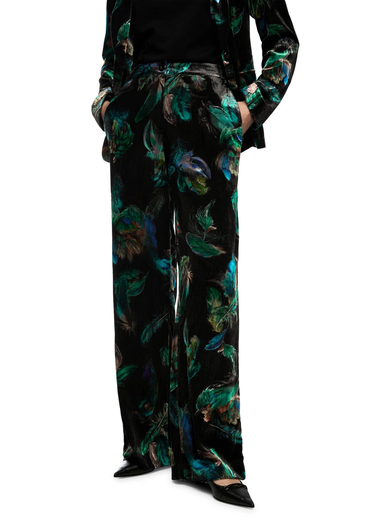 WARRI velvet trousers with print. The WARRI are an elegant pair of trousers made from soft velvet with a mystical feather print. The wide cut and high waistband create an elegant silhouette. With slanted side pockets, a button and a zip for optimal comfort. A statement piece for style-conscious looks. Wide cut, High waistband, Without belt loops, WARRI - WIDE FIT - HIGH - Leg length: 34