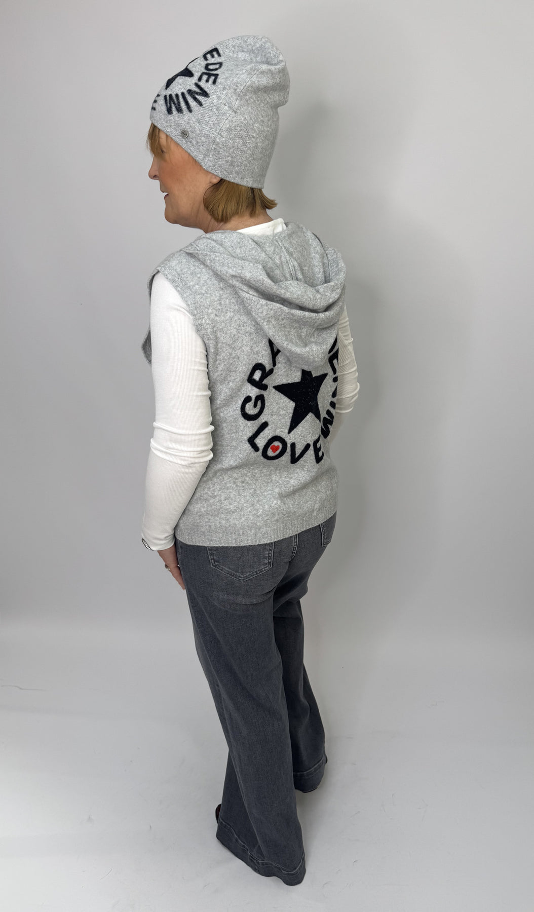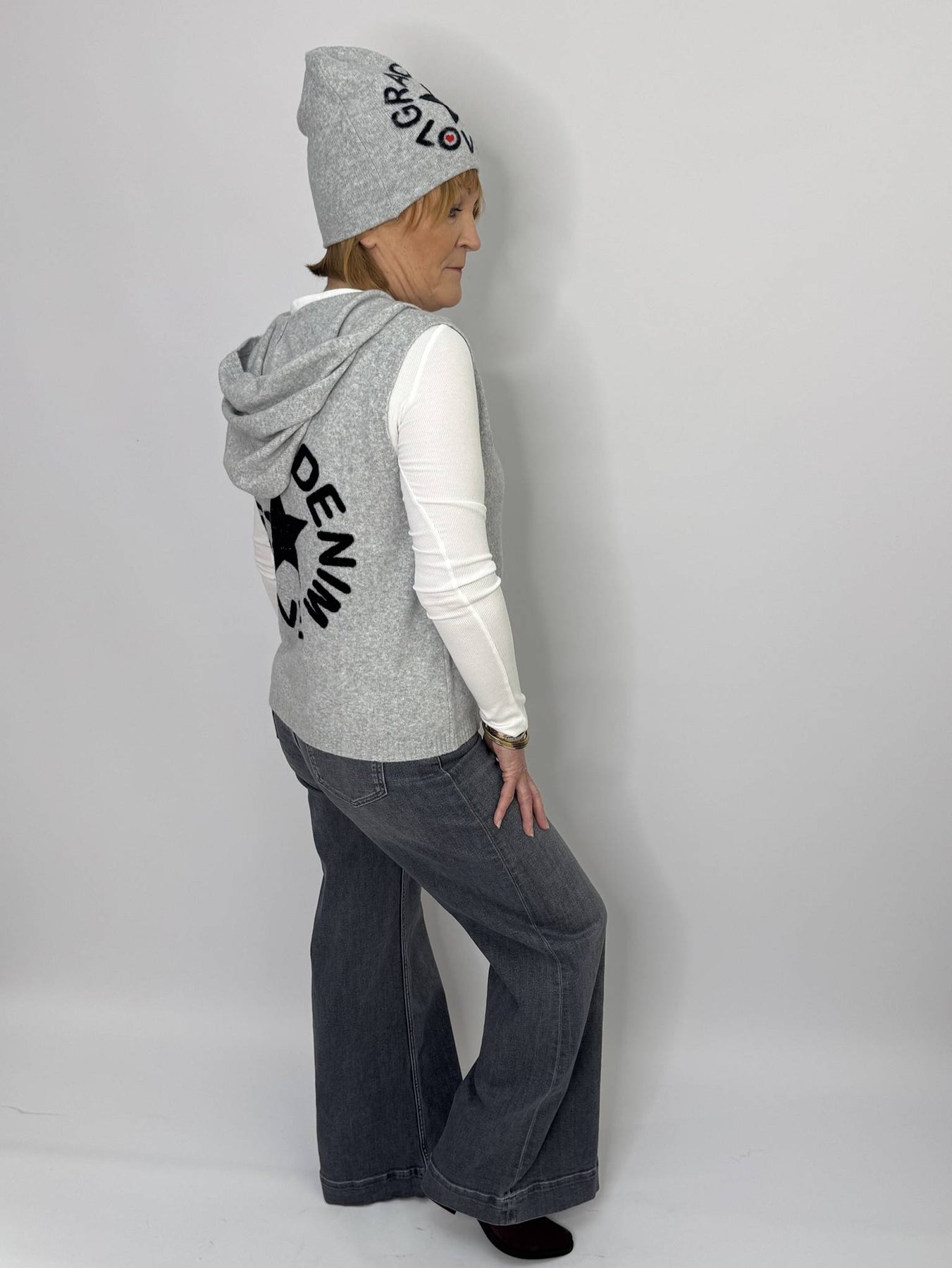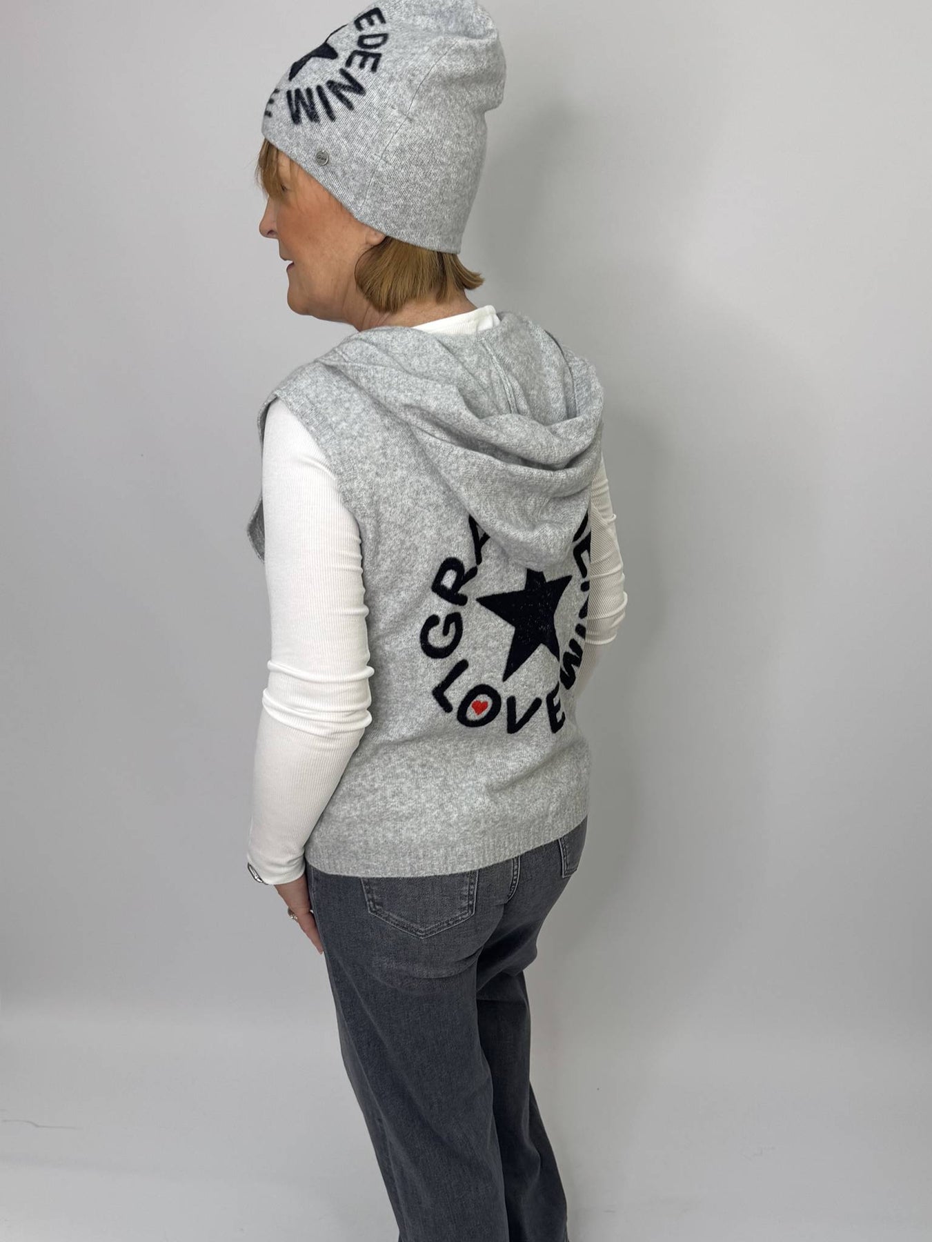 Grace sleeveless, hooded zip-up sweater. Grace was writing on the back. Perfect for layering over a crisp white shirt.