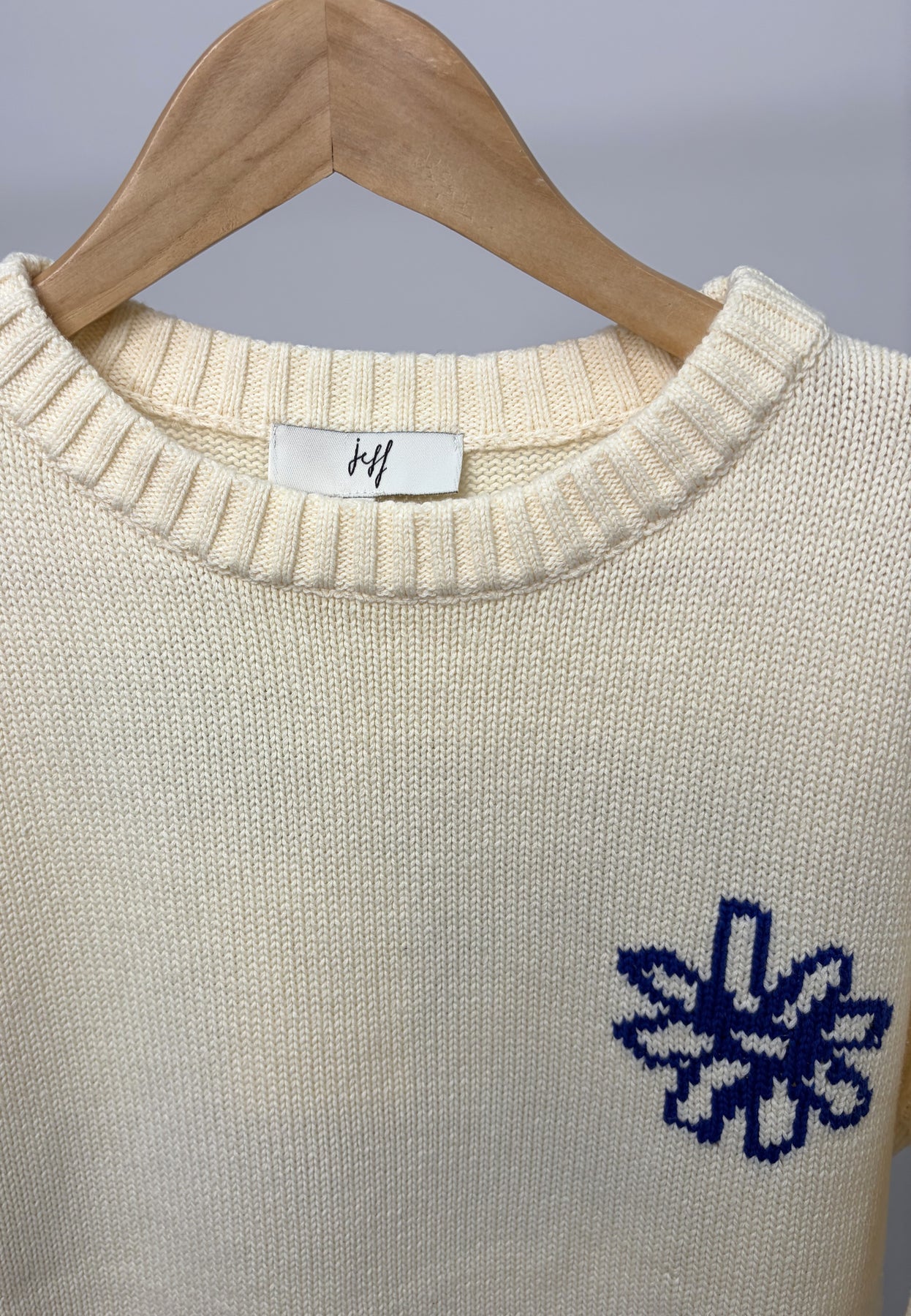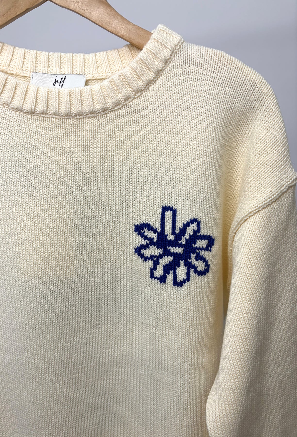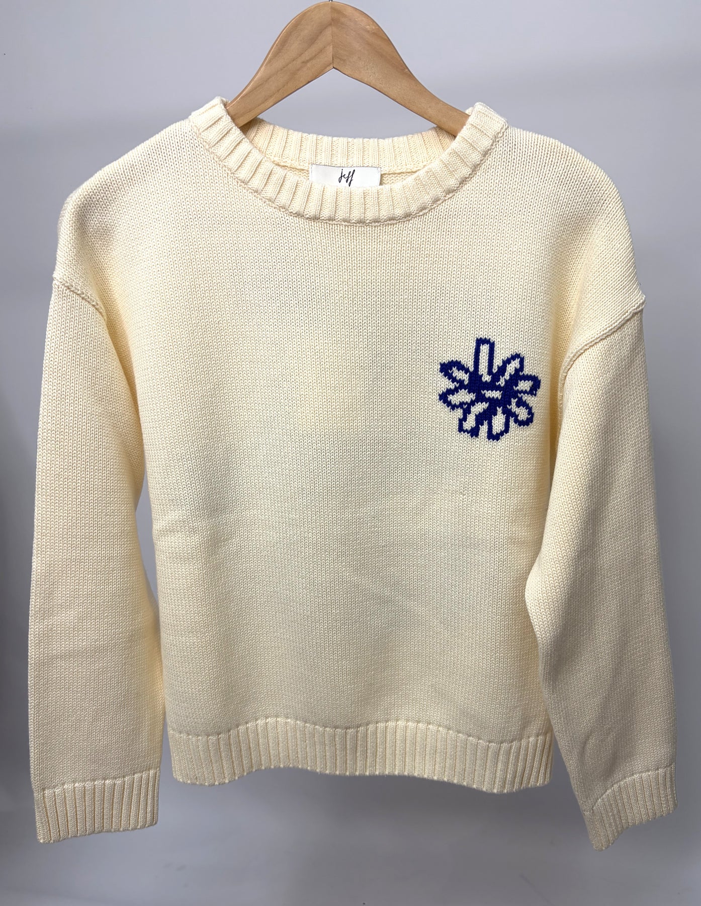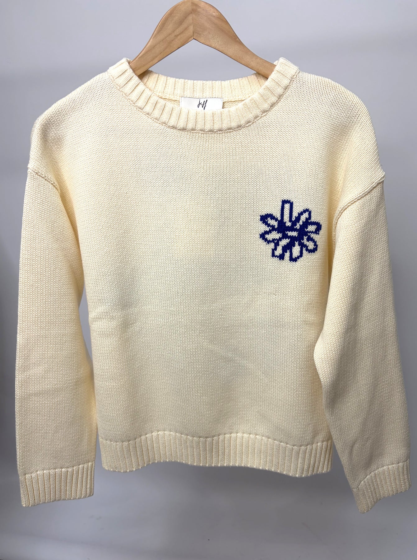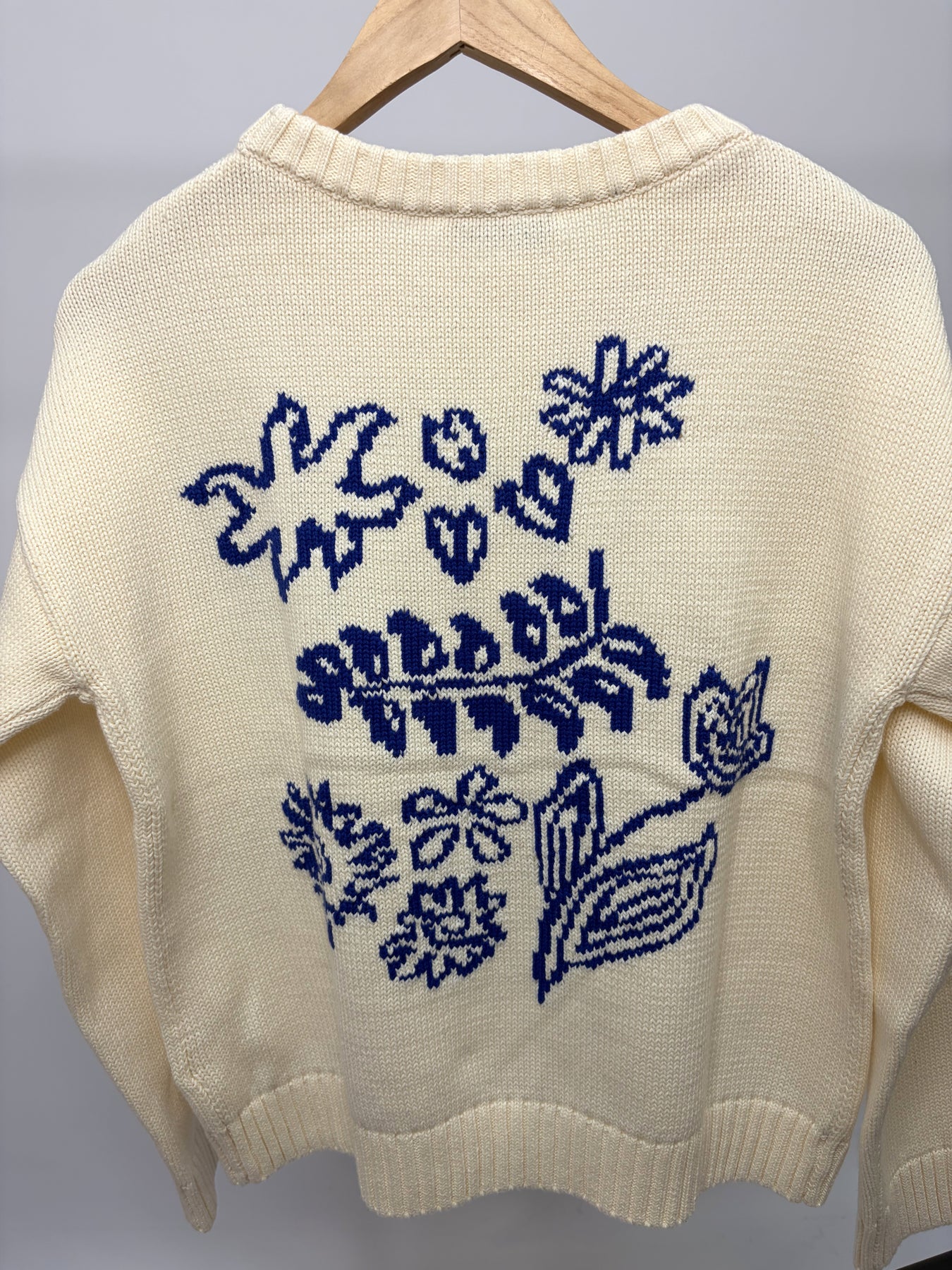This is a gorgeous cream Jeff sweater with blue print floral on the back. These are such a comfortable jumper, perfect for the early springtime.