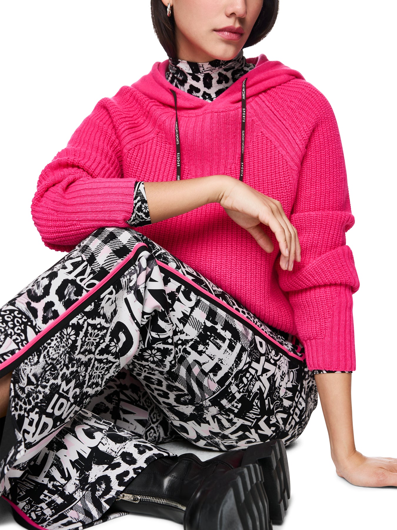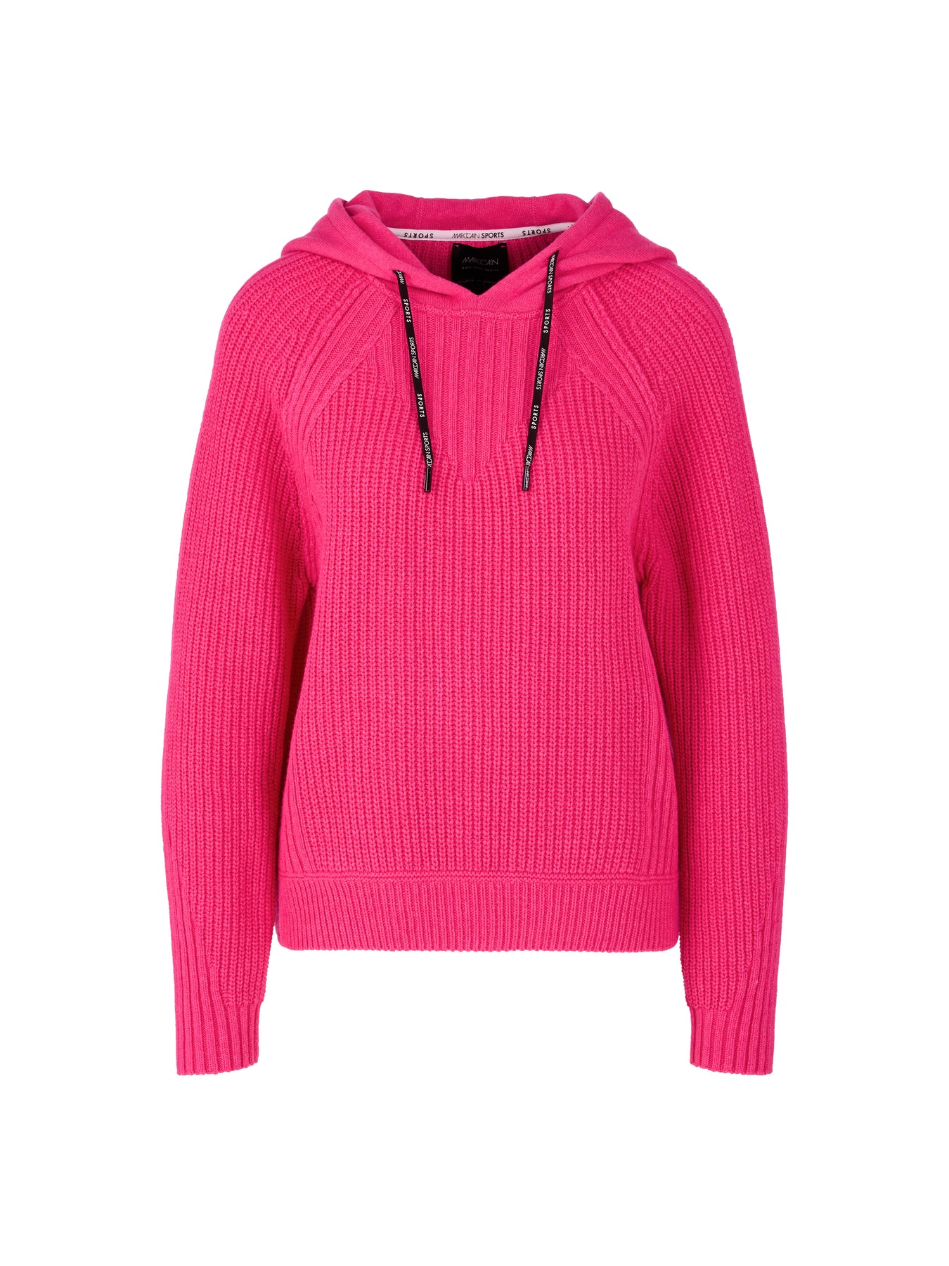 Regular price £355.00Knitted in Germany hooded jumper, This casual hooded jumper has a loose fit with raglan sleeves. The hood has a drawstring with Marc Cain Sports lettering. This jumper is Knitted in Germany: the yarns are knitted on state-of-the-art knitting machines and the materials are finished in Germany. The individual parts, such as the sleeves and front, are sewn together at European partner companies. Loose cut, Knitted in Germany, Hood with drawstring and Long sleeves.
