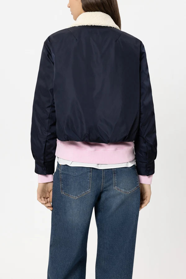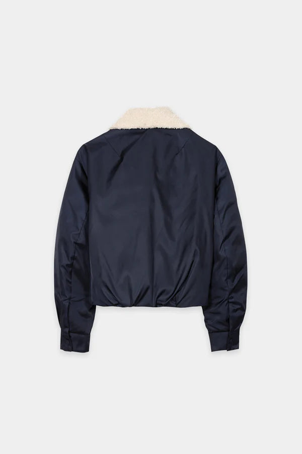 Reversible blouson made from soft, subtly iridescent outdoor satin with a lined front zipper, two side pockets and an adjustable hem. The jacket has a detachable faux fur collar and is filled with real down. The inside is quilted for an alternative wearing option.
