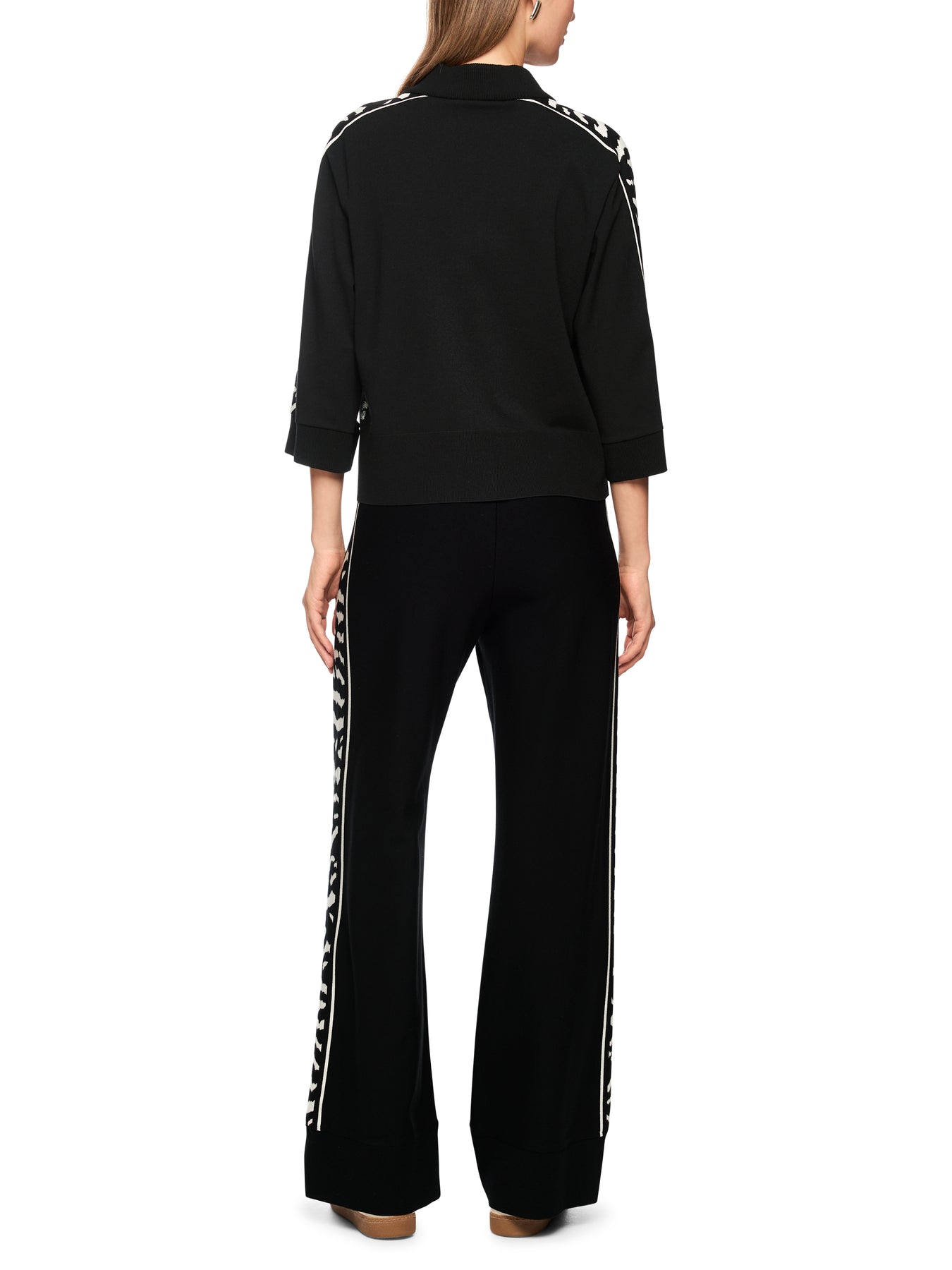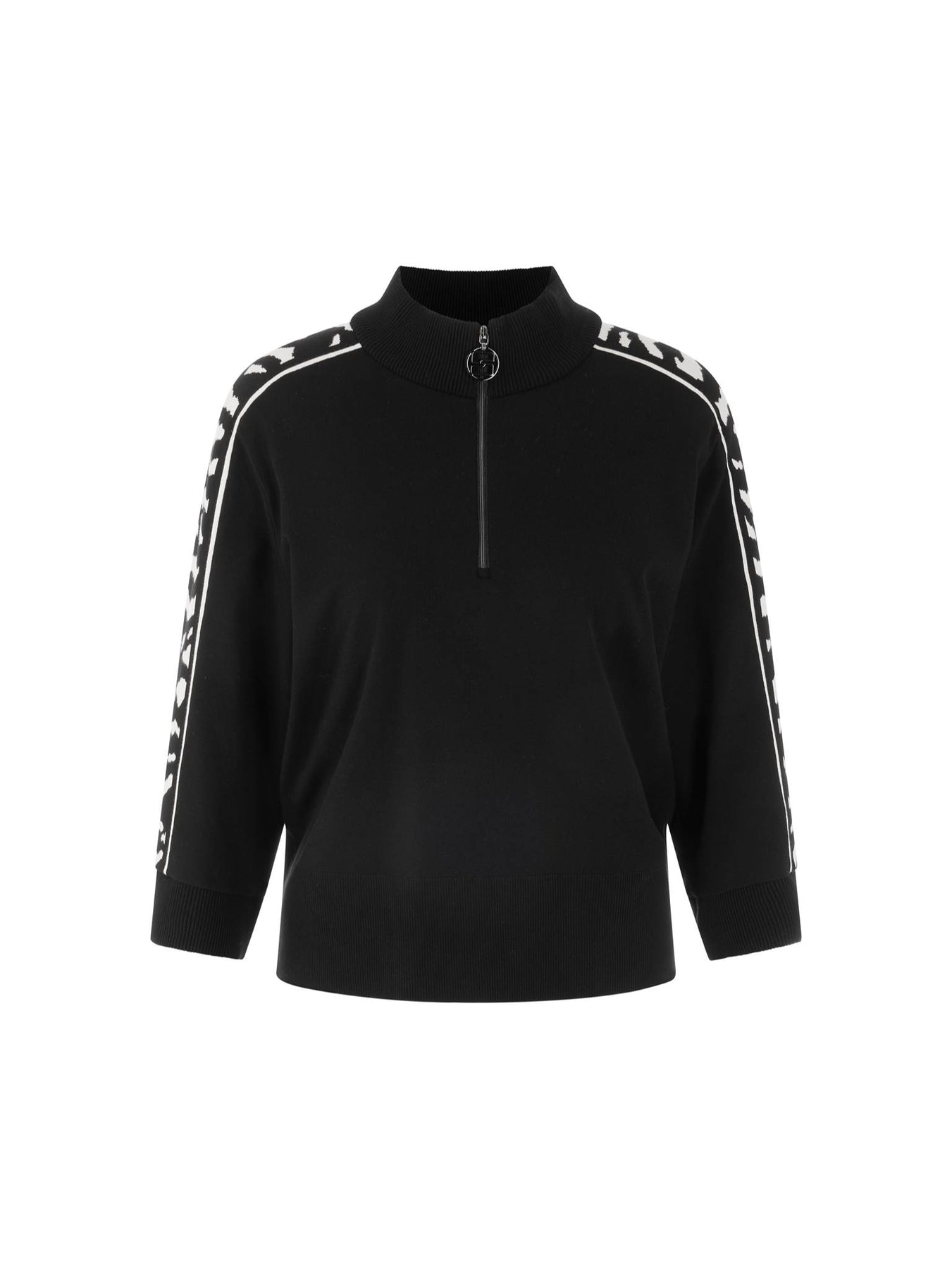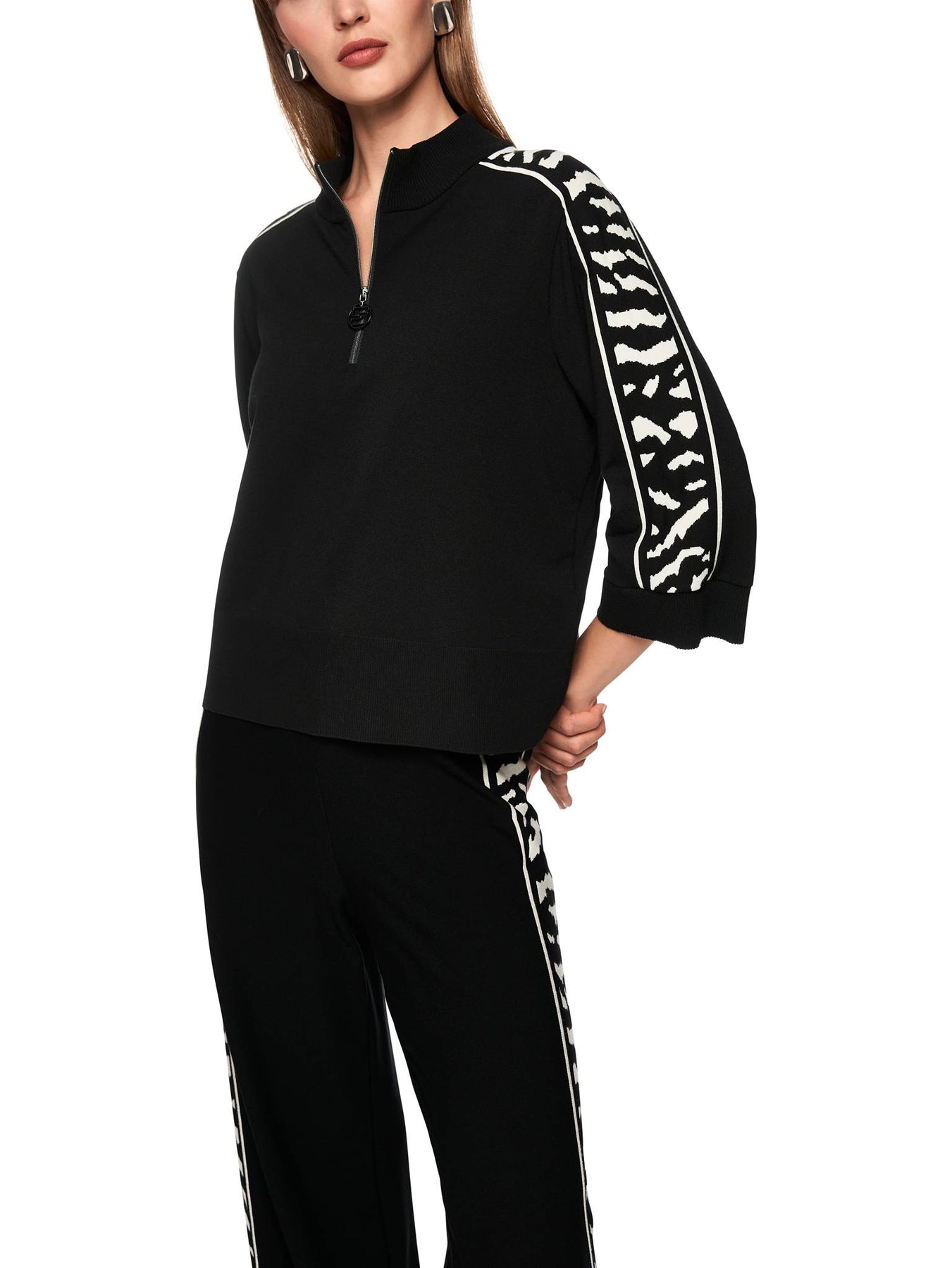 Regular price £305.00This jumper impresses with its wide shape and wide 3/4 sleeves. A highlight: the wide contrasting stripe in an animal design that adorns the sleeve. The collar and hem feature wide ribbed cuffs, and there's a zip at the front of the neck, allowing the jumper to be worn open. This garment is made responsibly and from the ‘Rethink Together’ sustainability label.