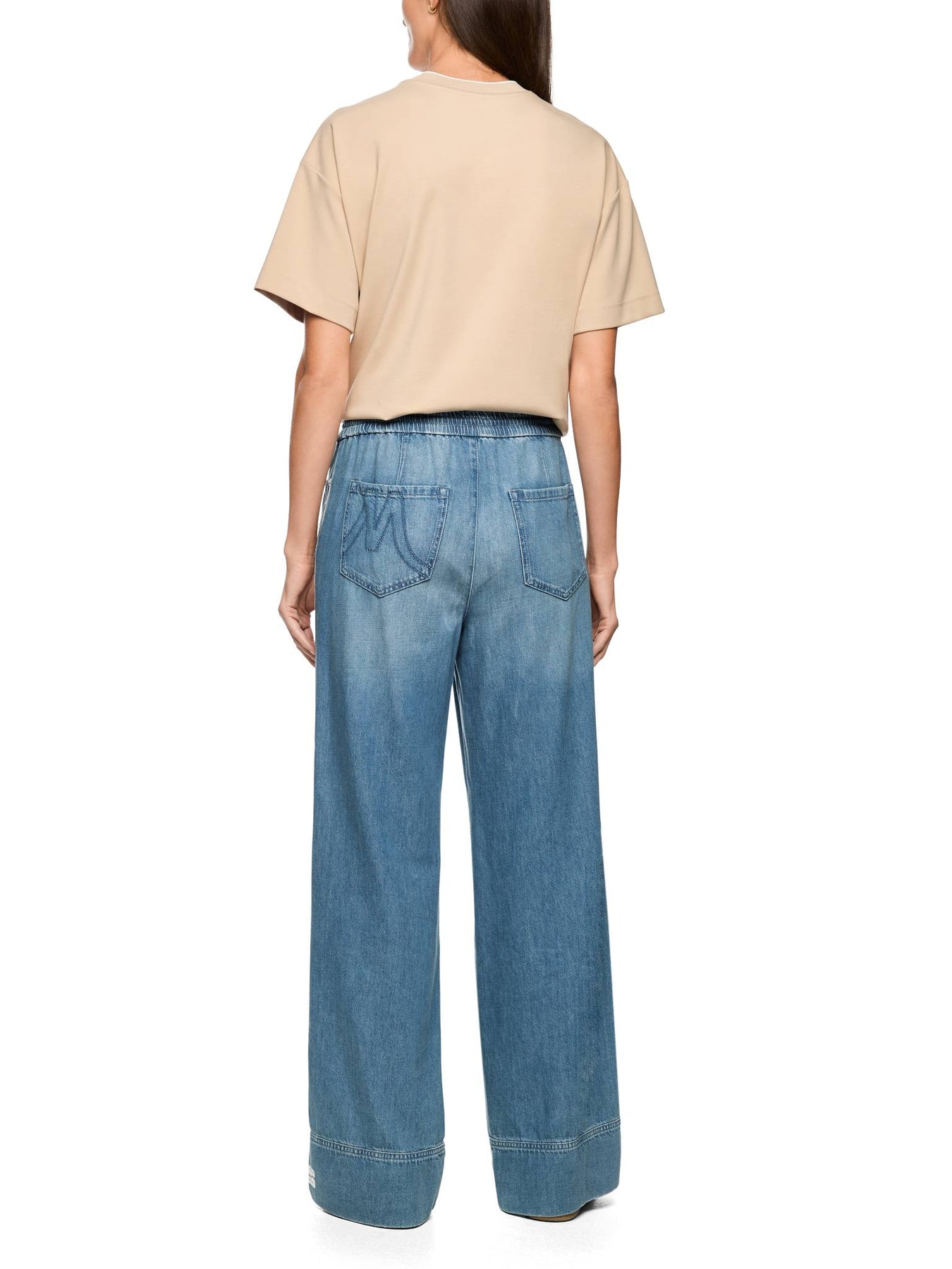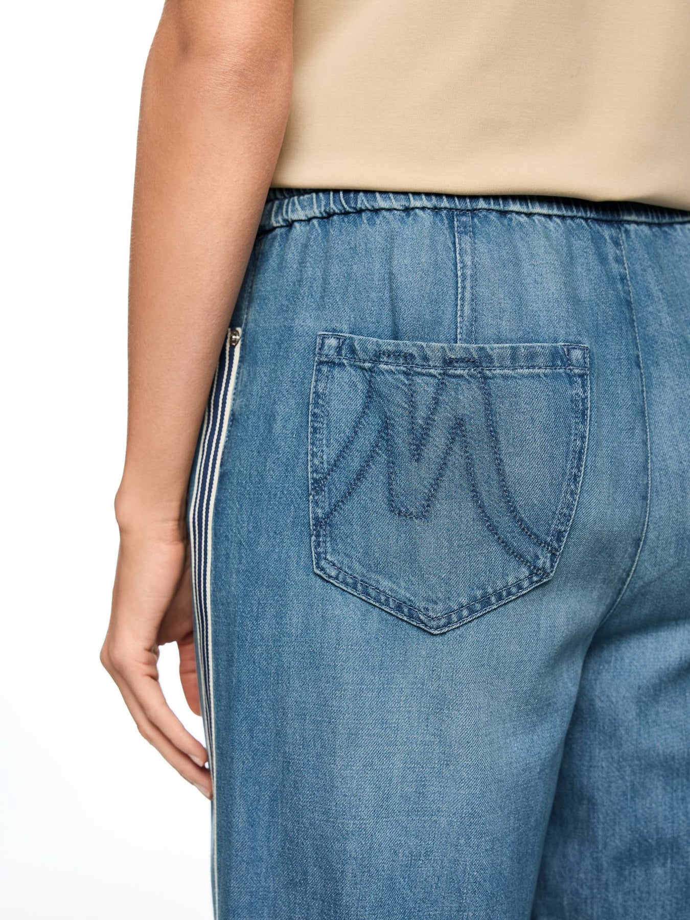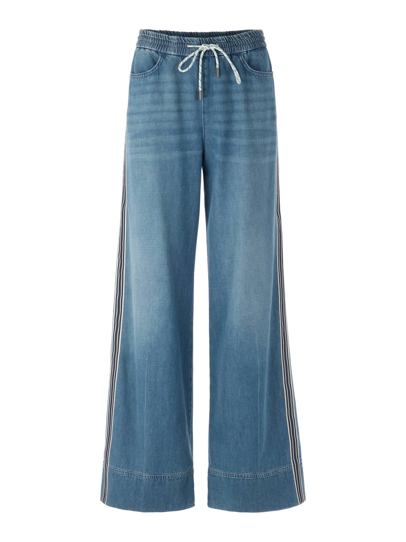 Regular price £229.00Gorgeous Marc Cain denim wide-leg jeans, cool, funky stripe down both sides of the legs. Lovely sparkle belt detail around the waist.