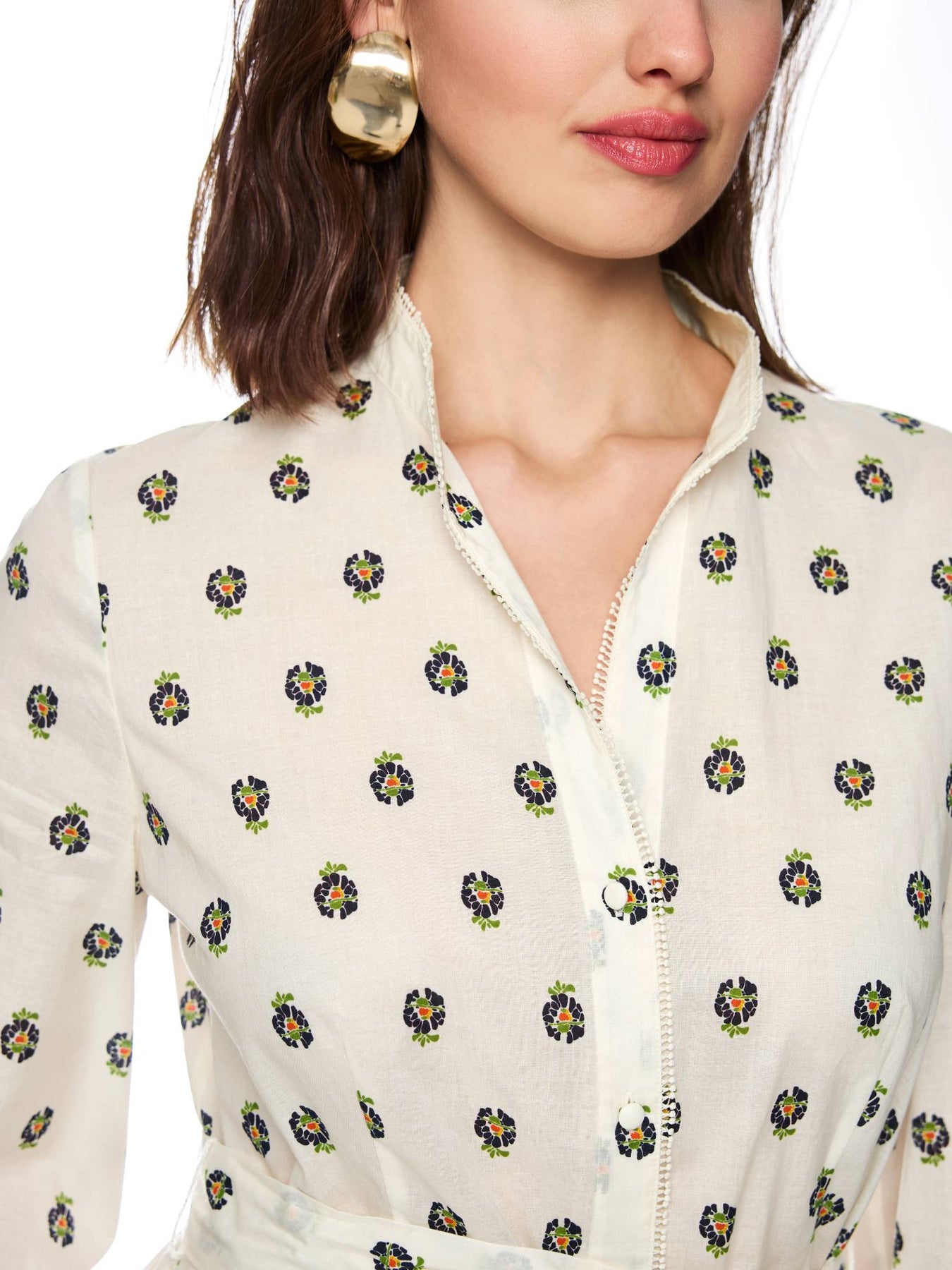 Regular price £355.00Printed cotton dress, Light maxi dress made of pure cotton with a delicate floral print. The flared skirt, tie belt to accentuate the waist, while the openwork and lace details emphasize the feminine look. A small stand-up collar, the full row of buttons and contrasting edges complete the design. Flared skirt, Side pockets, Full-length buttoning, Without inner lining. The model is 179 cm tall and wearing size N3 / UK 12.