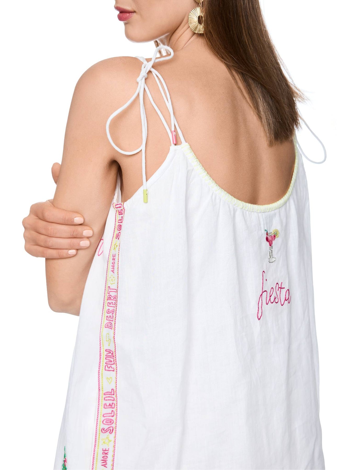Regular price £365.00Sleeveless midi dress with embroidery|This sleeveless midi dress is made from natural ramie material, which is breathable, particularly cooling on the skin and retains its shape. The colourful embroidered patches in a desert fiesta theme stand out particularly well against the white background. The neckline and hem are finished with contrasting decorative stitching. A flounce at the hem adds a playful touch. The thin straps feature coloured cord stoppers. Perfect for summery looks with a light feel.|Loose cut|Colourful embroidered patches|With lining|Airy feel|The model is 179 cm tall and wearing size N3 / UK 12.
