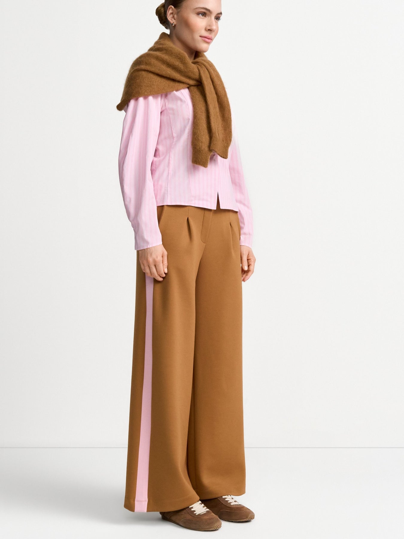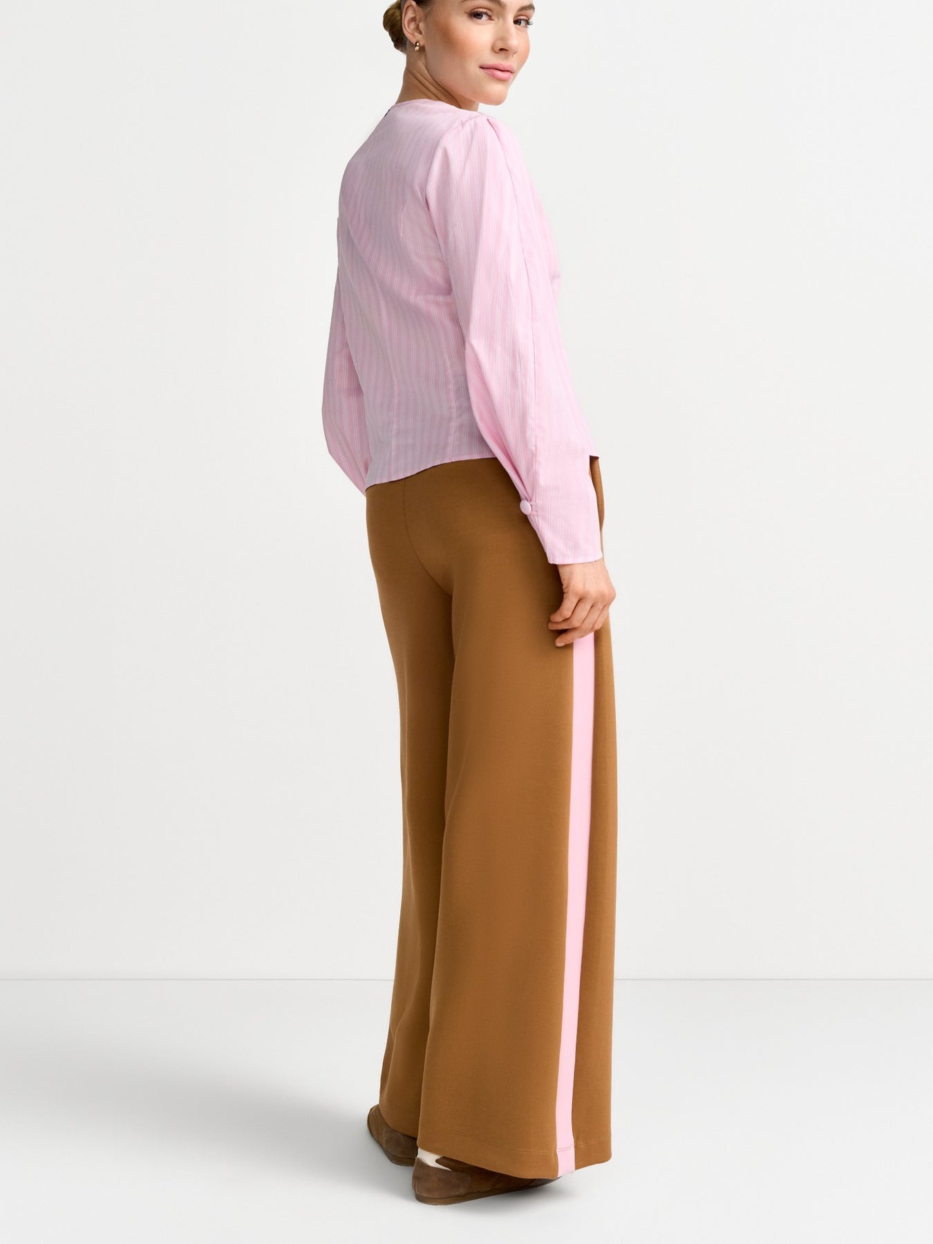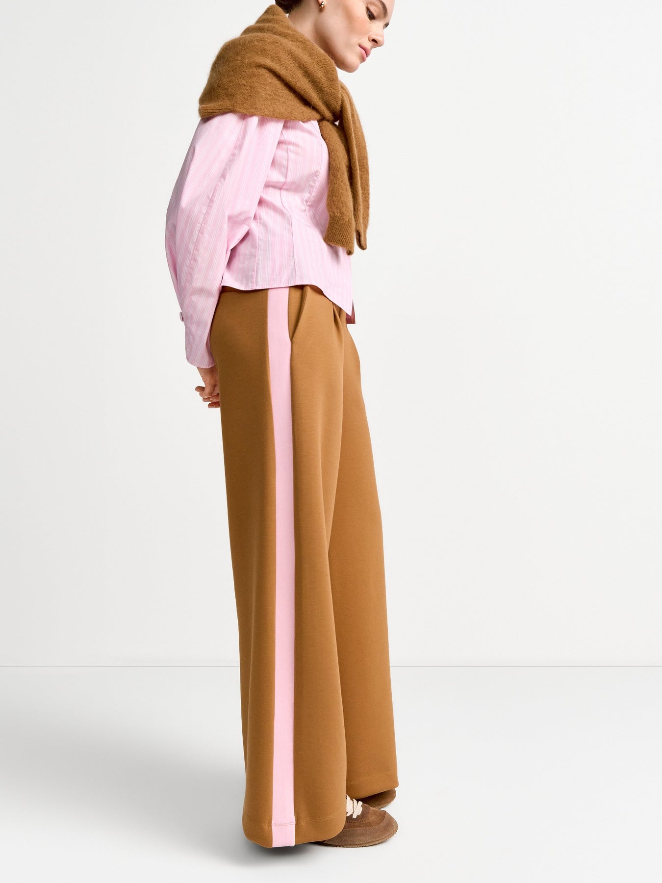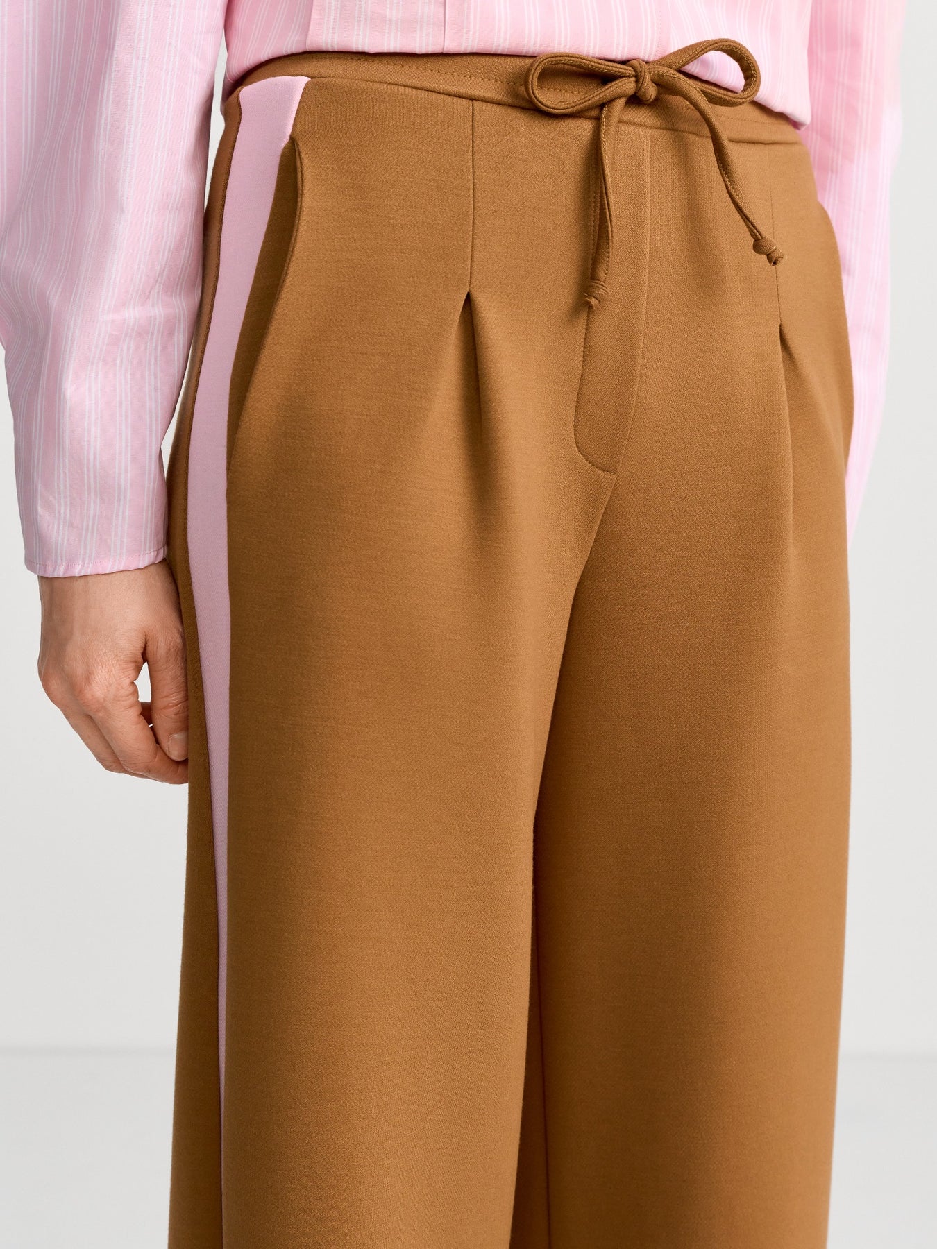 Regular price £159.95These are stunning pair of tan jersey trouser with a pink stripe down the side and a slight pleat on the front. These trouser feature a drawstring tighten, a slight pleat in the front, wide leg style and jersey trouser style.