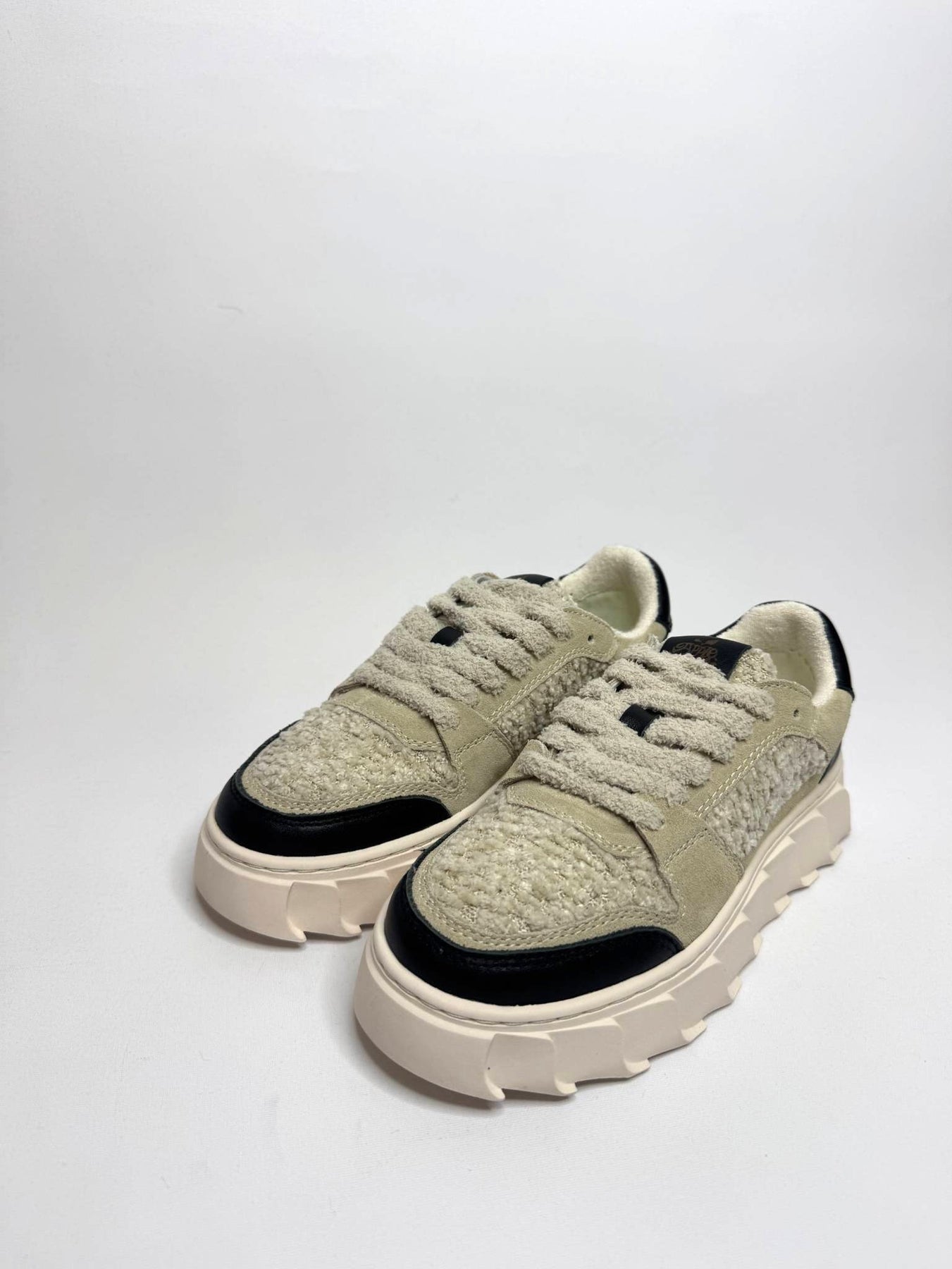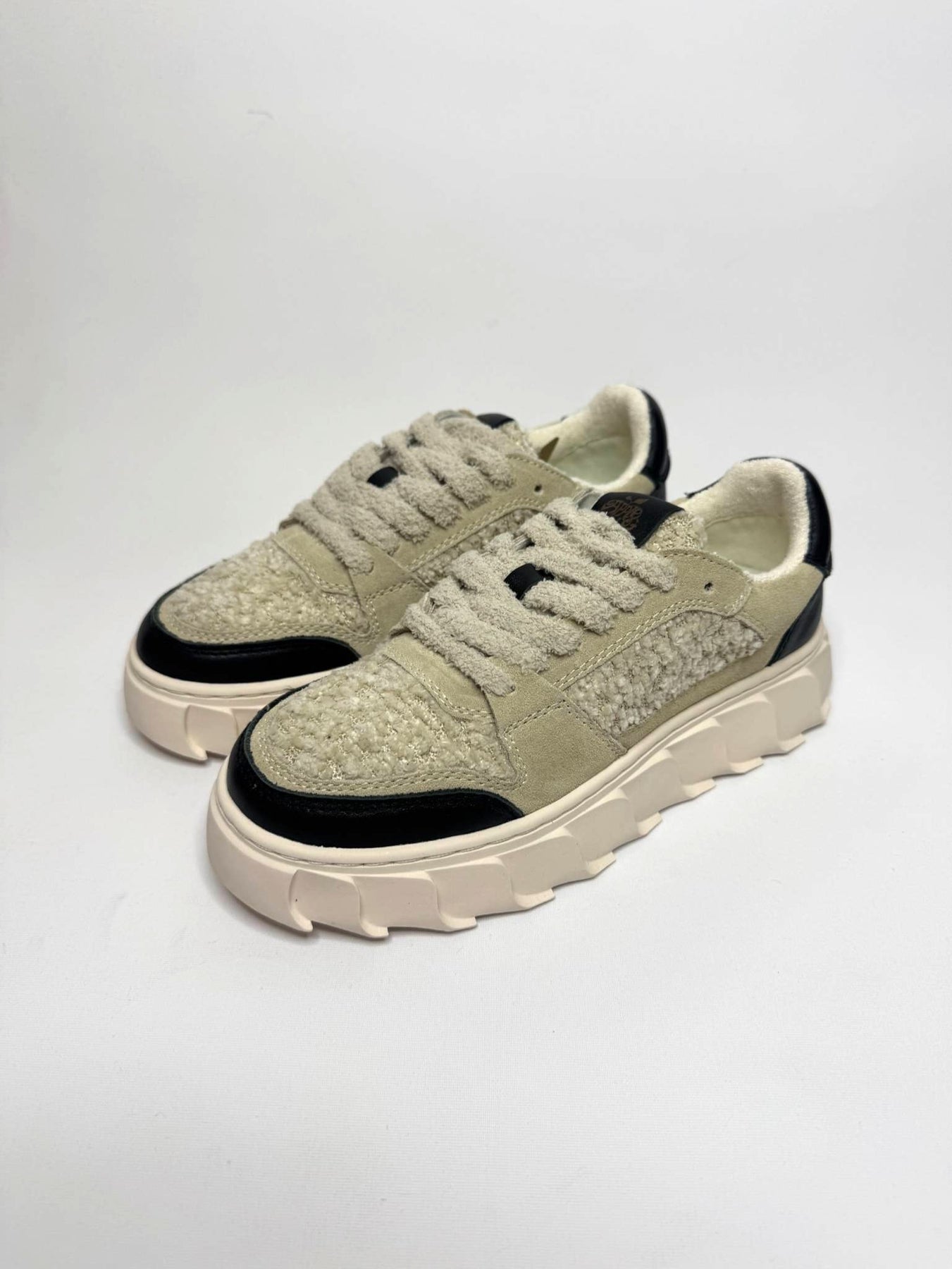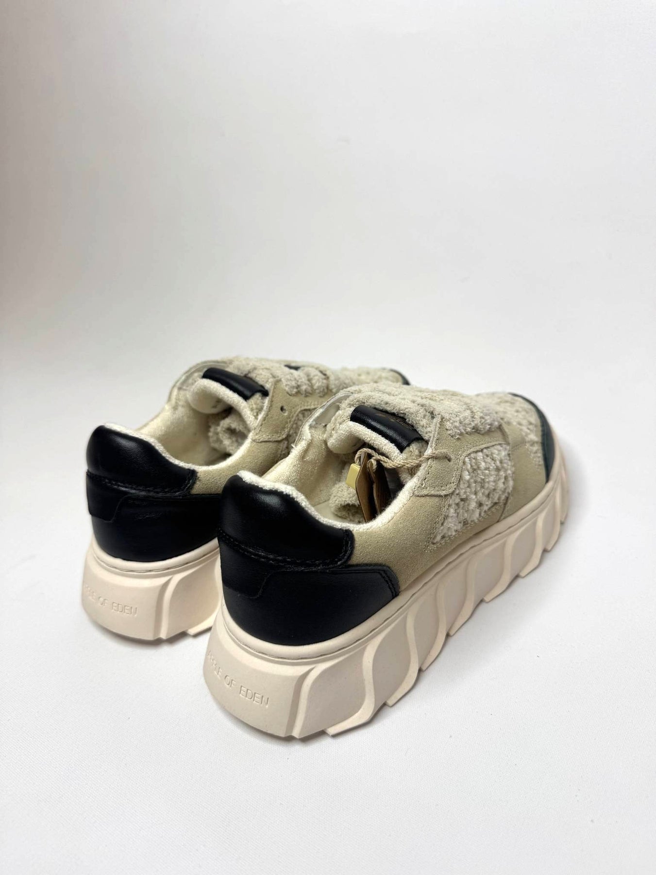 Cool and fun fluffy Apple of Eden trainers, with a spongy feel, super soft and comfy. Gorgeous neutral colour styled with the bold black, which is just perfect for your Autumn wardrobe. Fluffy on the top, sides and laces. Alternative laces if you want to swap them.