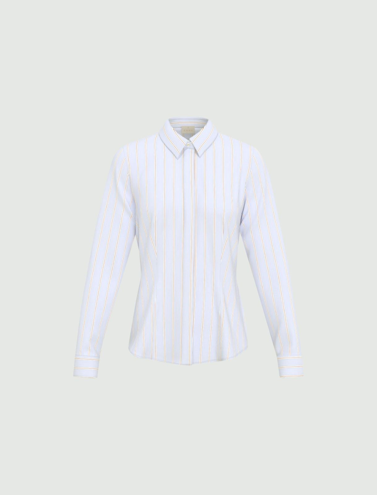 Regular price £79.00This is a lovely blue shirt with stripes throughout the shirt. This versatile and feminine stretch poplin shirt is suitable for the office and more informal occasions. Try it with wide-leg trousers, full skirts or even jeans. This shirt features stretch cotton-blend poplin shirt, regular cut, fitted waist, shirt collar, concealed button fastening and deep dart detail on the front and back.