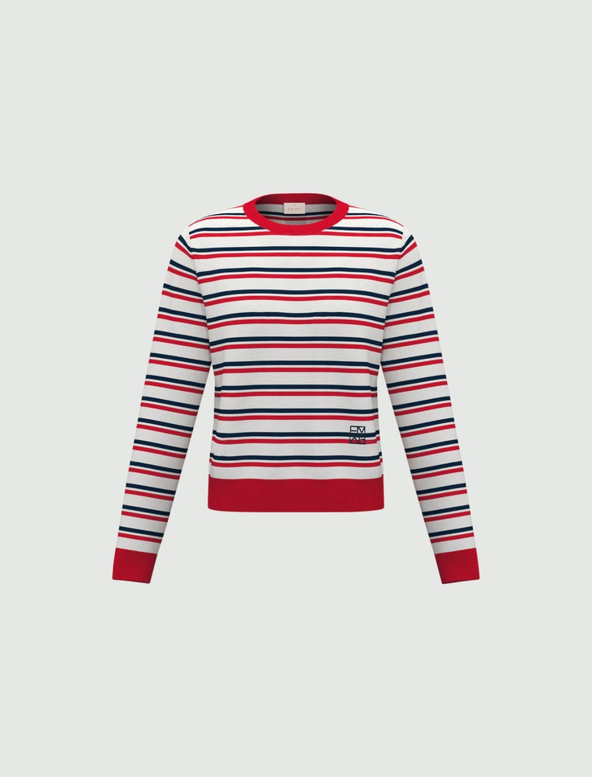 This is a lovely red, navy and white striped Sweater. Looking for the collection's most distinctive basic piece? This stretch viscose crew-neck sweater boasts a clean design and branded embroidered detail at the hem. This sweater features stretch viscose-blend sweater, regular cut, crew neckline, contrasting embroidered Monogram detail, rib-knit detail on the garment hem and cuffs.