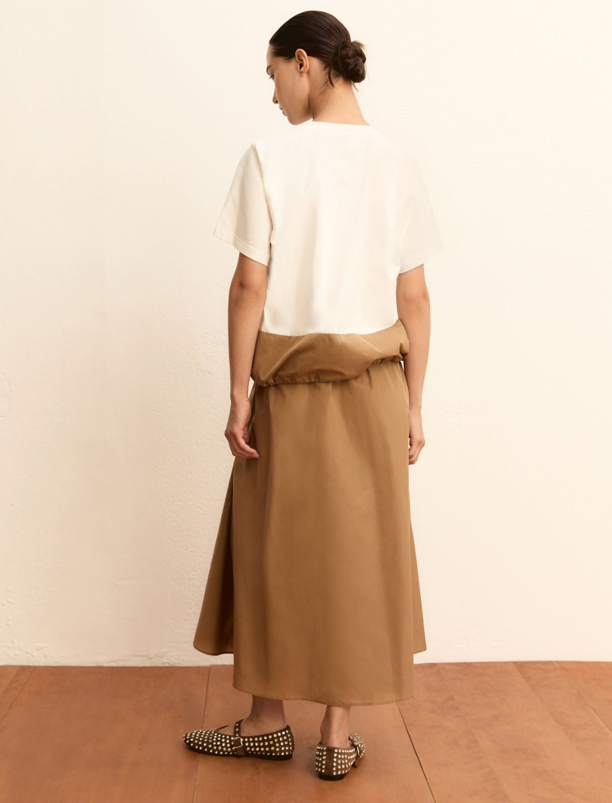 Regular price £79.00Two materials and a maxi style: this new jersey blouse boasts a metropolitan allure and gritty taffeta fabric at the garment hem, which can be cinched at will via the drawstring. This blouse features a stretch cotton jersey and taffeta fabric, regular cut, rounded neck, monogram embroidery on the chest and contrasting-colour taffeta insert at the hem with metal aglet-adorned drawstring detail.