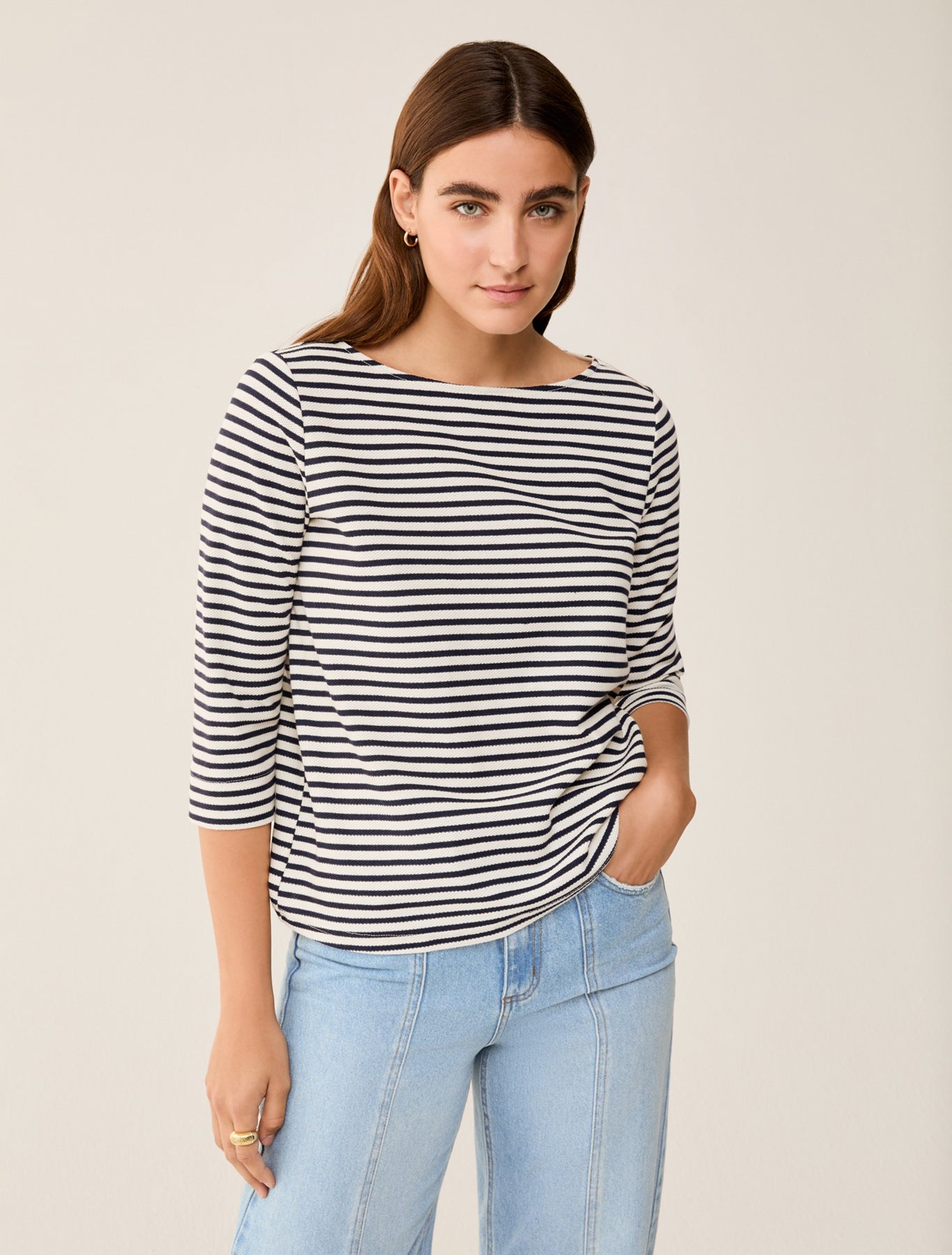 Regular price £66.00This is a pretty navy and white striped top, this is a great essential for your spring summer wardrobe. the piqué jersey marinière T-shirt is perfect with a blazer in the city and is always ready for a weekend away.