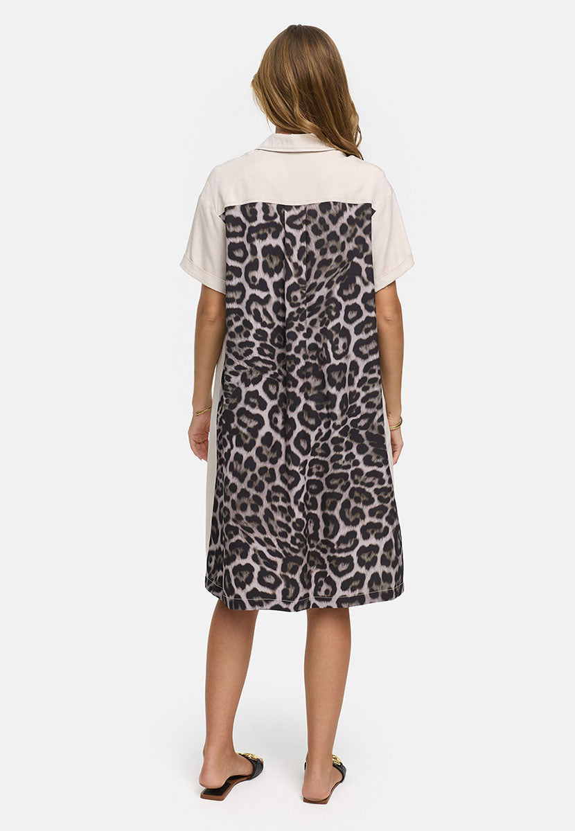 Regular price £159.95This is a lovely beige dress with a floral panel on the back, this is the perfect dress for the warm and sunny weather. This dress features short sleeves, knee length, pockets on the chest, standard collar and button to fasten by the neckline.