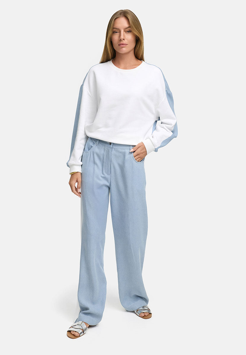 Regular price £149.95These are a cool pair of CatNoir trousers .They are a light denim colour at the front and white at the back with light denim coloured pockets. These are great if you are looking for the spring/summer weather. These trousers feature pockets on the back, zip & button to fasten, belt loops, elasticated waist band at the back and regular fit.