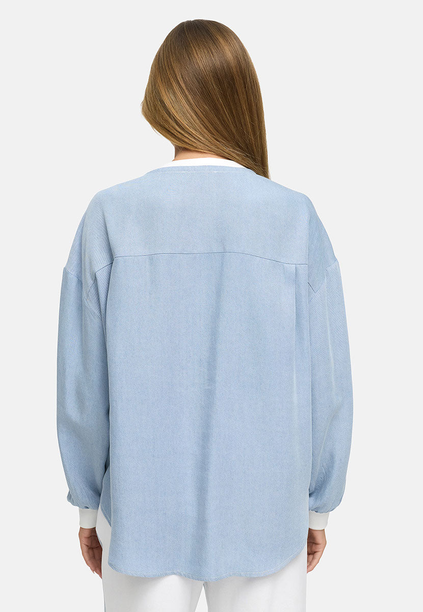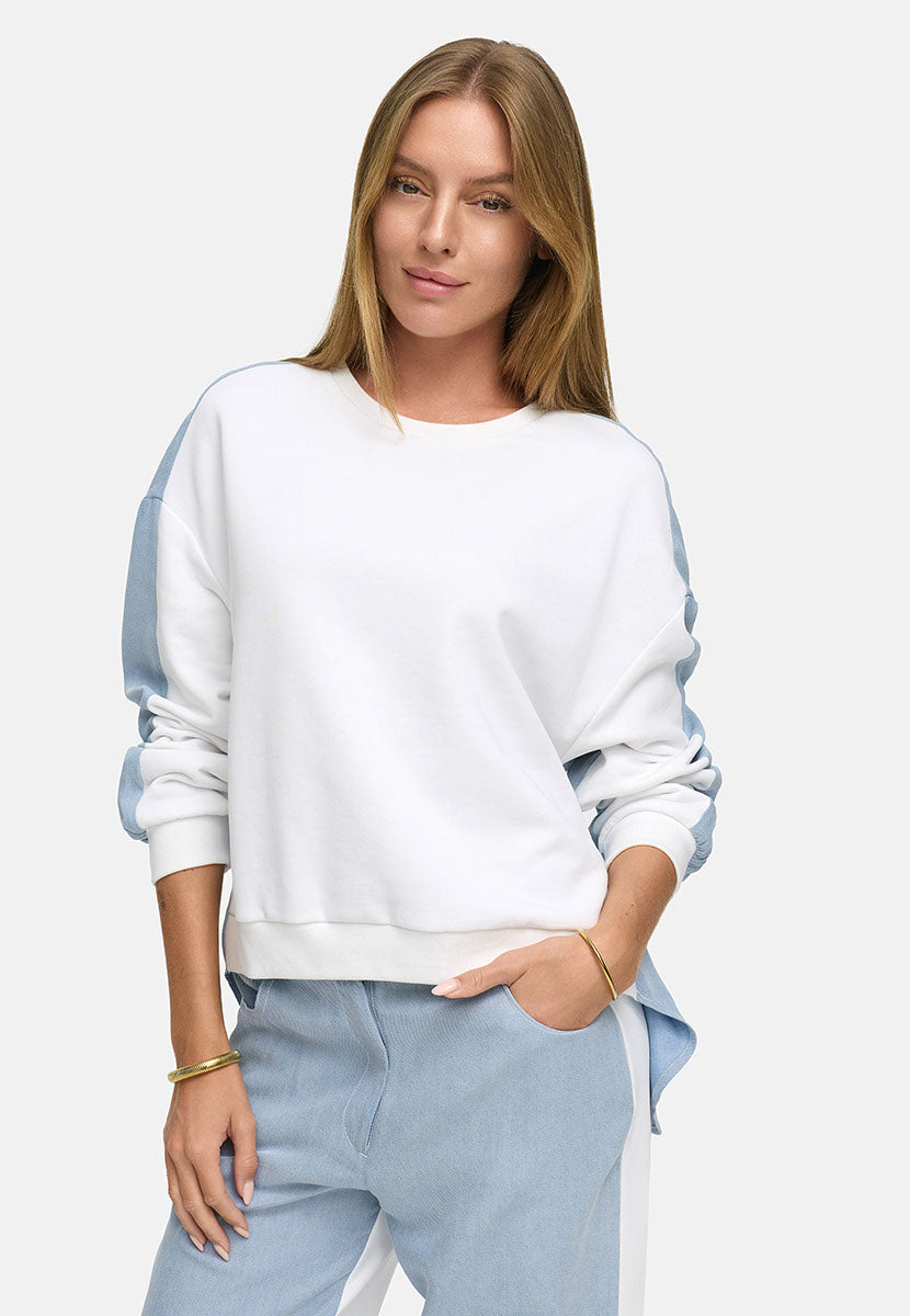 This is a stunning sweatshirt, it is white at the front and a denim style at the back. This is perfect if you are looking for something for a layer that is going to match a lot. This sweatshirt features long sleeves, two tome colour - the white and denim, a round neckline, short in the front and long in the back and is a regular fit.