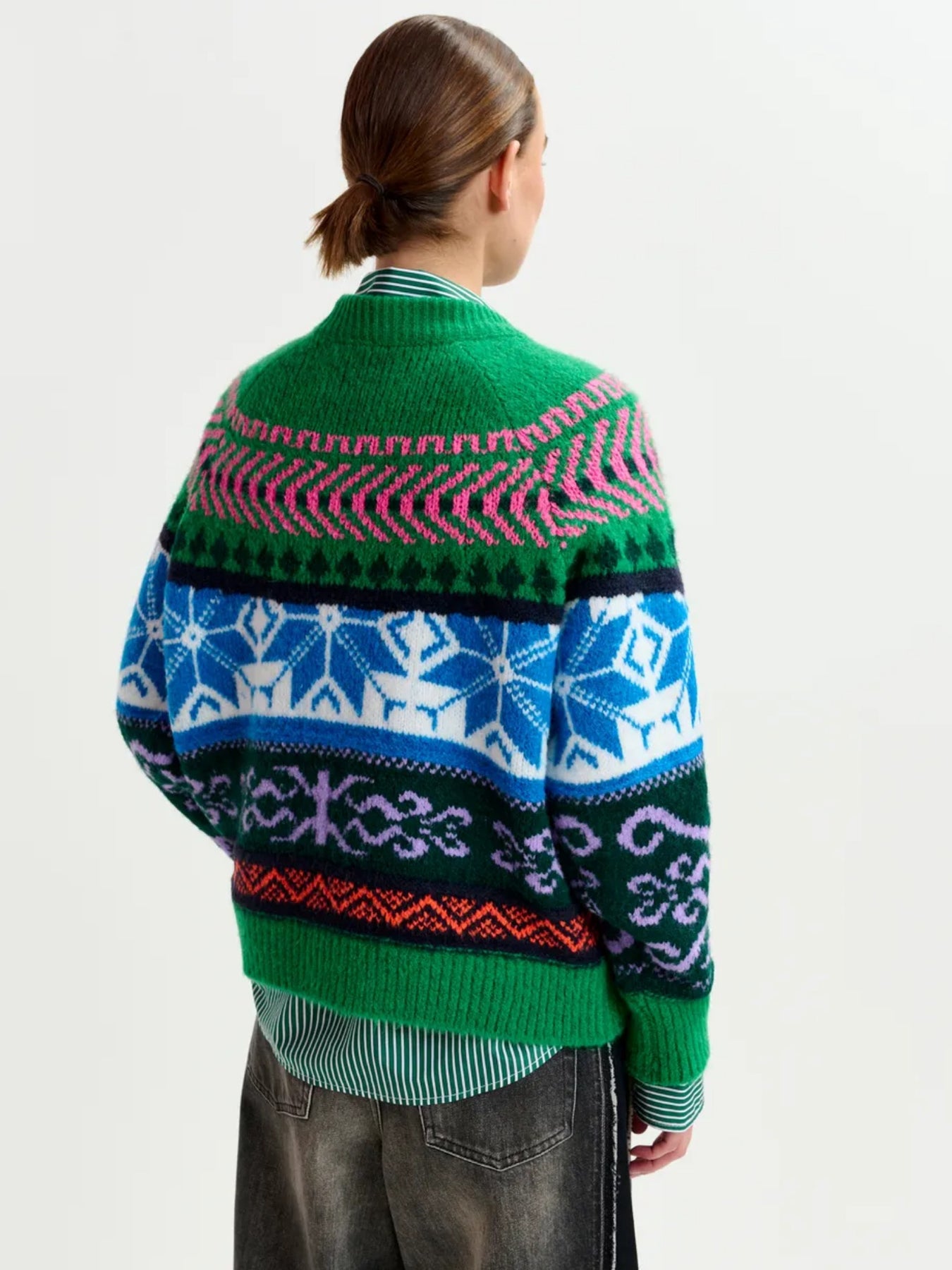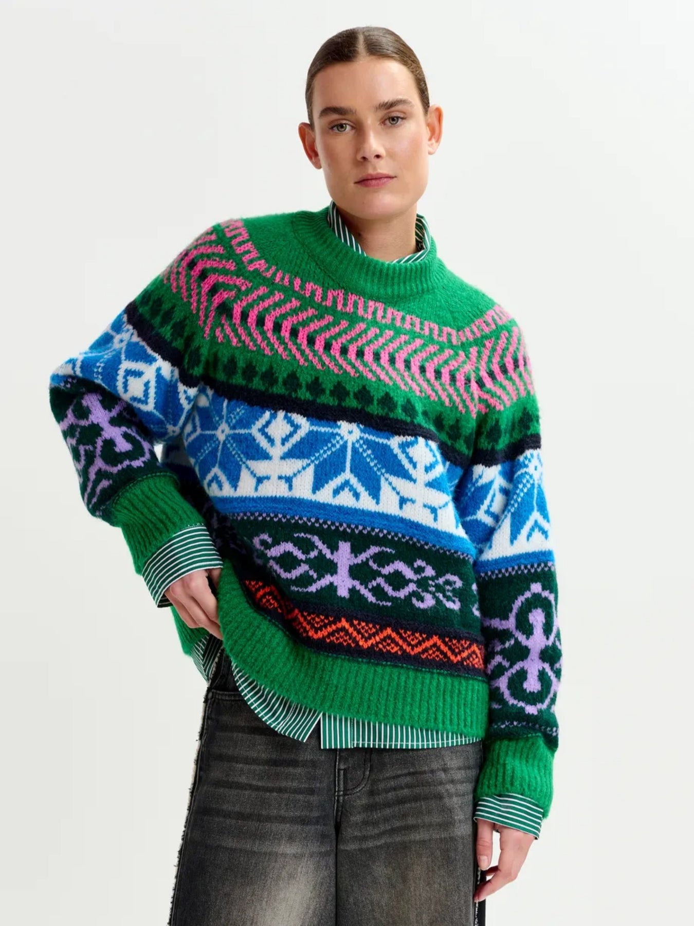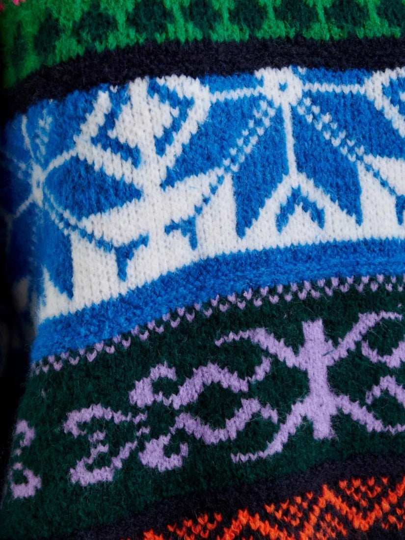 Brighten up your wardrobe with this eye-catching jacquard sweater, crafted in a mélange knit for cozy warmth and rich texture. Designed with a relaxed fit and a modern boxy cut, it offers effortless comfort. The bold, multicolour pattern adds a playful twist, while ribbed trims at the collar, cuffs, and hem provide a clean, structured finish.