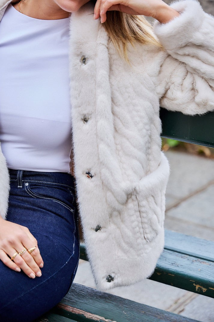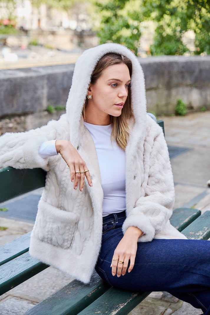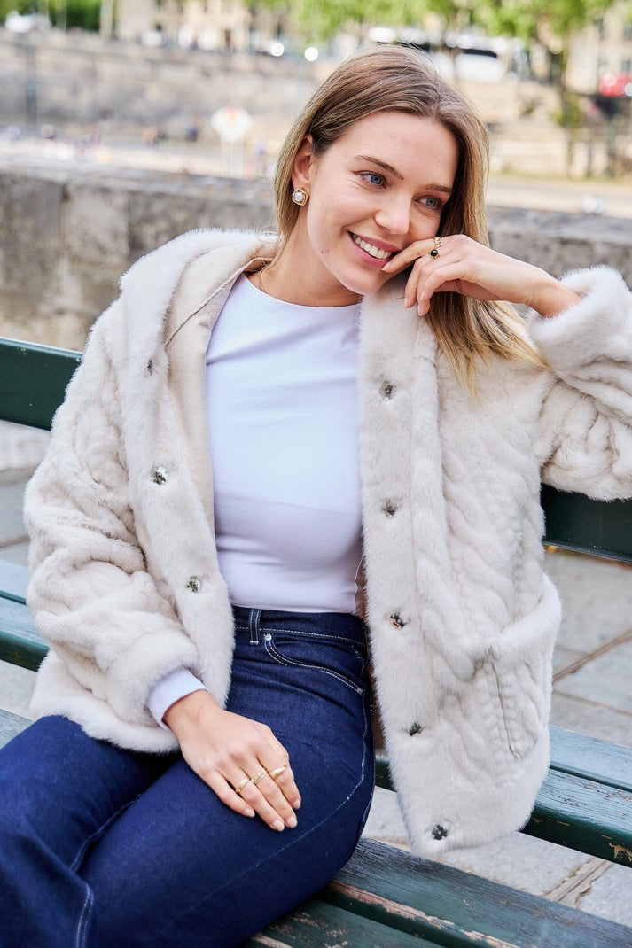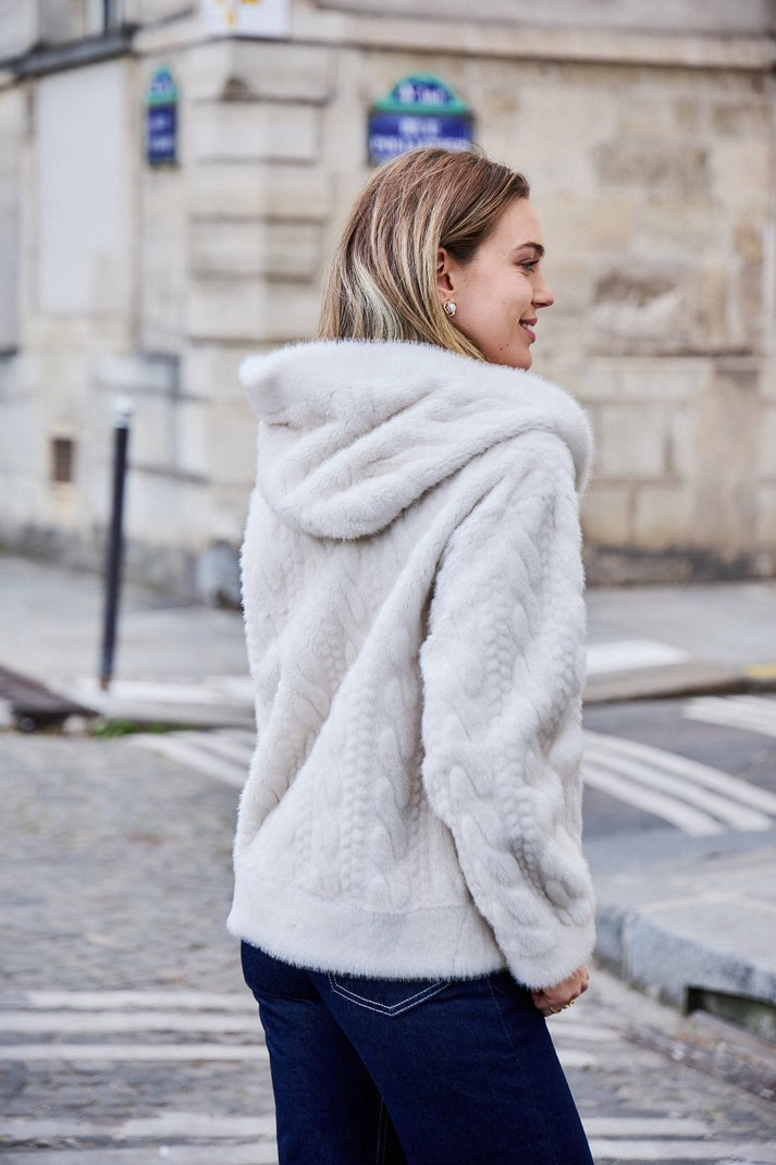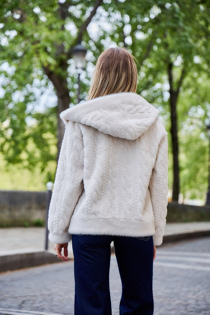 This is a lovely ecru faux fur jacket, perfect if you are looking for something to keep you warm. Soft and cosy, the Minnie Mouse jacket captivates with its timeless style and understated details. A piece that's easy to wear and pair with. This jacket features a button closure, long sleeves, a wraparound hood, woven effect patterns, mis-length straight cut and faux fur effect fabric.