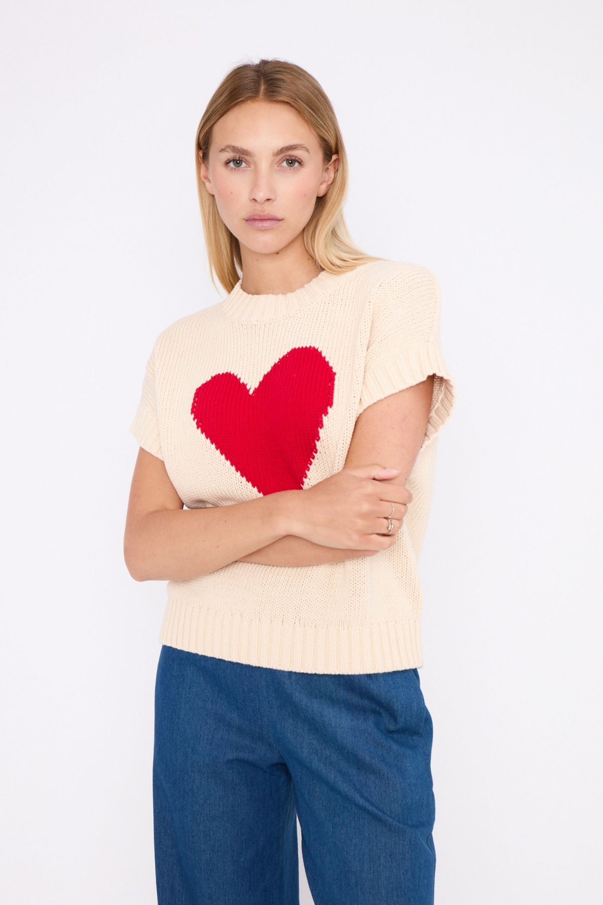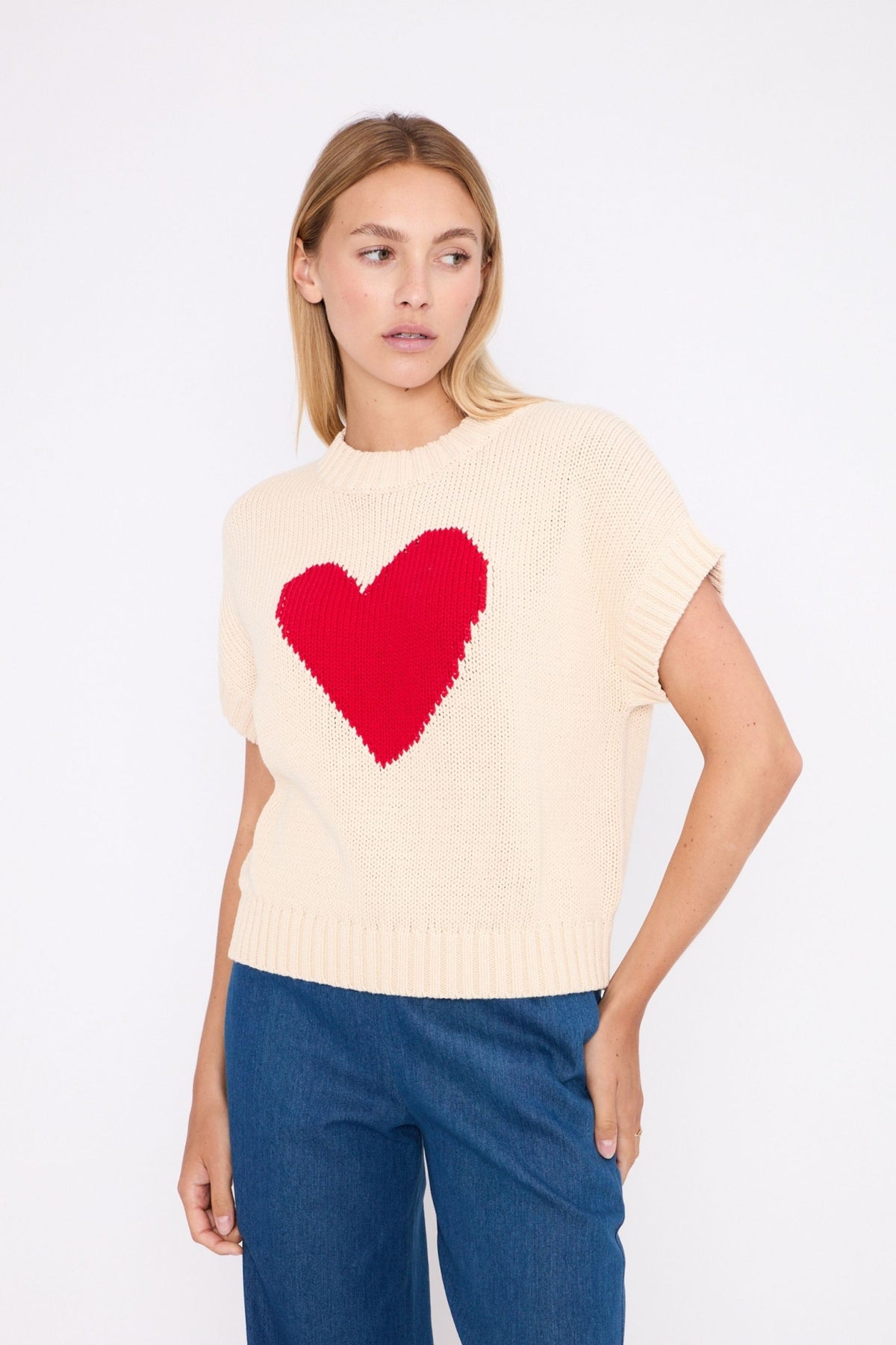 Regular price £124.95This is a gorgeous beige vest knit sweater with a red heart on the front. Cute little sweater to transition you into your Spring wardrobe. Lovely little ribbed waistband and neckline.