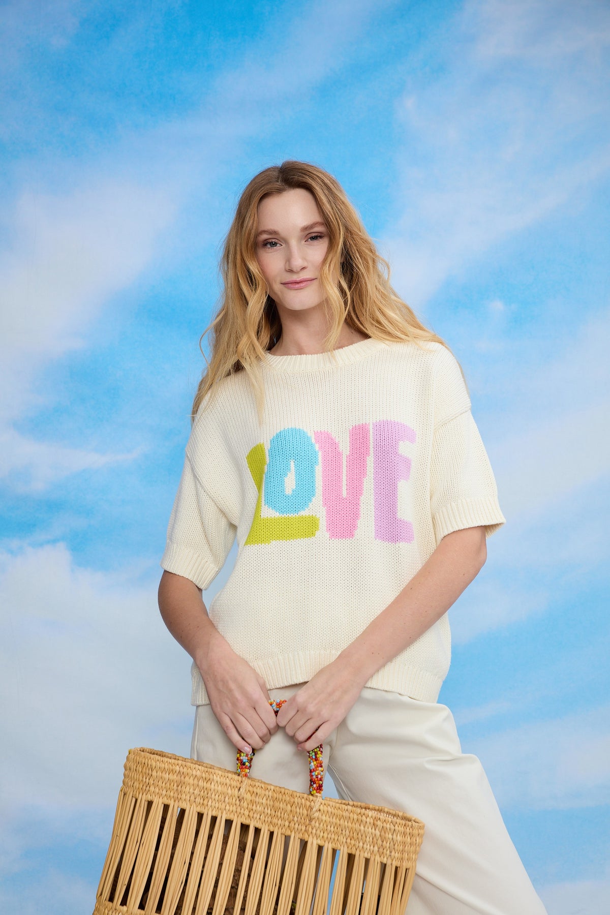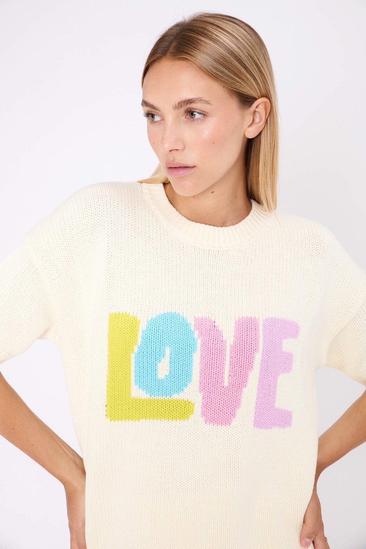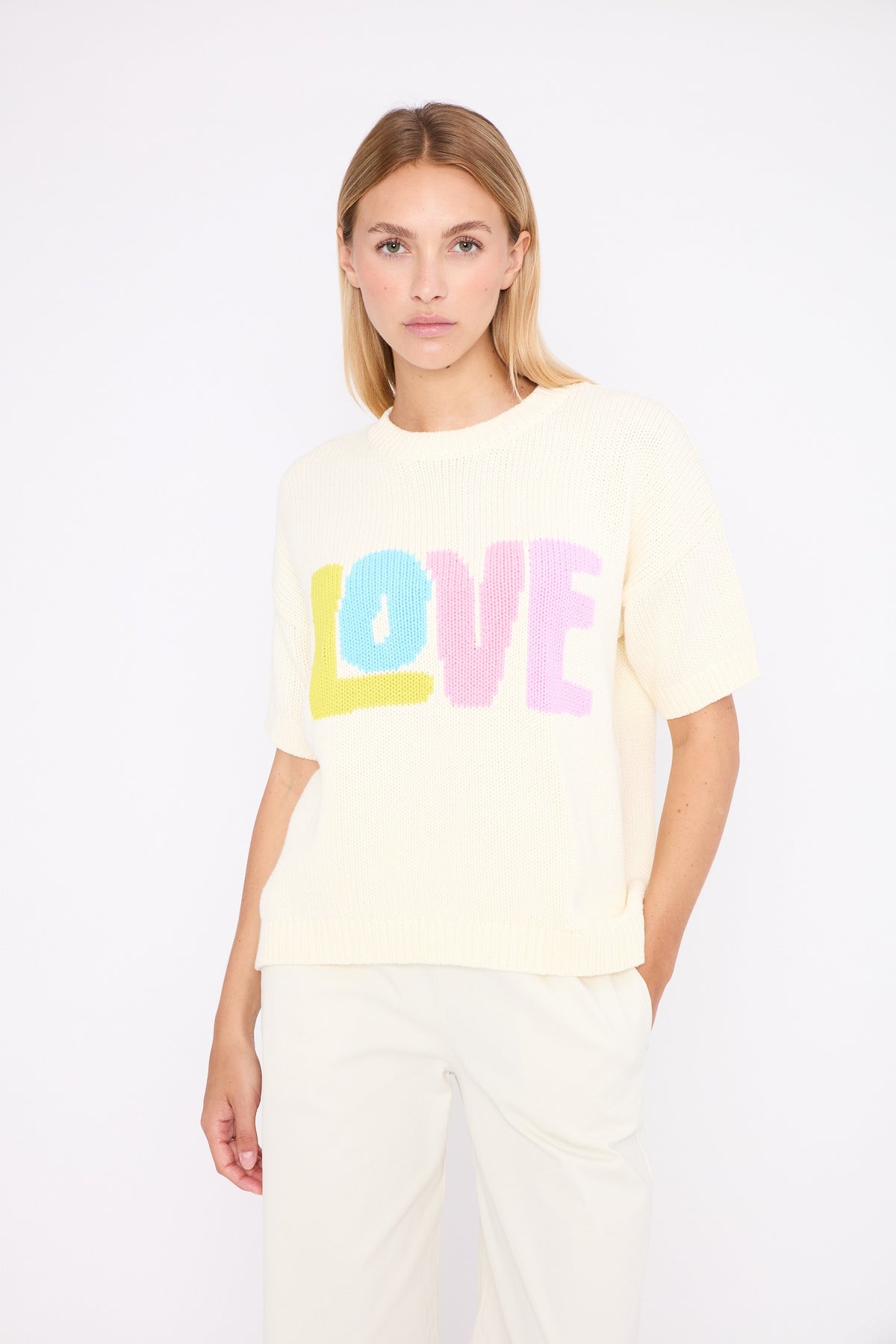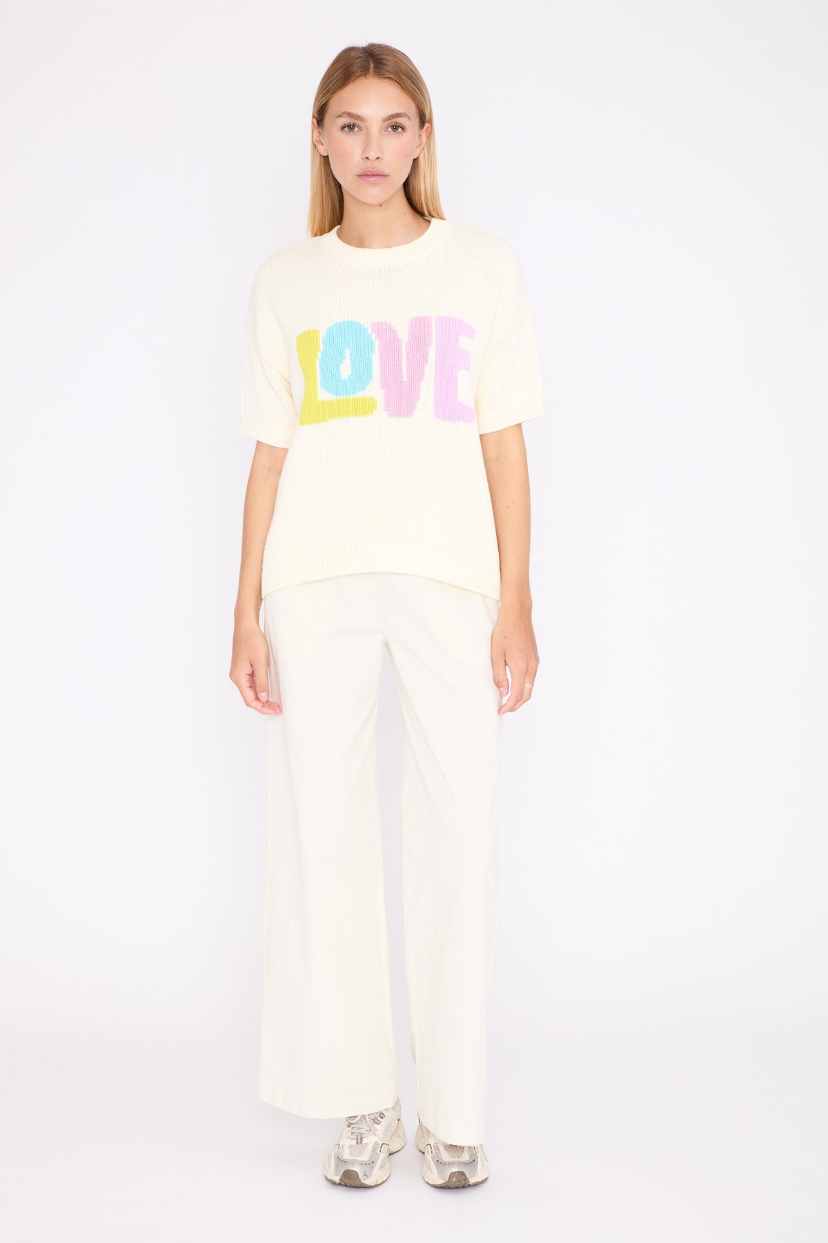The colourful LOVE slogan adds a pop and positive touch, designed to brighten everyday looks.