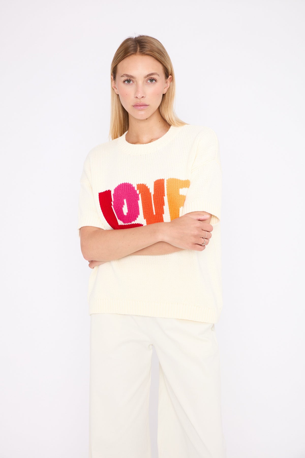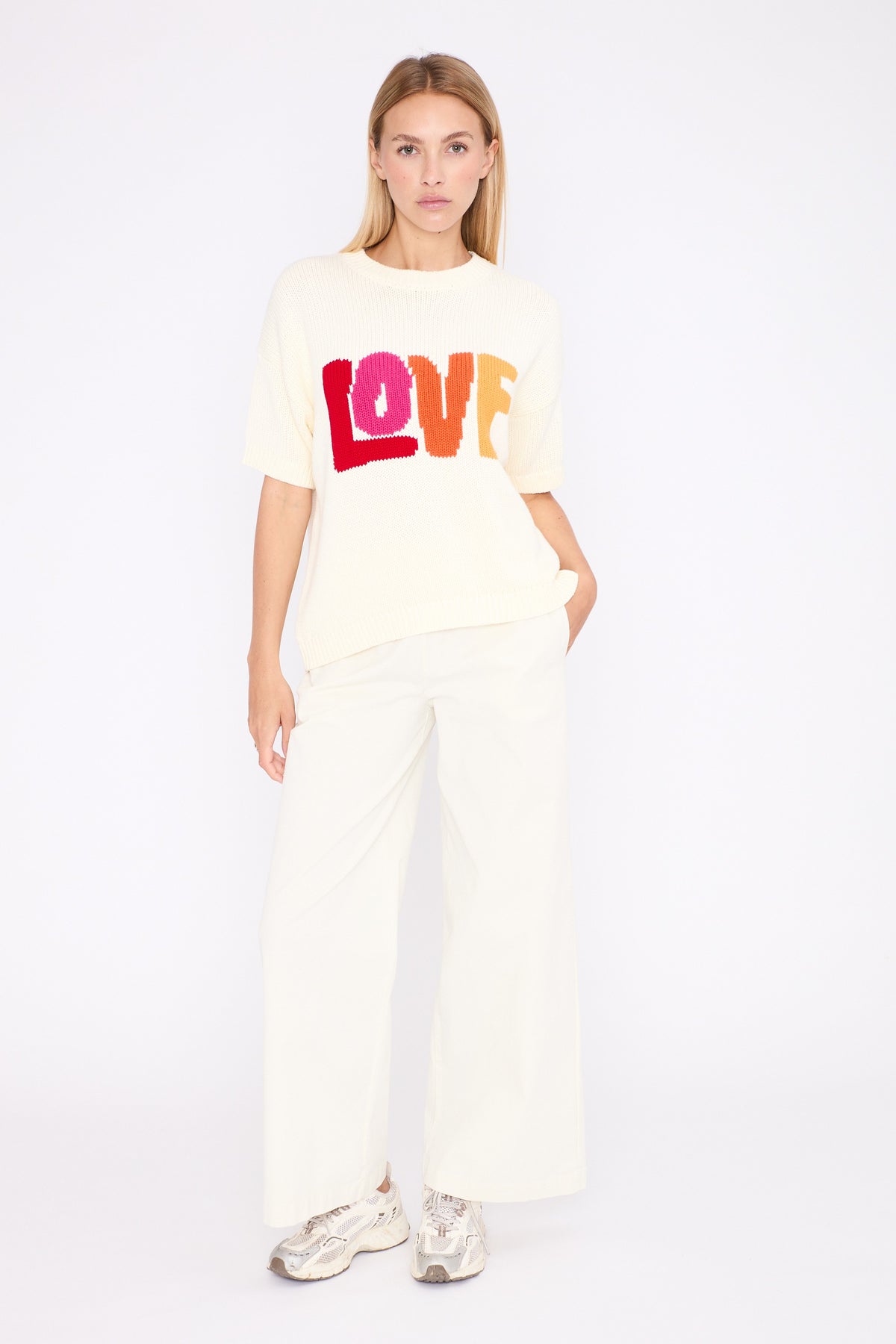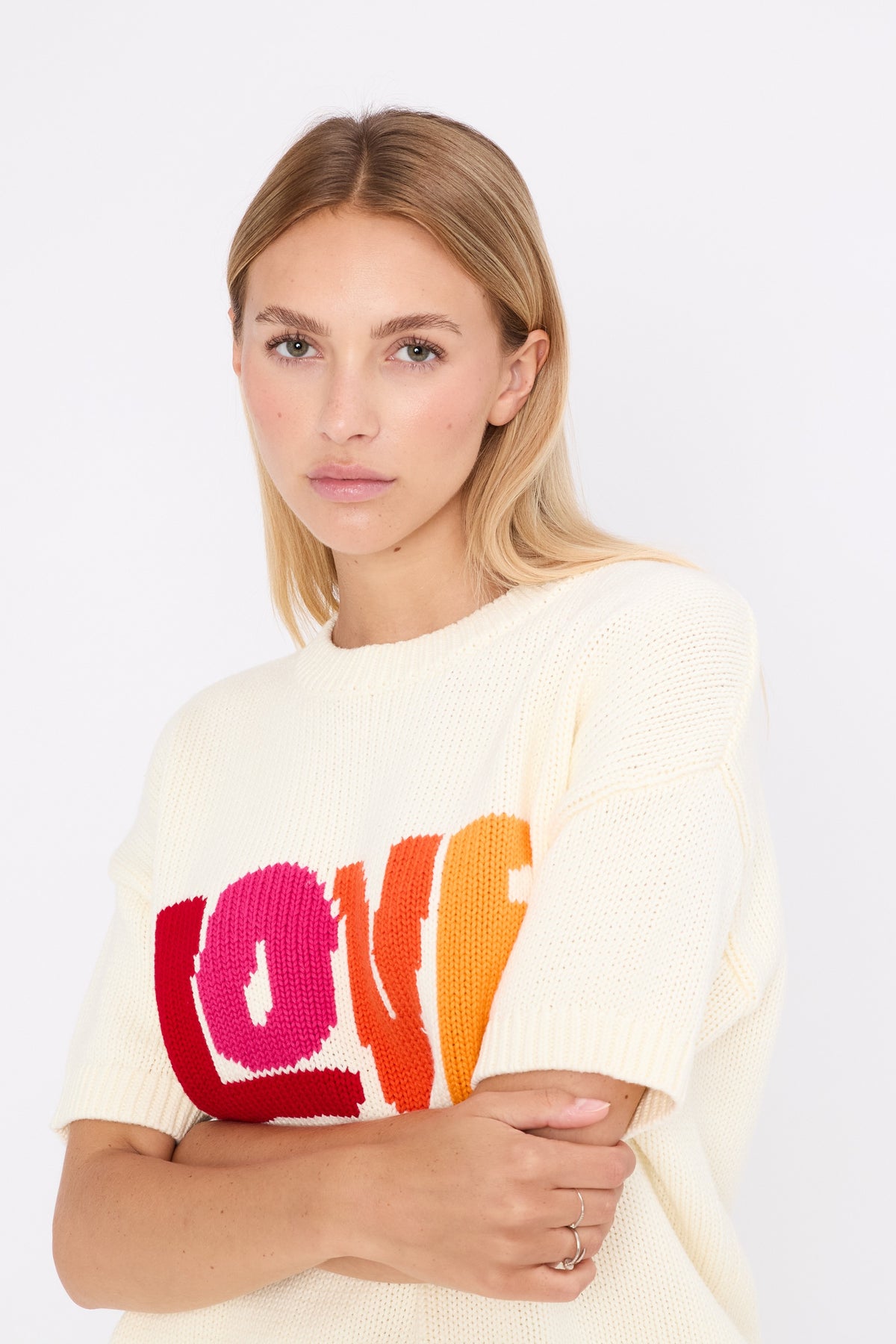 The colourful LOVE slogan adds a pop and positive touch, designed to brighten everyday looks.