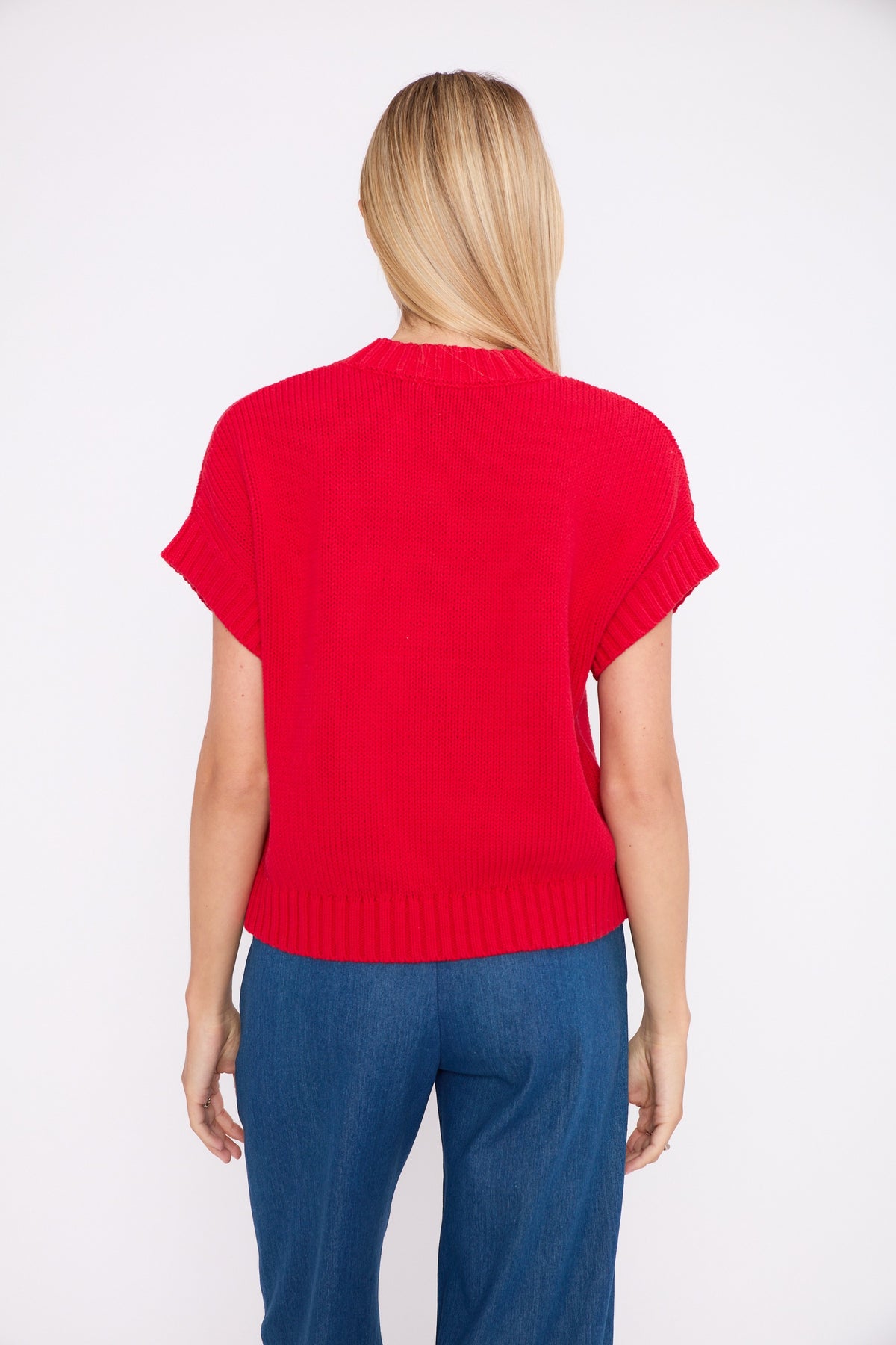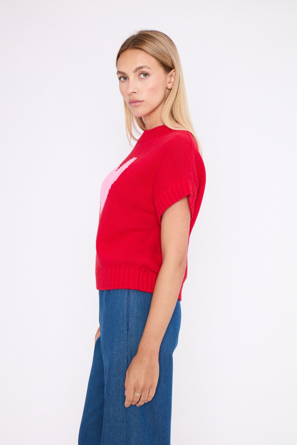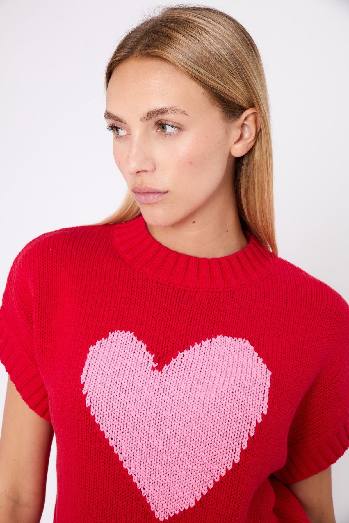 Regular price £124.95This is a gorgeous, cute little vest knit sweater with cute little pink heart on the front. lovely ribbed look on the neckline, arms and waistline. The perfect piece to transition you into your Spring wardrobe.