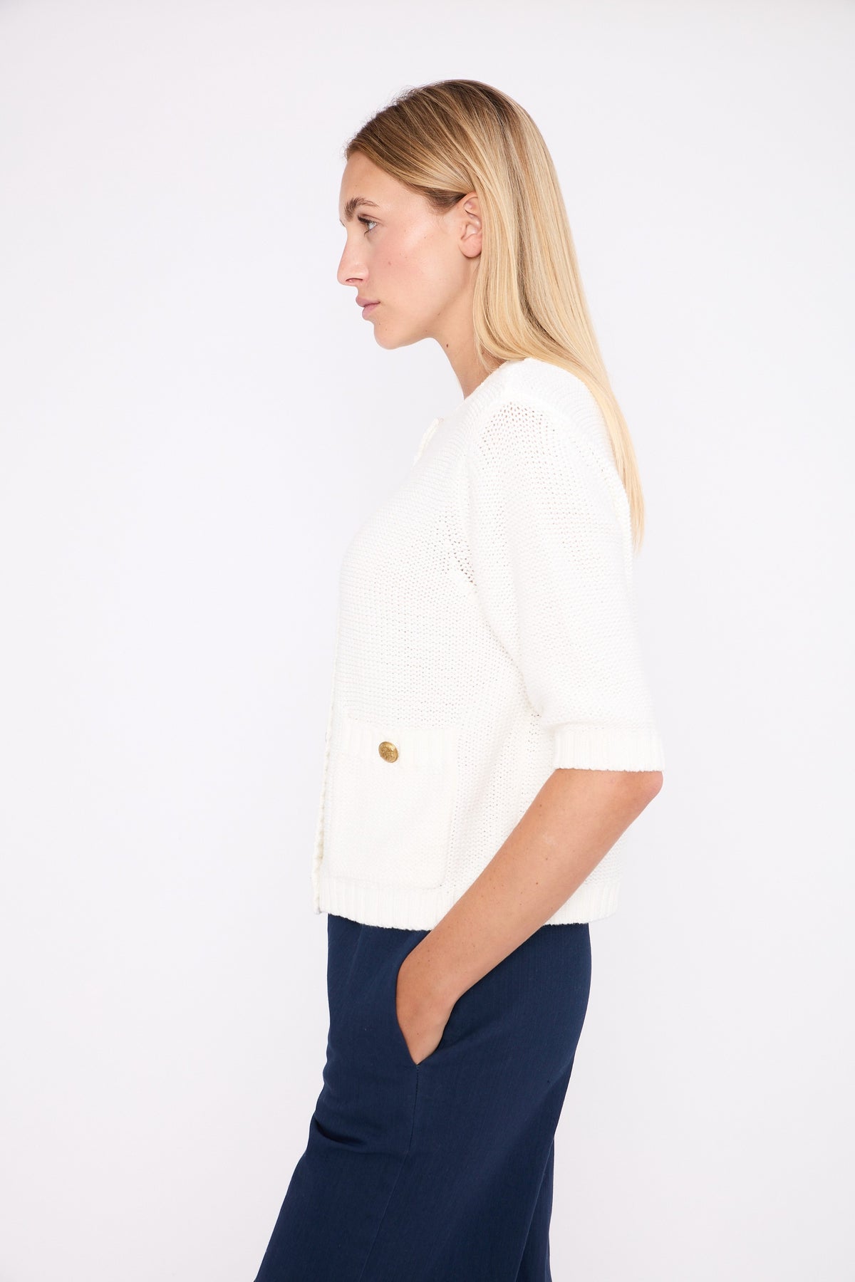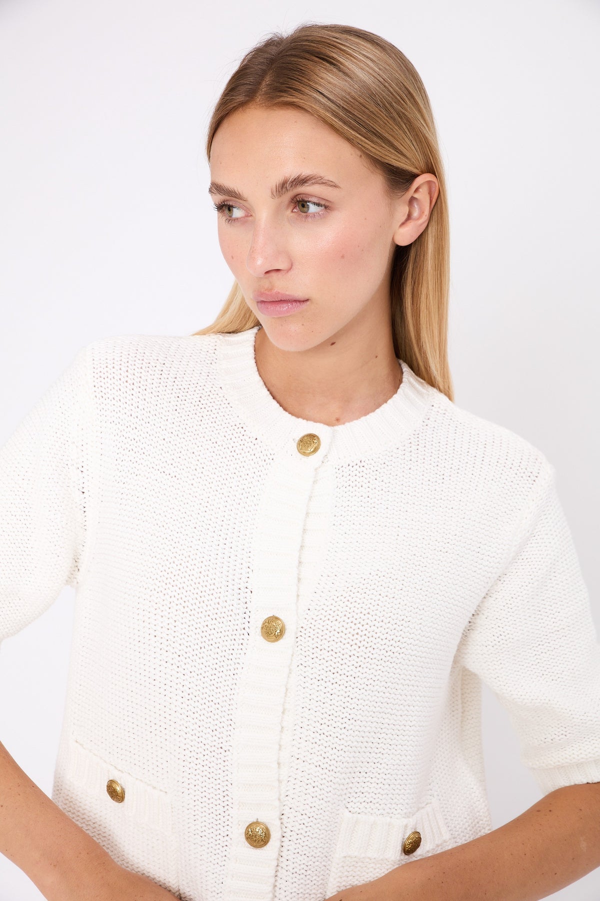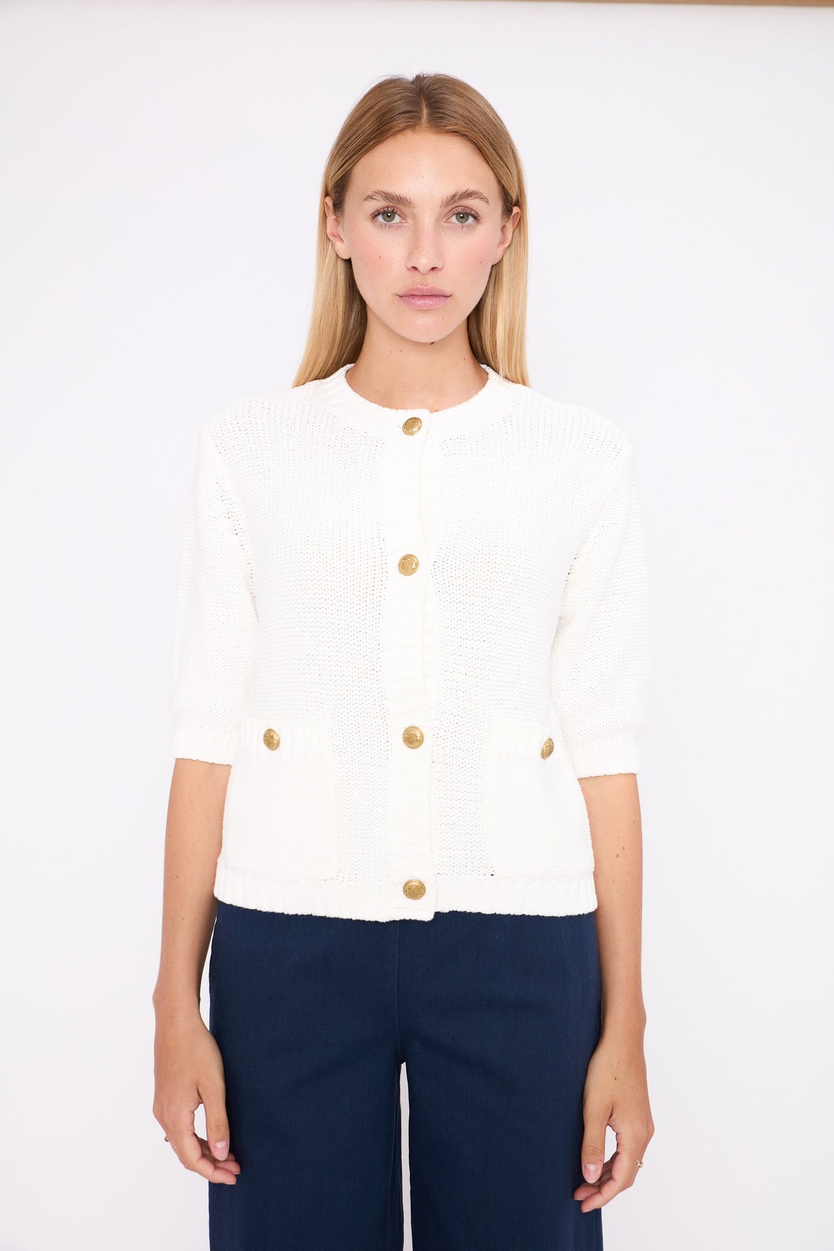 Its structured knit, gold-tone buttons and graphic pockets create a clean silhouette — chic without feeling formal.