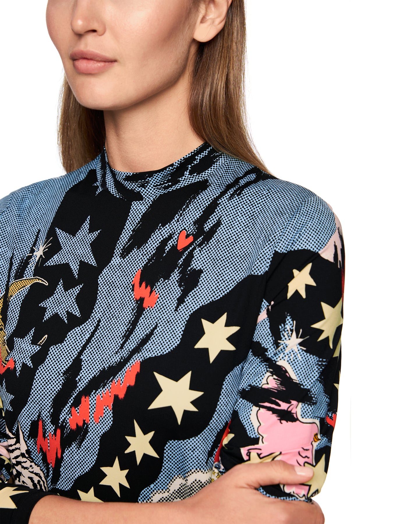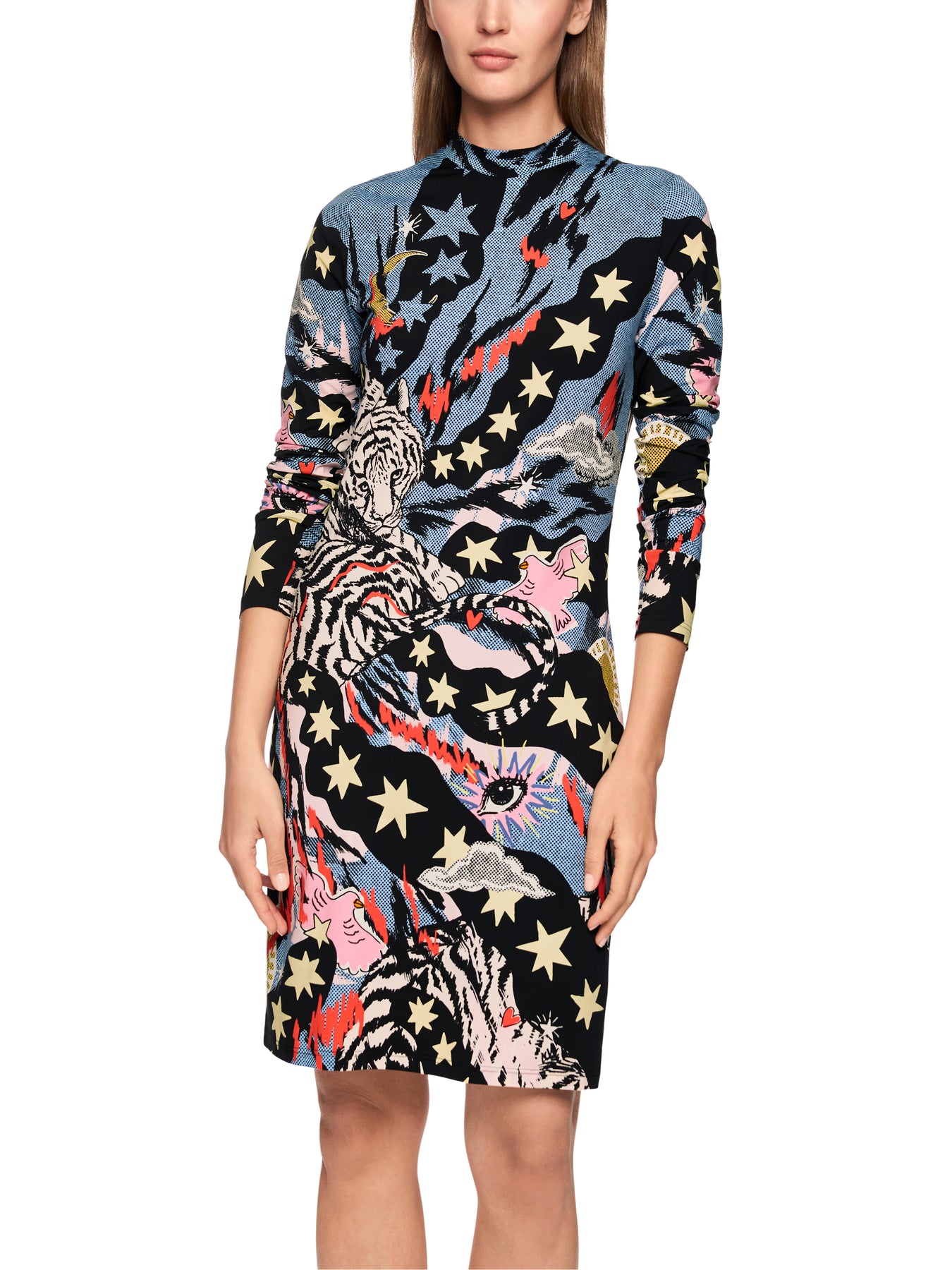 Regular price £255.00This close-fitting dress stands out with its striking comic print. It is cut slightly shorter and has a beautiful silhouette. Its details include the stand-up collar and elastic material. This dress is also lined. A real eye-catcher for special occasions.