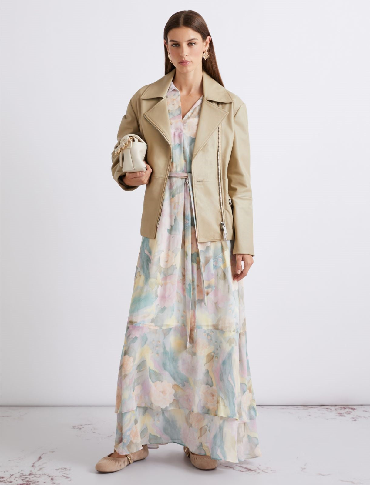 Regular price £344.00Romantic georgette dress with large flounce detail on the sleeves and garment hem. The light model boasts a colourful patterned print, making it ideal for warm days in the city.