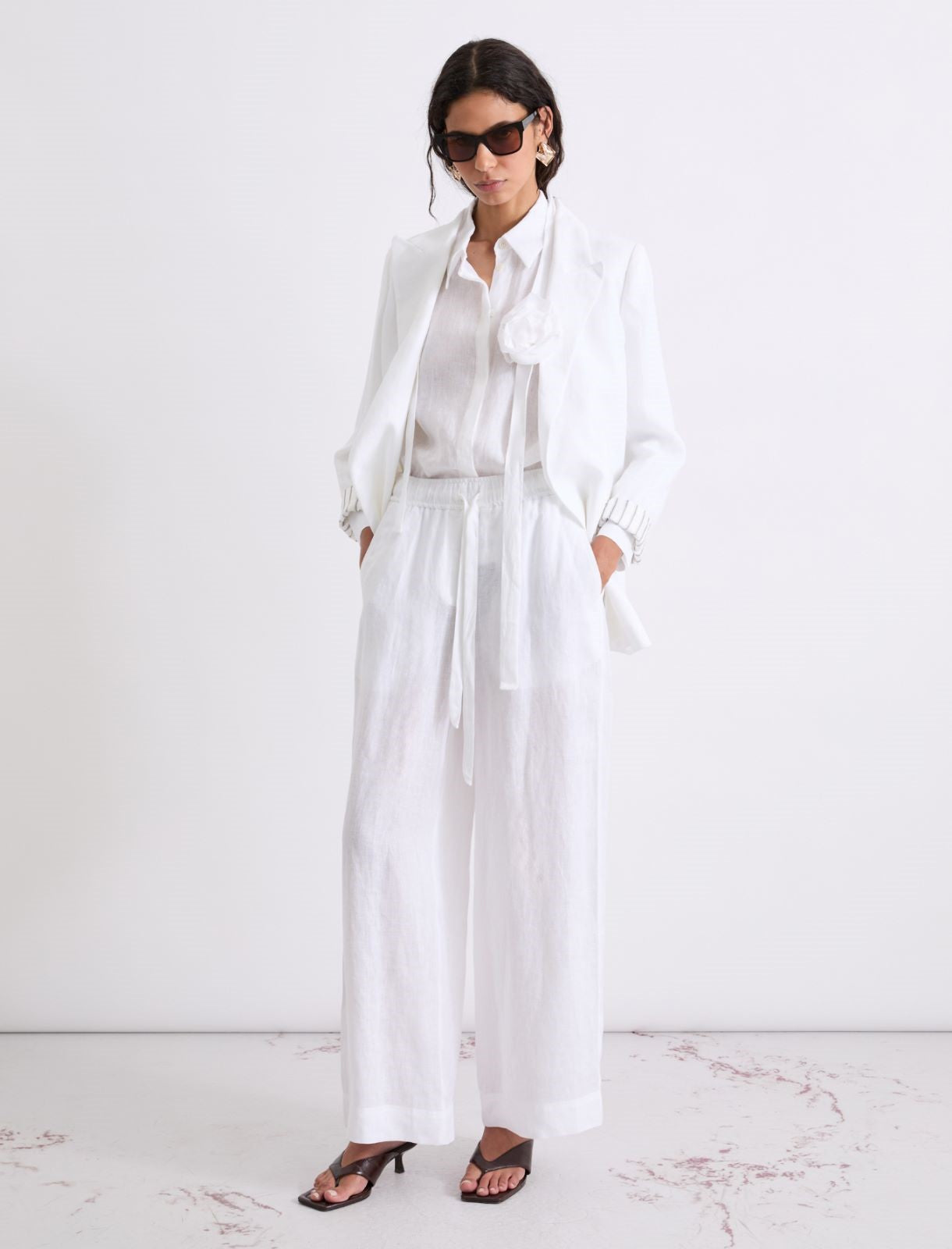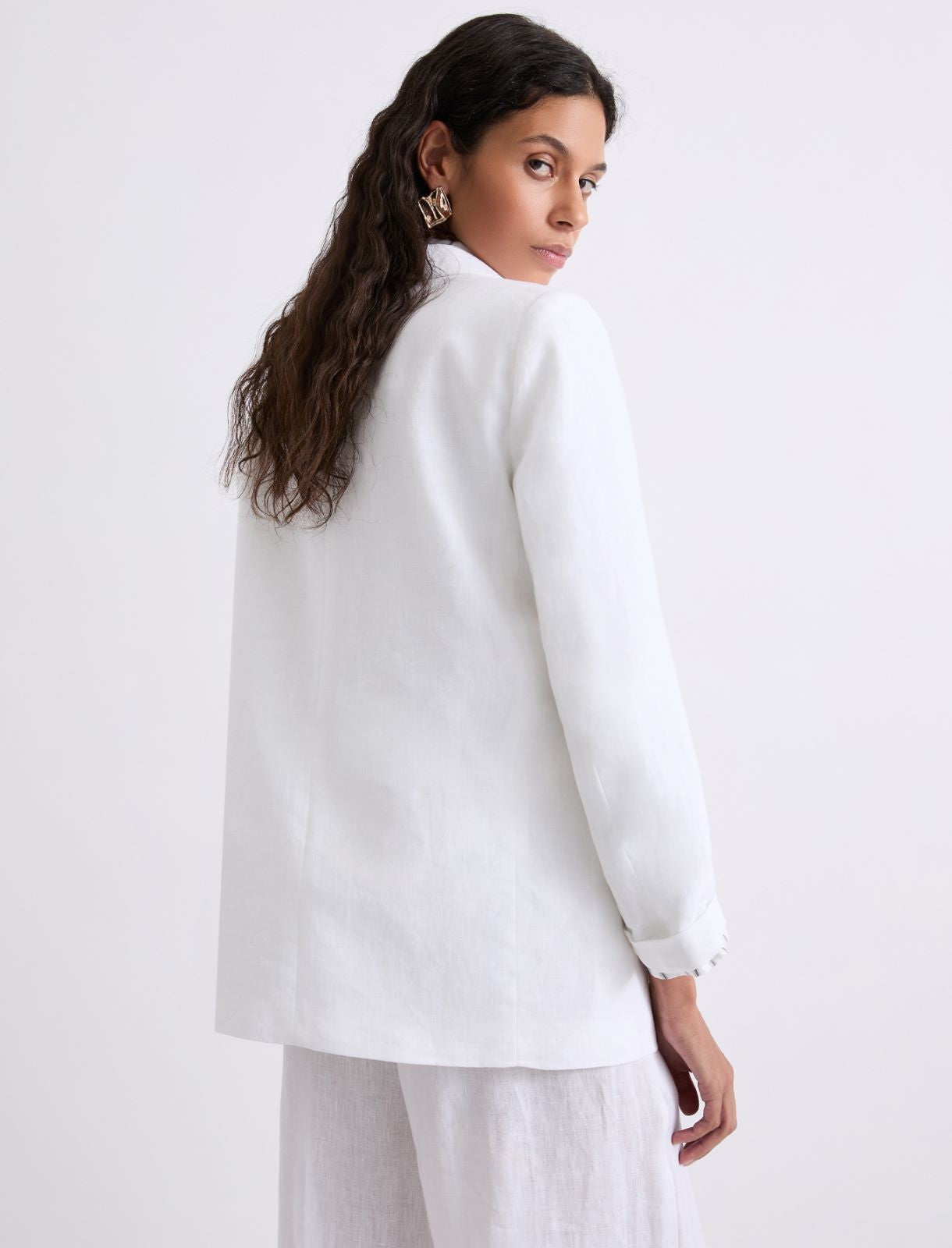 Regular price £296.00This is a beautiful white pure linen blazer, perfect or warm weather and matching with everything. This flowing and light pure linen blazer is worn with the sleeves turned up, thanks to the contrasting lining. This blazer features pure linen canvas, regular cut, lapel collar, contrasting sleeve lining and flap side pockets.