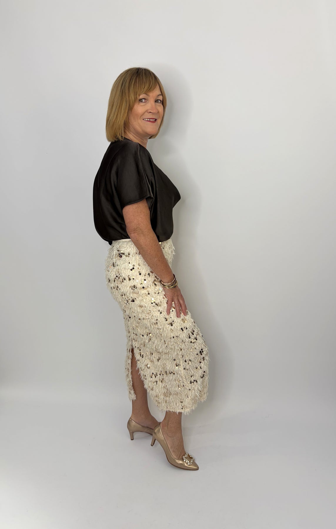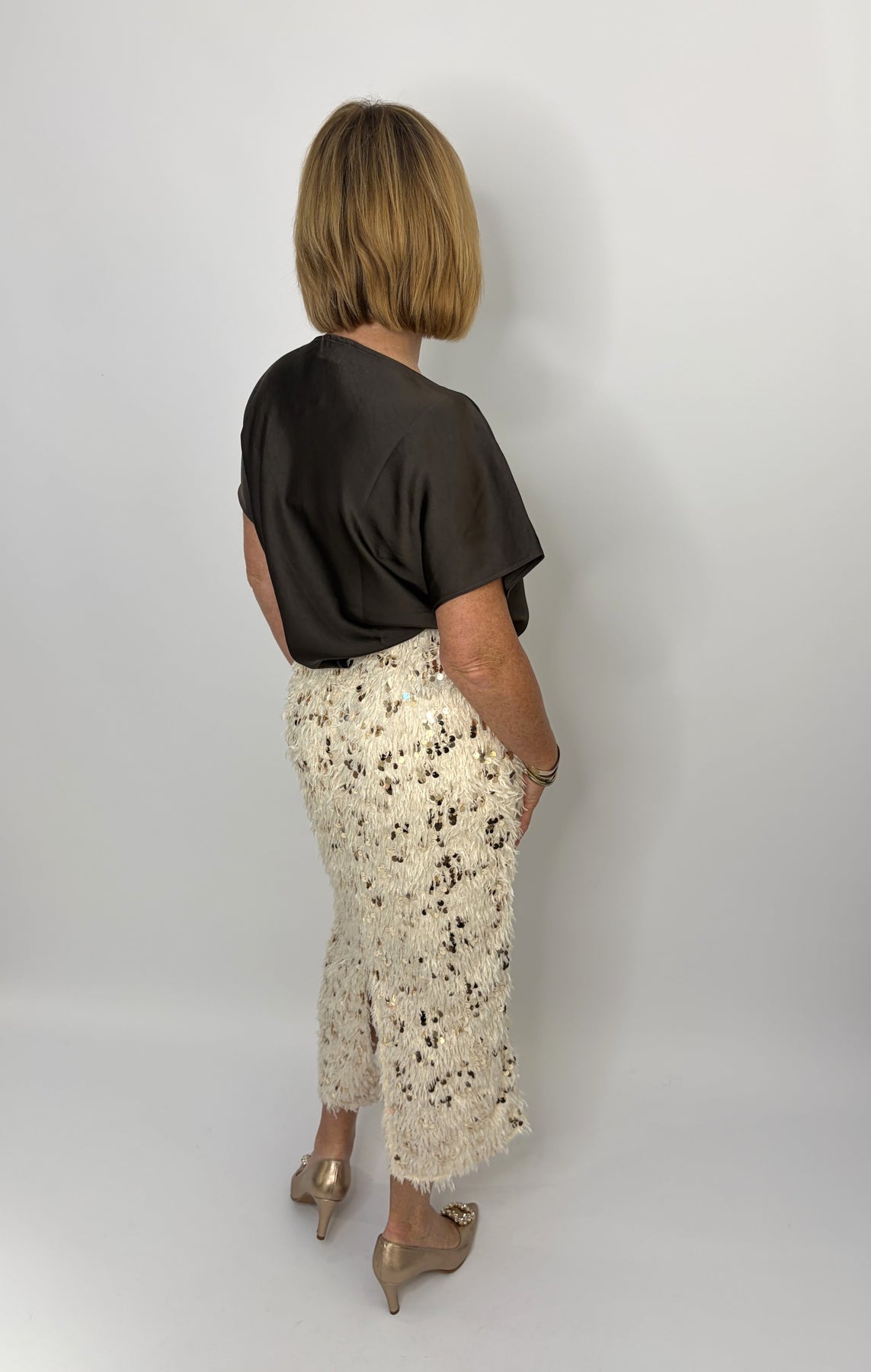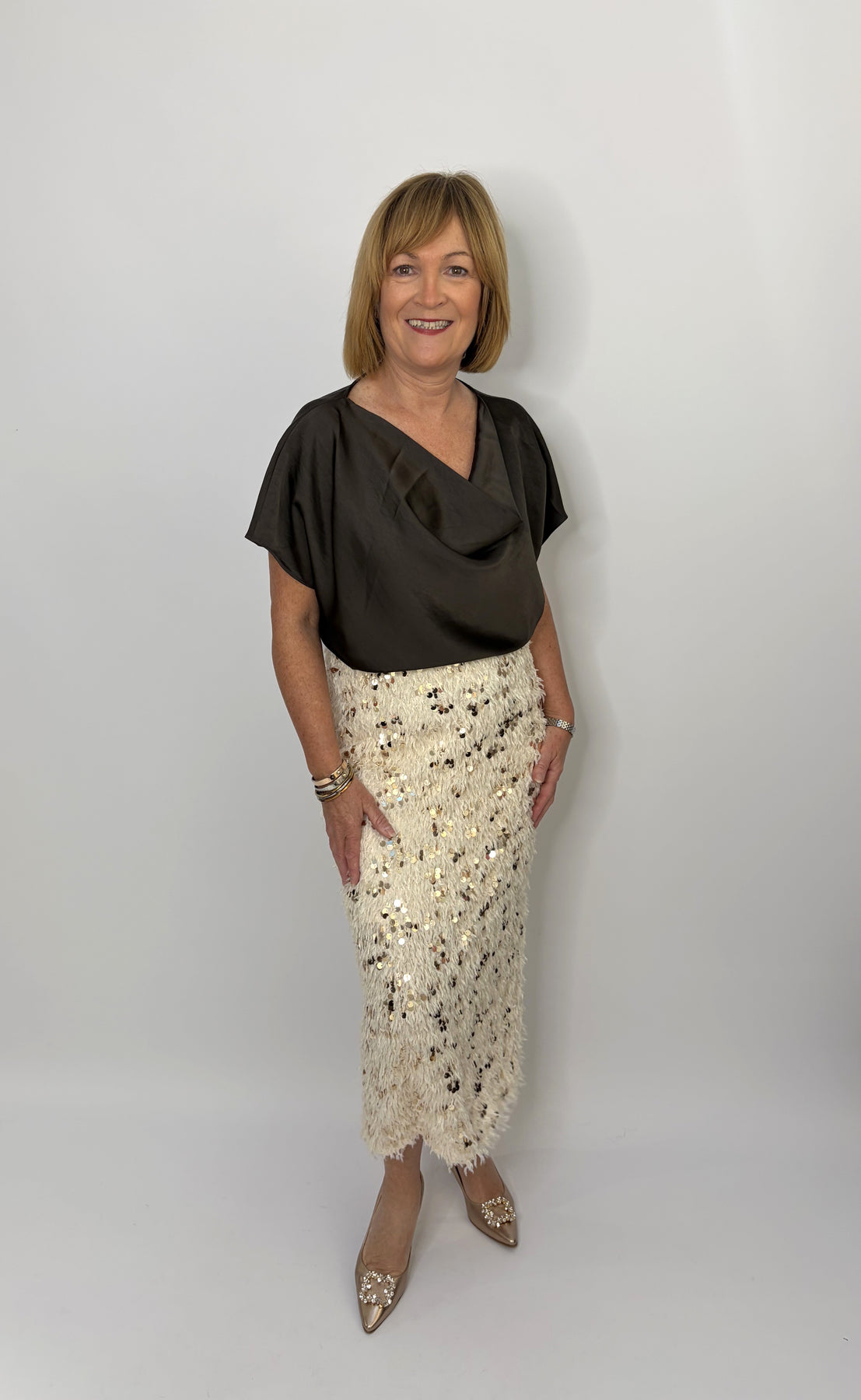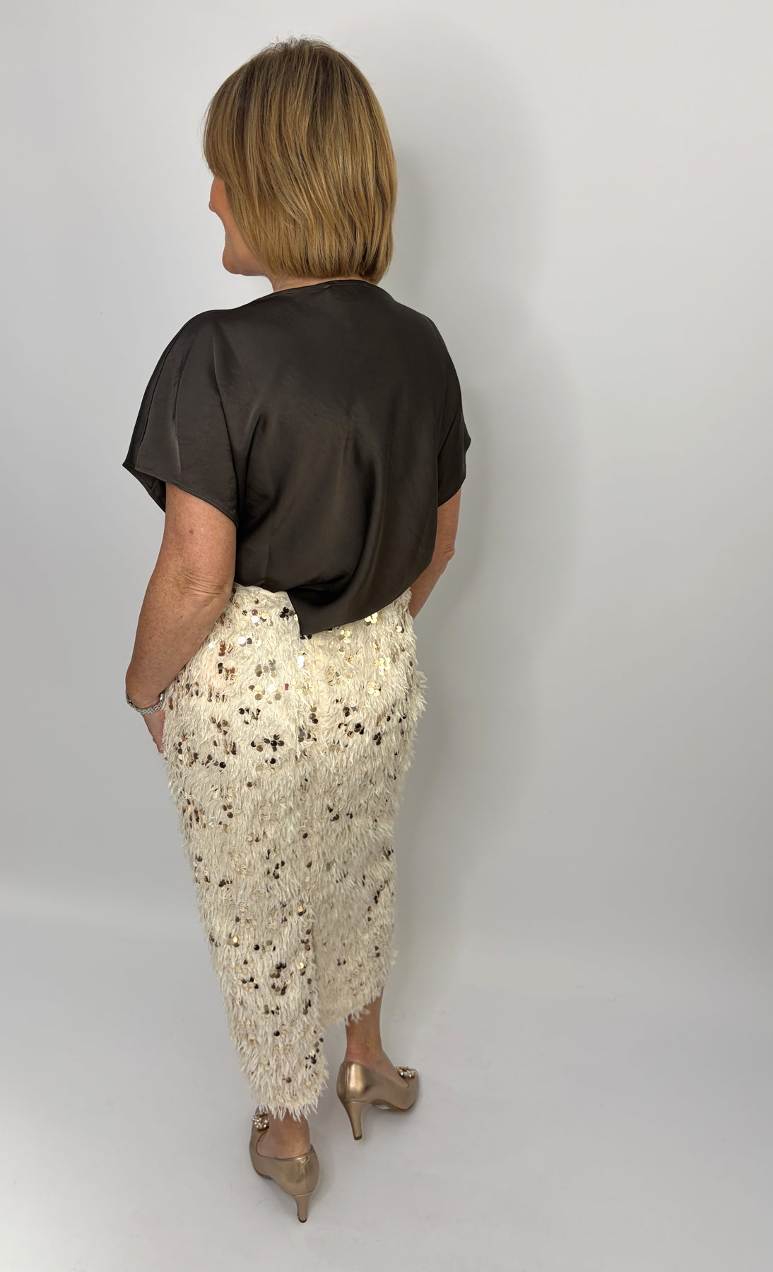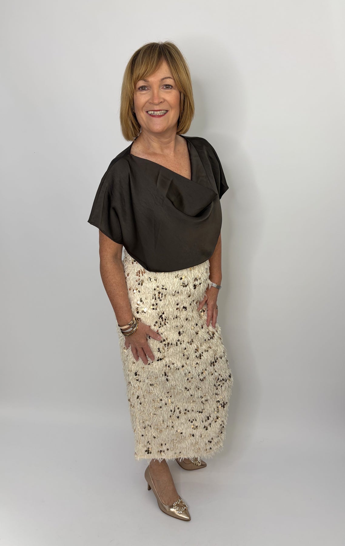 Regular price £59.95This is a stunning chocolate brown flowy brown blouse. This is the perfect blouse if you are looking for something at that has a flow and this will go with nearly everything. This blouse features dropped neckline, short sleeves, boxy shape and a satin type style.