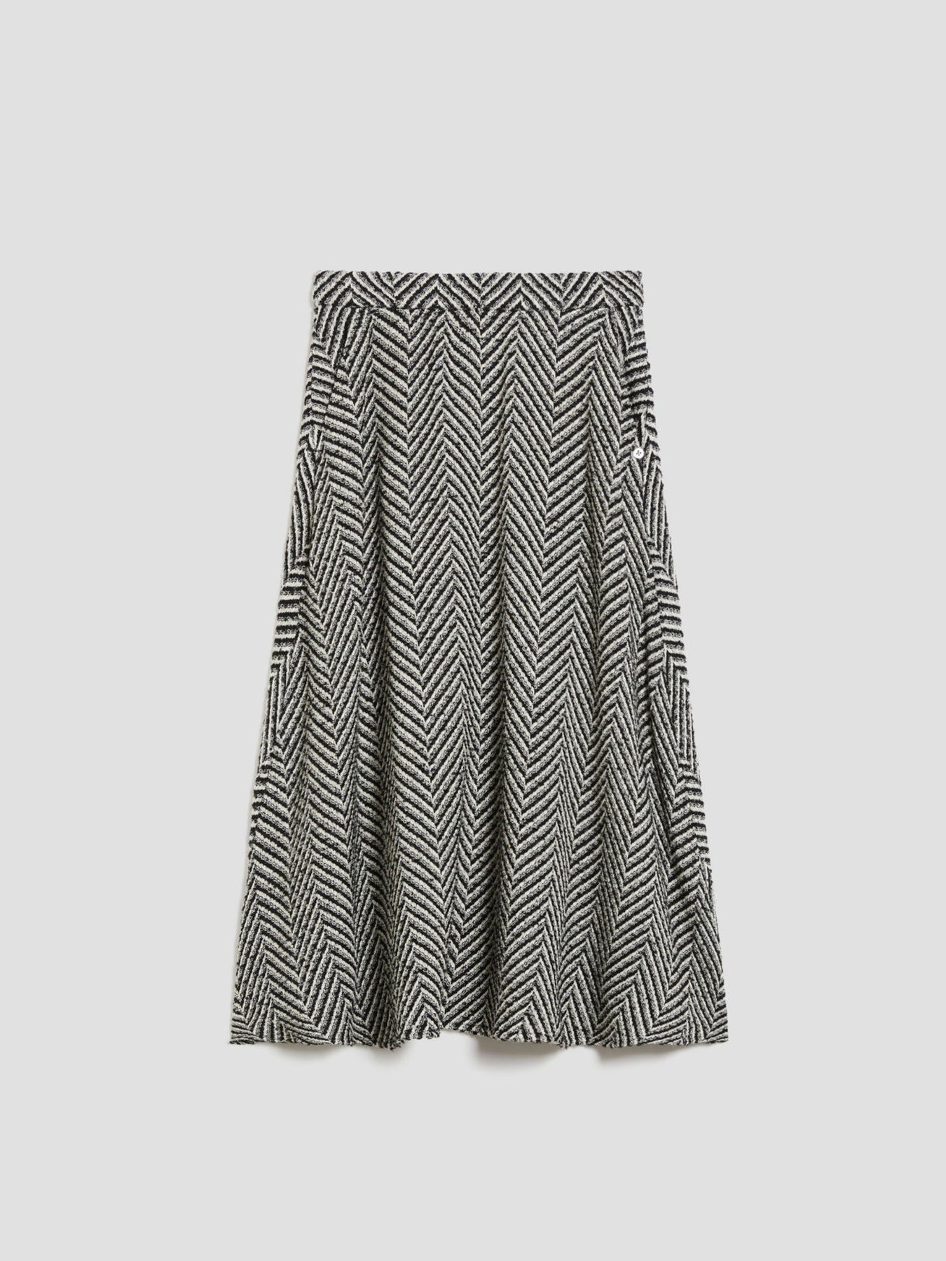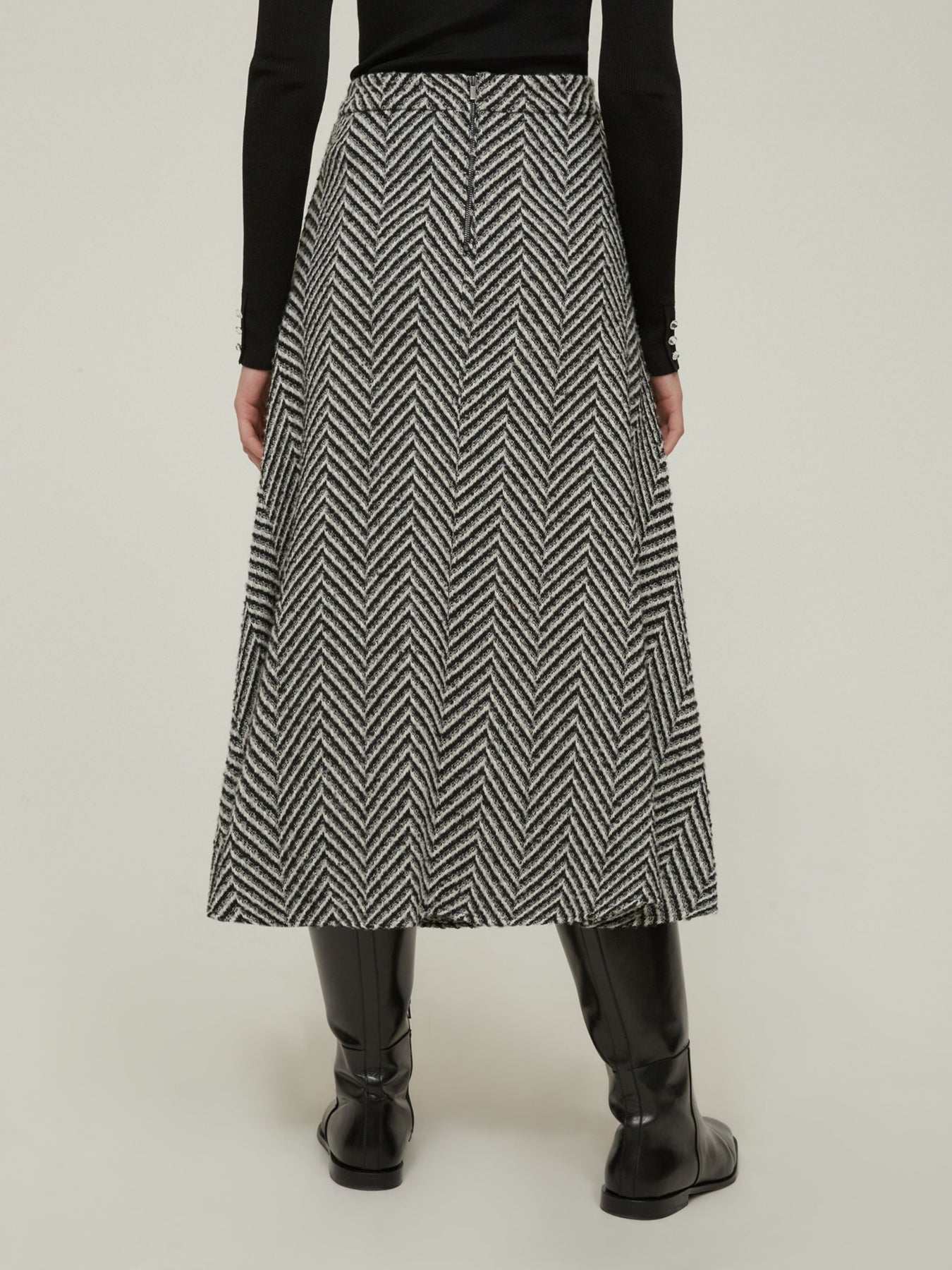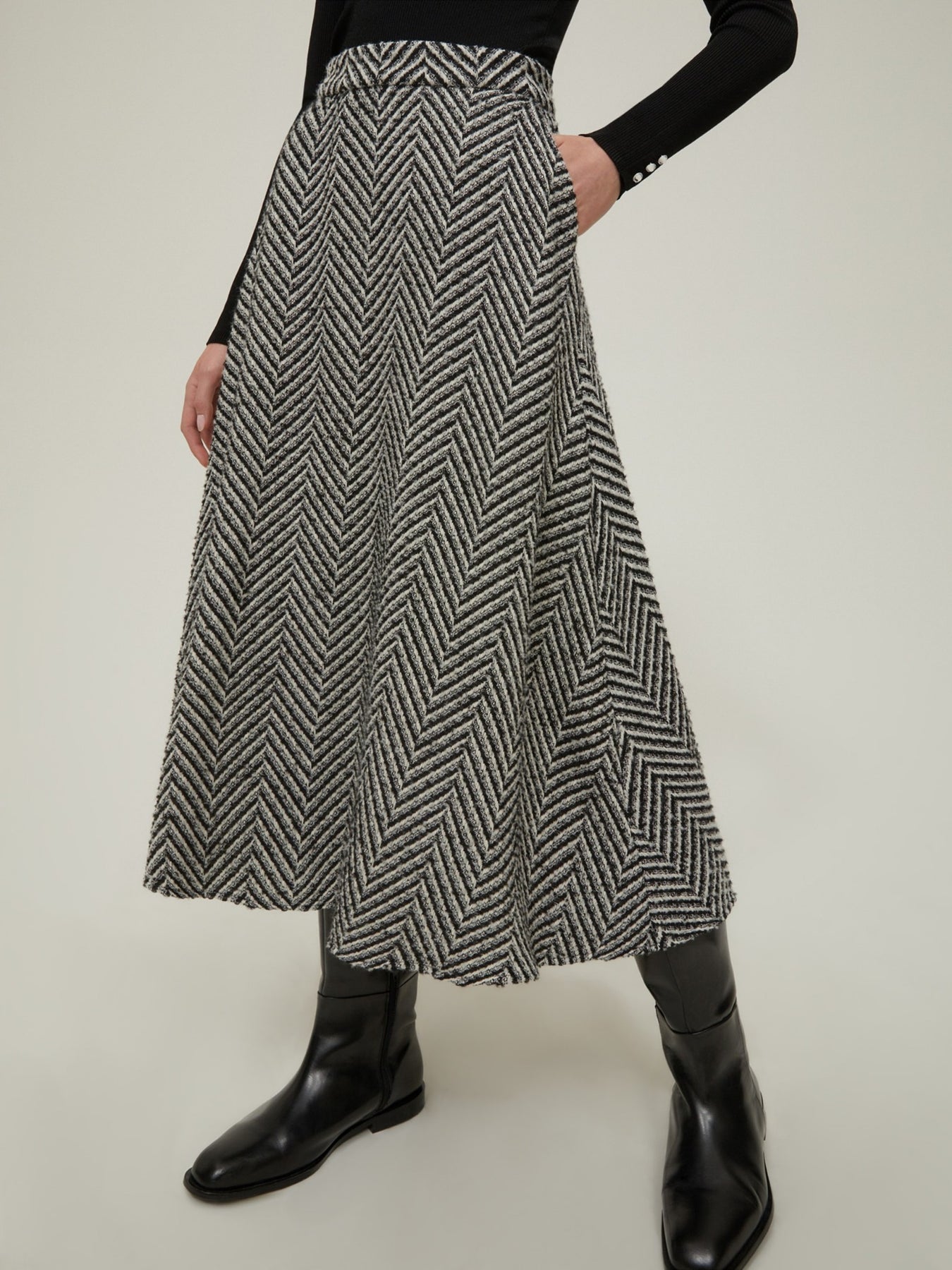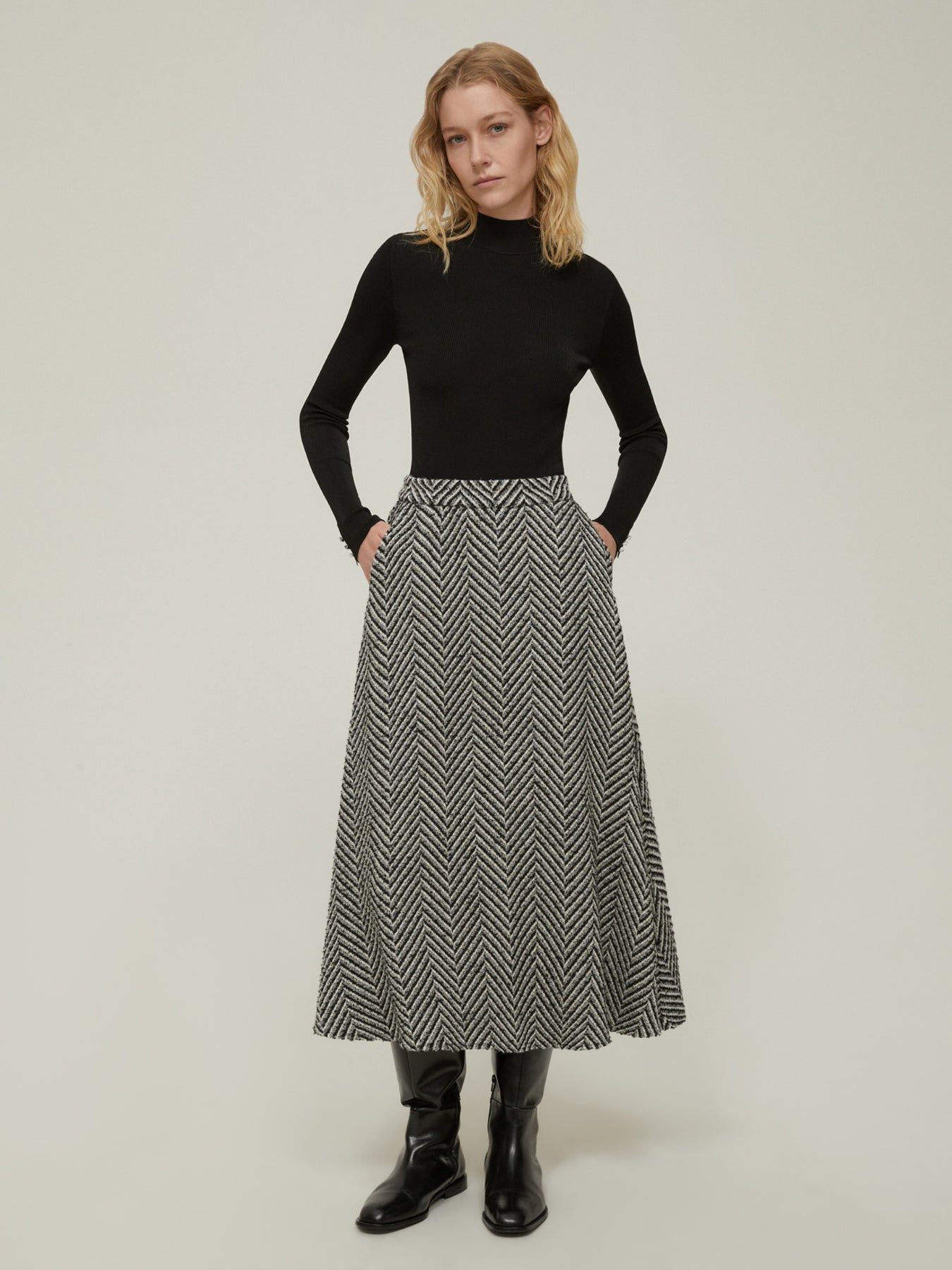 A bon chic silhouette and black & white graphic patterns. This basket weave midi skirt will be the perfect choice for countless occasions. This skirt features herringbone-patterned cotton-blend basket weave fabric, flared fit with a swaying hem cut, mid-rise, slant front pockets, back zip fastening and unlined model.