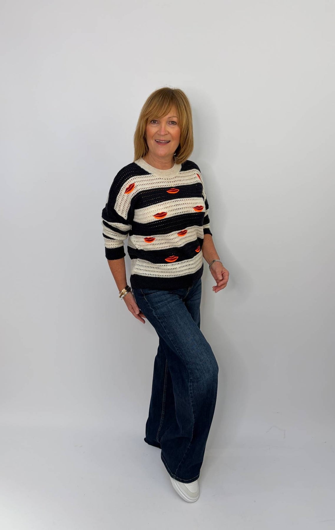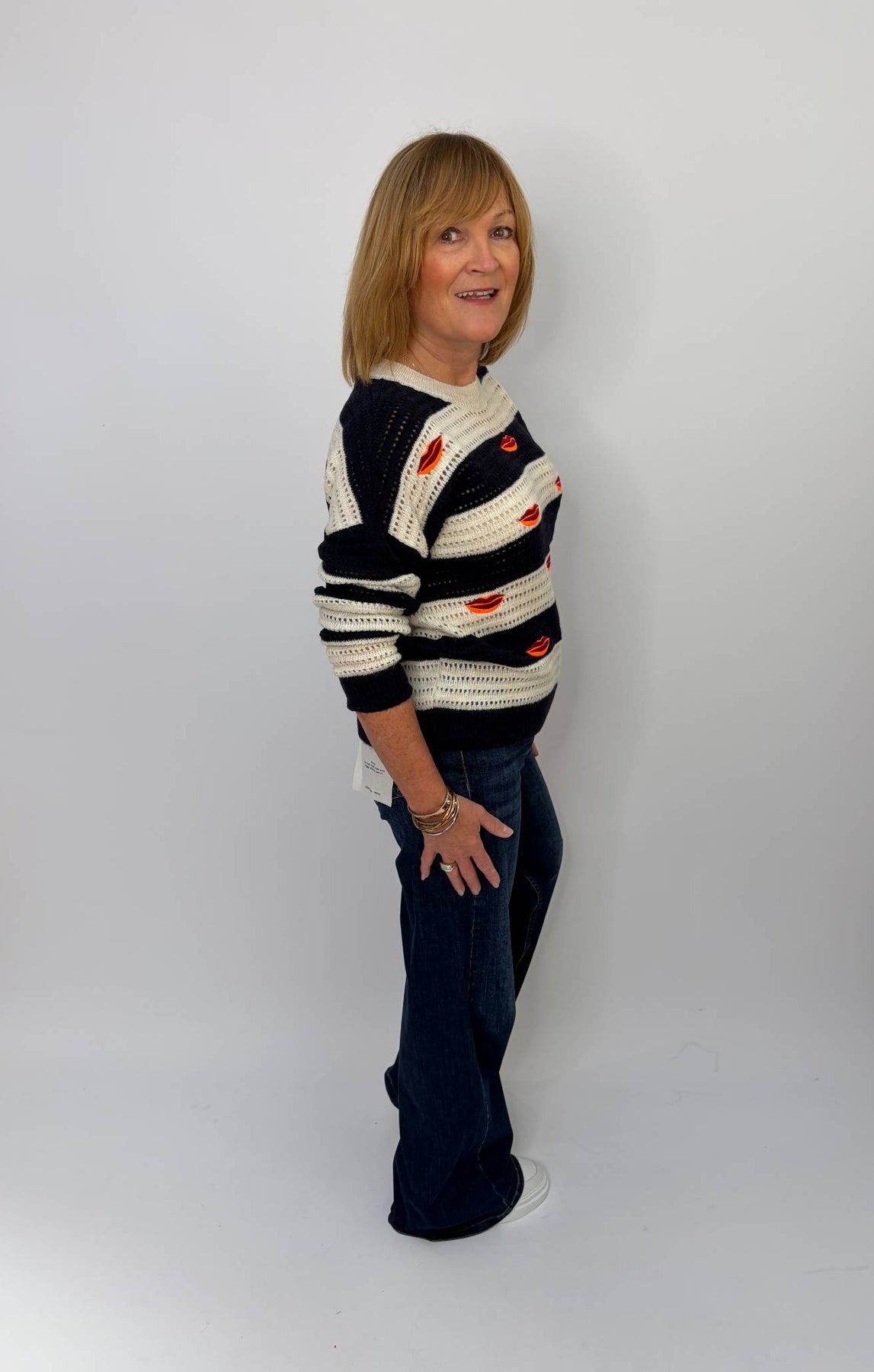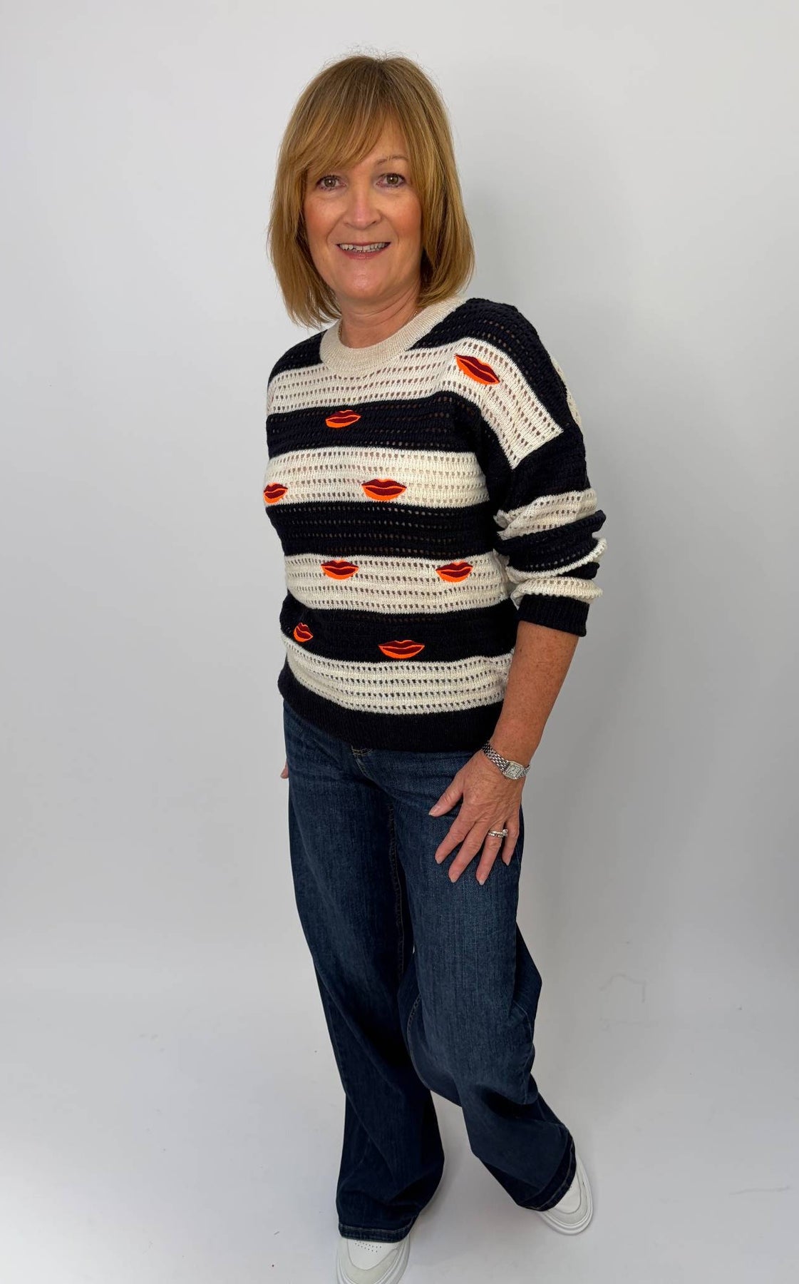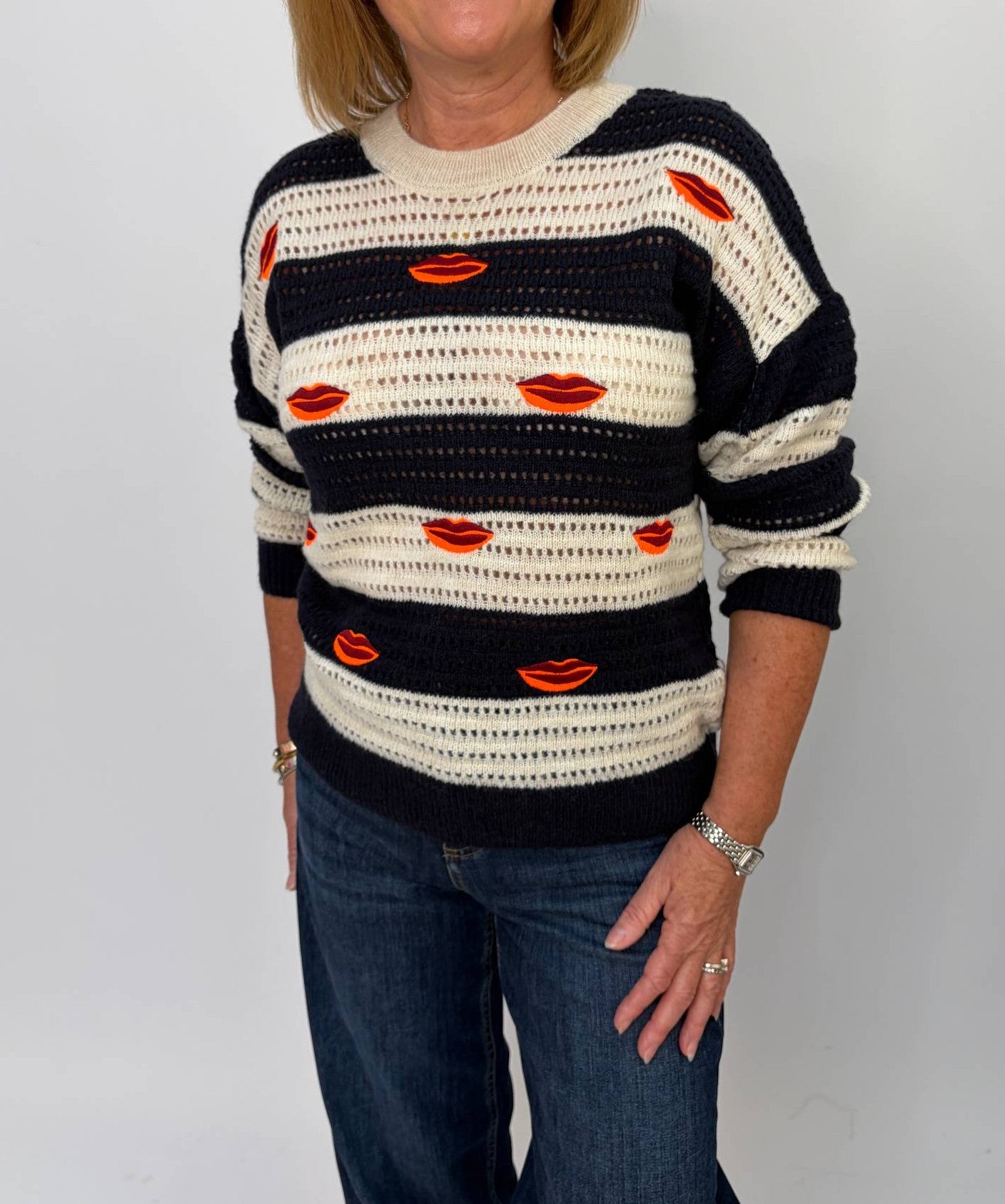 Regular price £210.00Super quirky lip embroidered navy and cream knitted sweater. Style this with your denim or white jeans. Great to have as a layering piece, for those more nippy evenings for a bit of heat in the springtime.