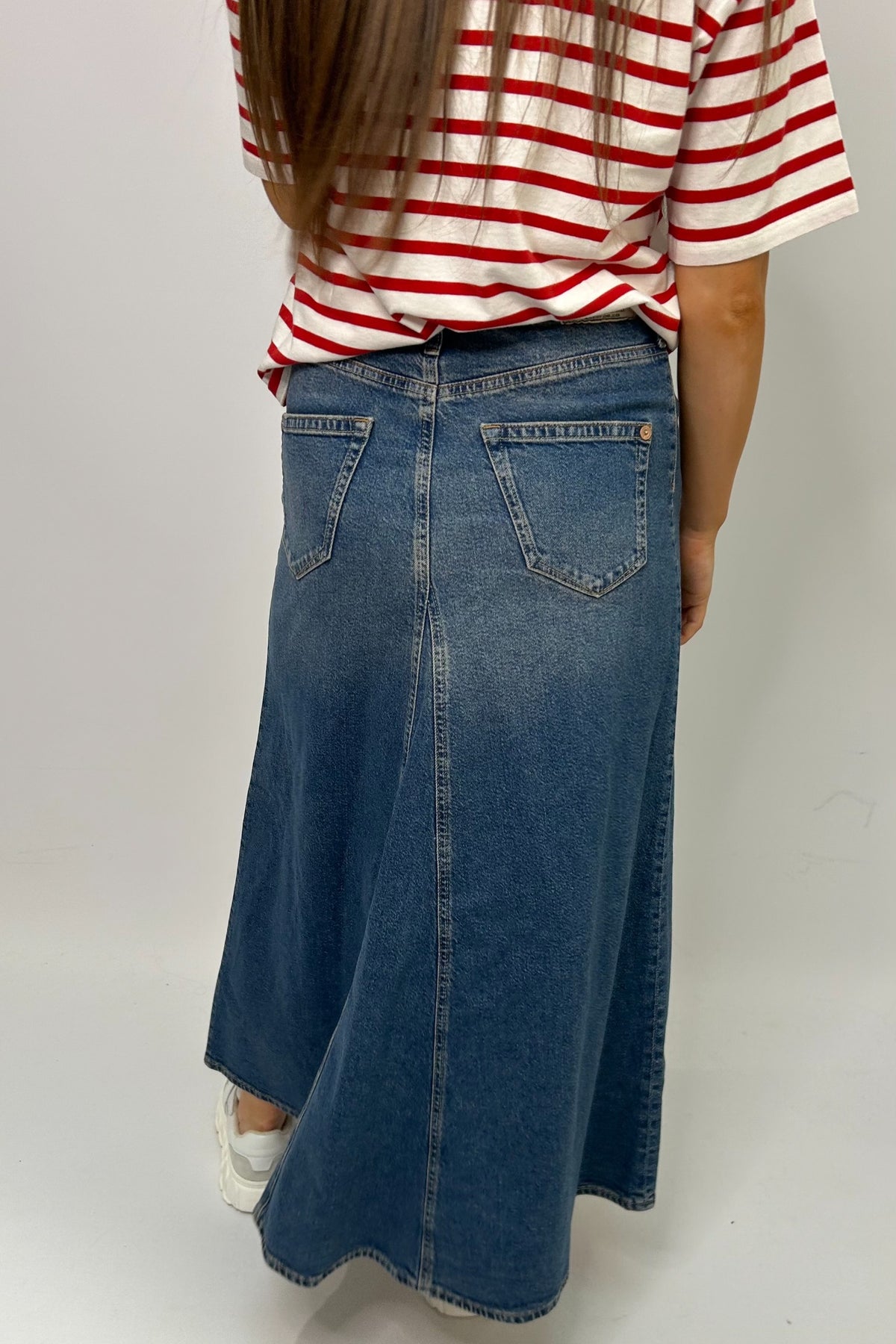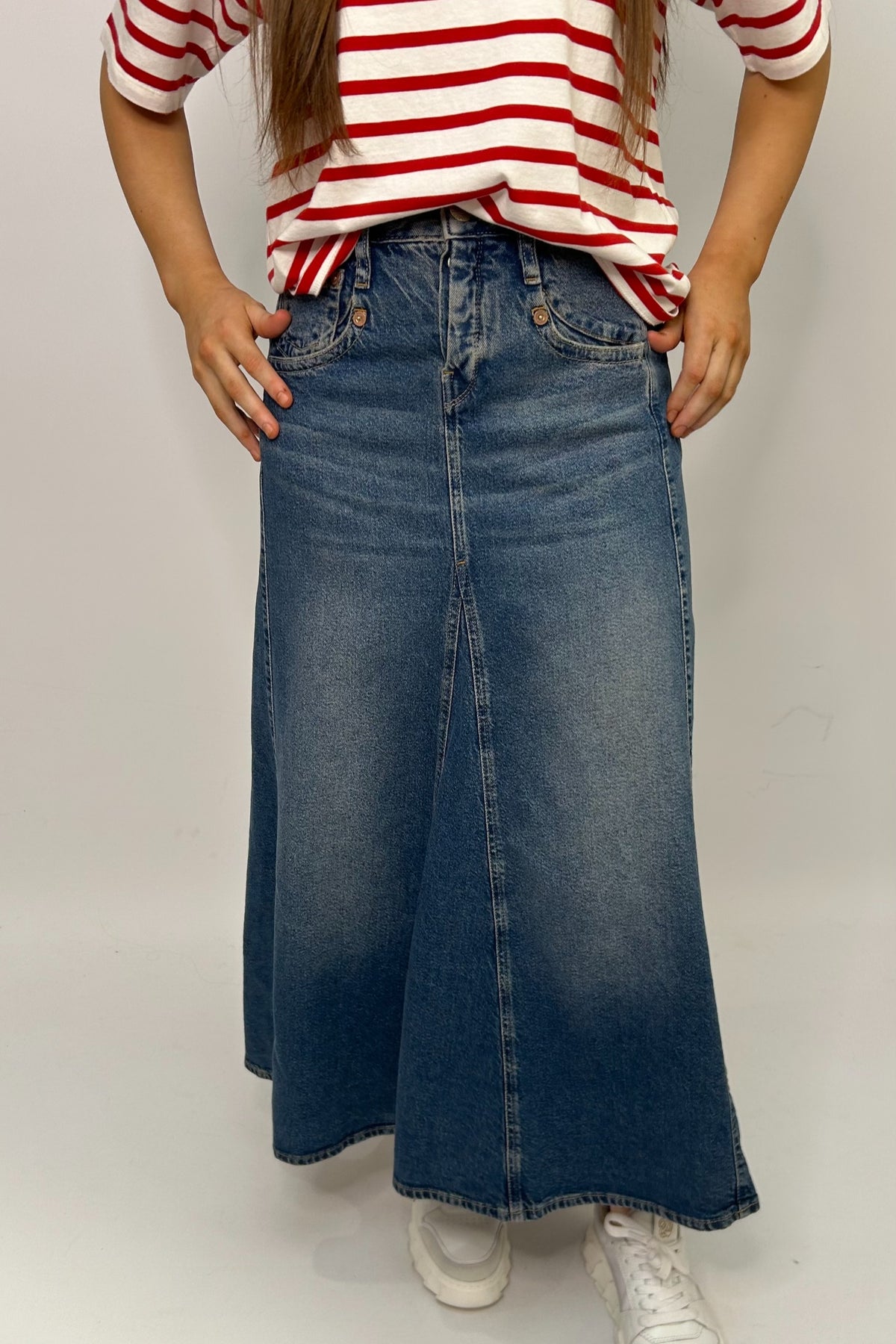 Regular price £129.95This is a lovely blue denim palazzo style skirt, perfect for the spring summer weather for a casual outfit. This skirt features buttons to fasten, sits just above the ankle, has pockets on the front and the back.