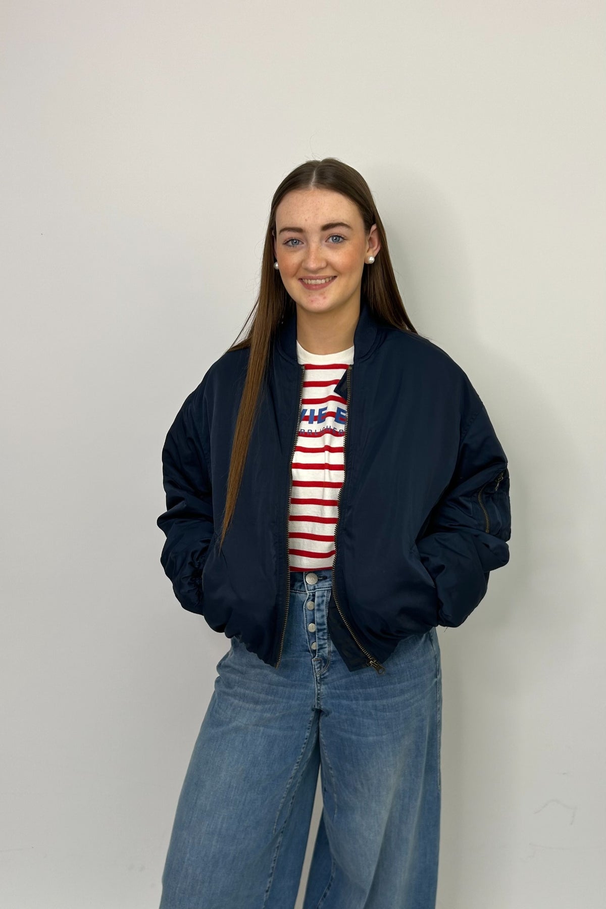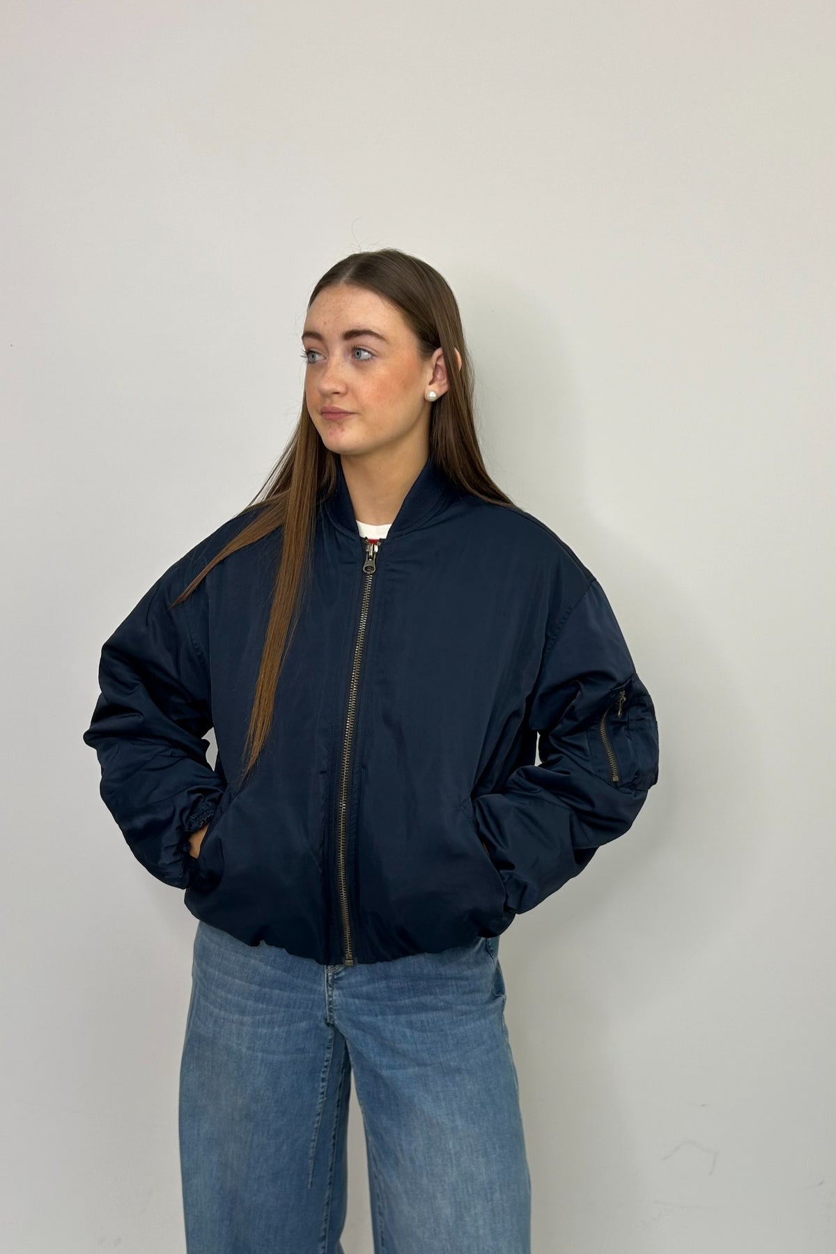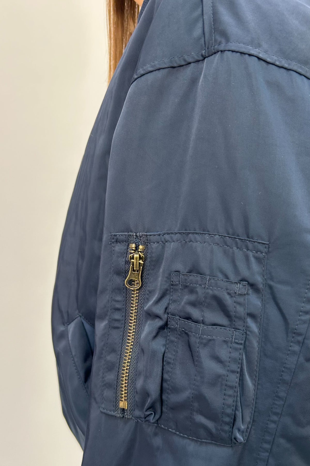 Regular price £144.95This is a fab navy bomber jacket perfect if you need a jacket for a cold day. This bomber jacket with gathered hem. Wide sleeves and extra volume give the jacket a stylish look. Inside, it features "Meine Herrlicher Jacke" lettering and light padding. This jacket features being lightly padded, knitted cuffs at the neck, bronze-coloured zip, sleeve pocket with zip, slanted piped pockets and gathered hem.