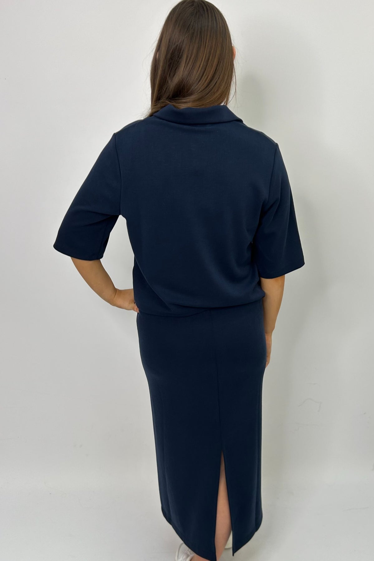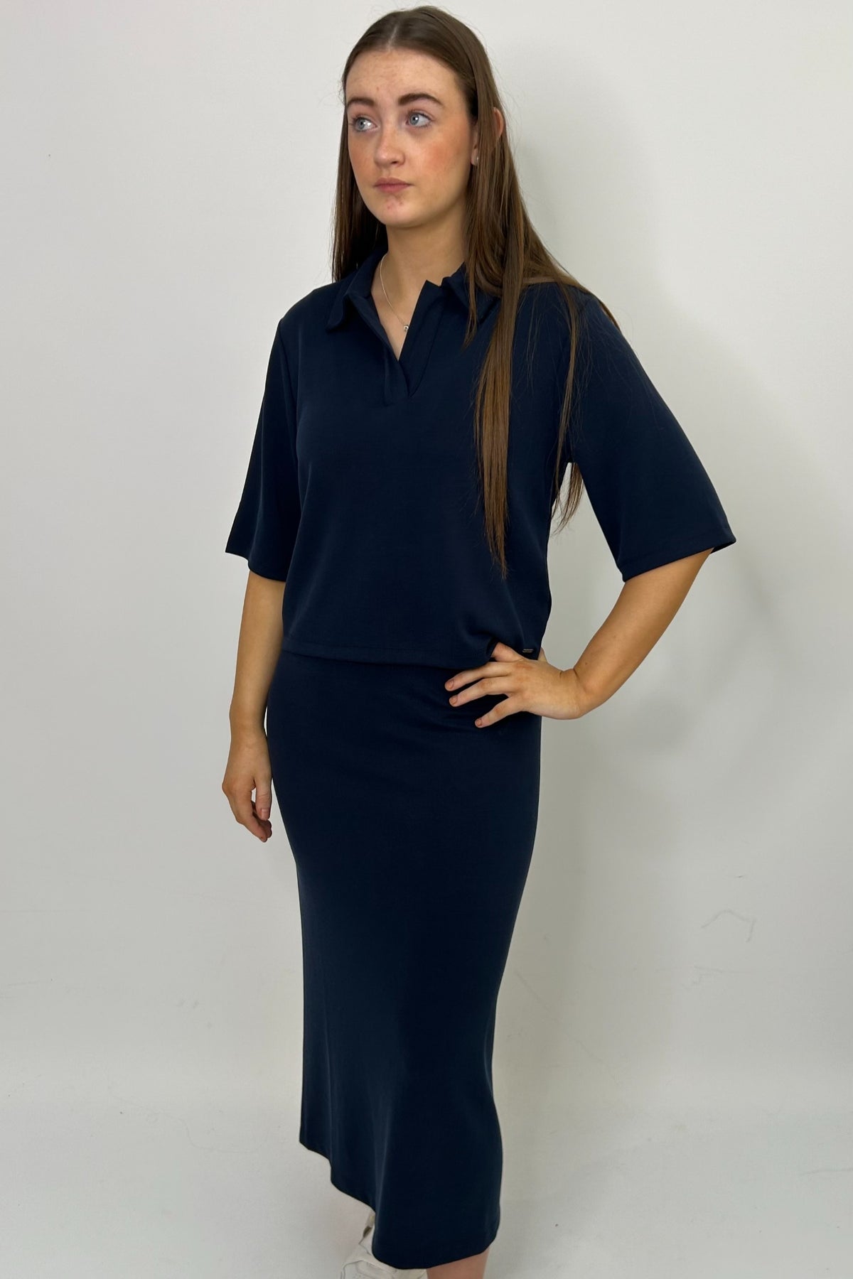 Regular price £84.95This is a lovely navy jersey top, which has a matching skirt to make a fab outfit combo ( Sold Separately). This top will go with a lot of colours. This top features short sleeves, standard collar, V-neckline and polo shirt style and boxy fit.