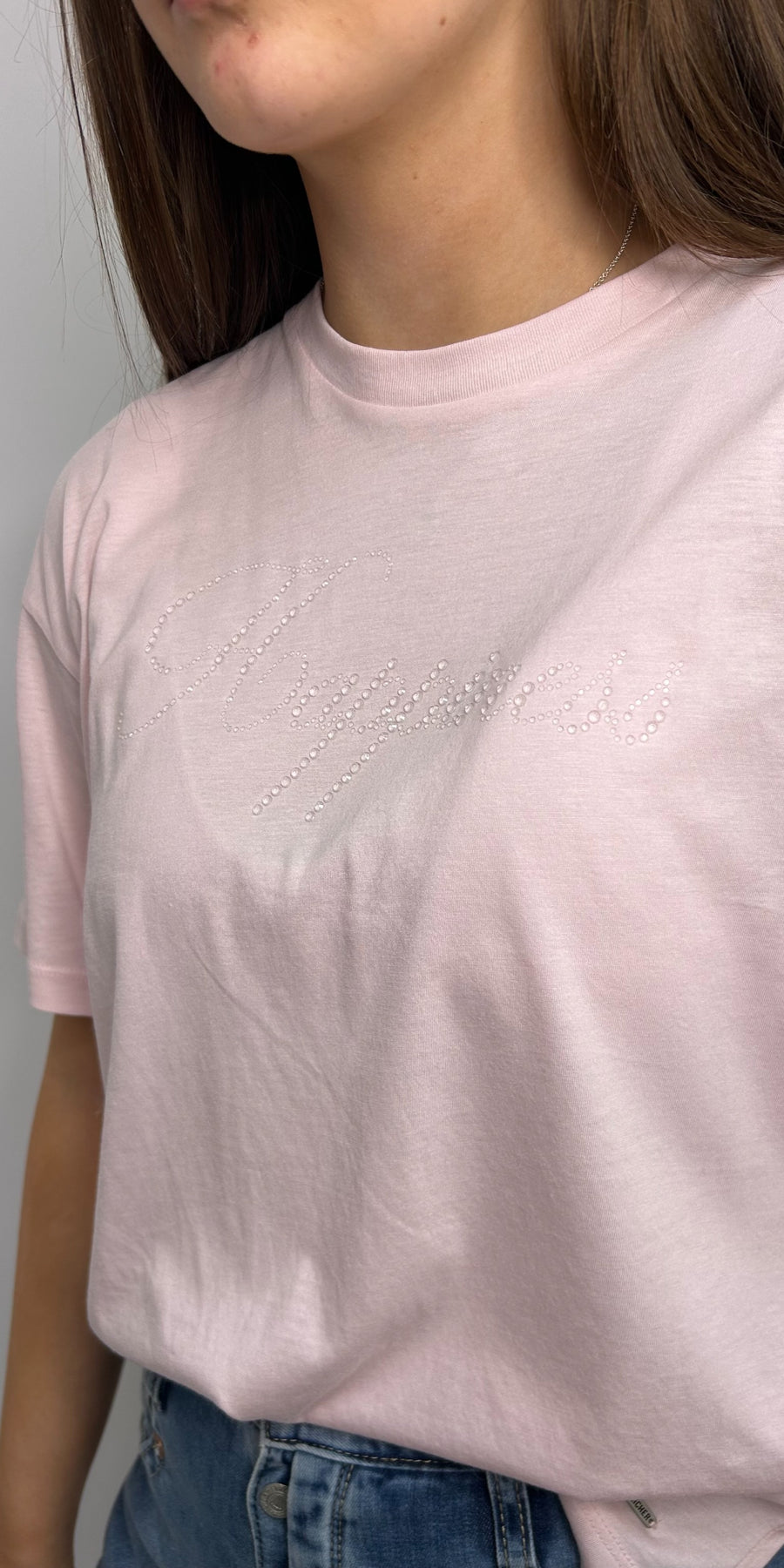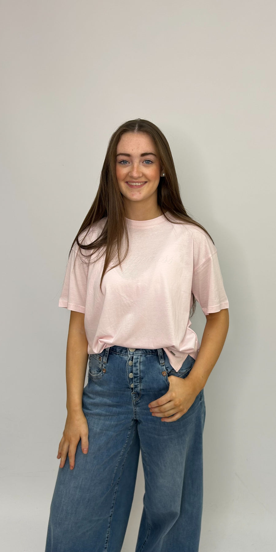 Regular price £69.95This is a lovely pink t-shirt with happiness on the front in gem stones. This is the perfect essential for your spring/summer wardrobe. This t-shirt features a round neckline, short sleeves and a regular fit.