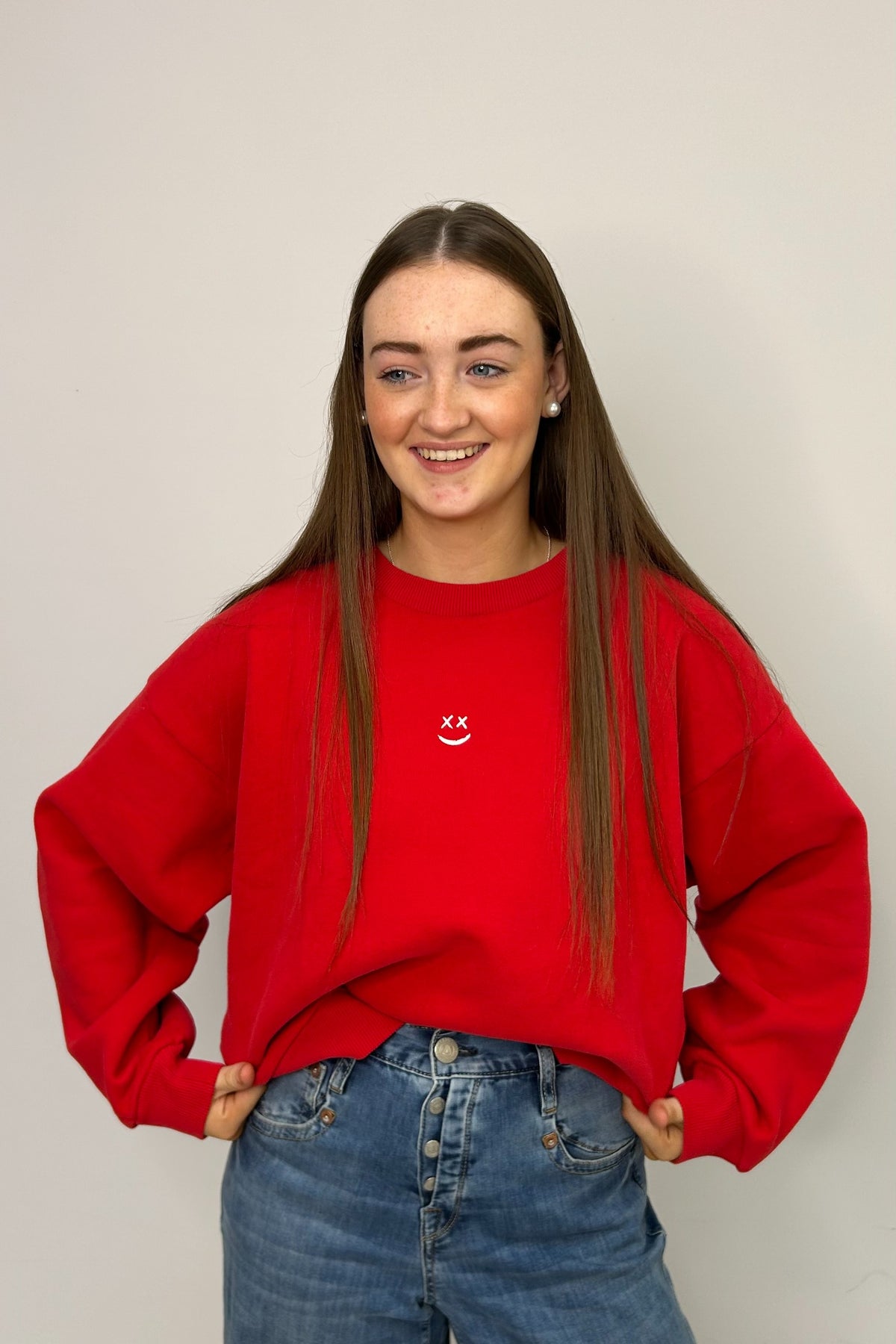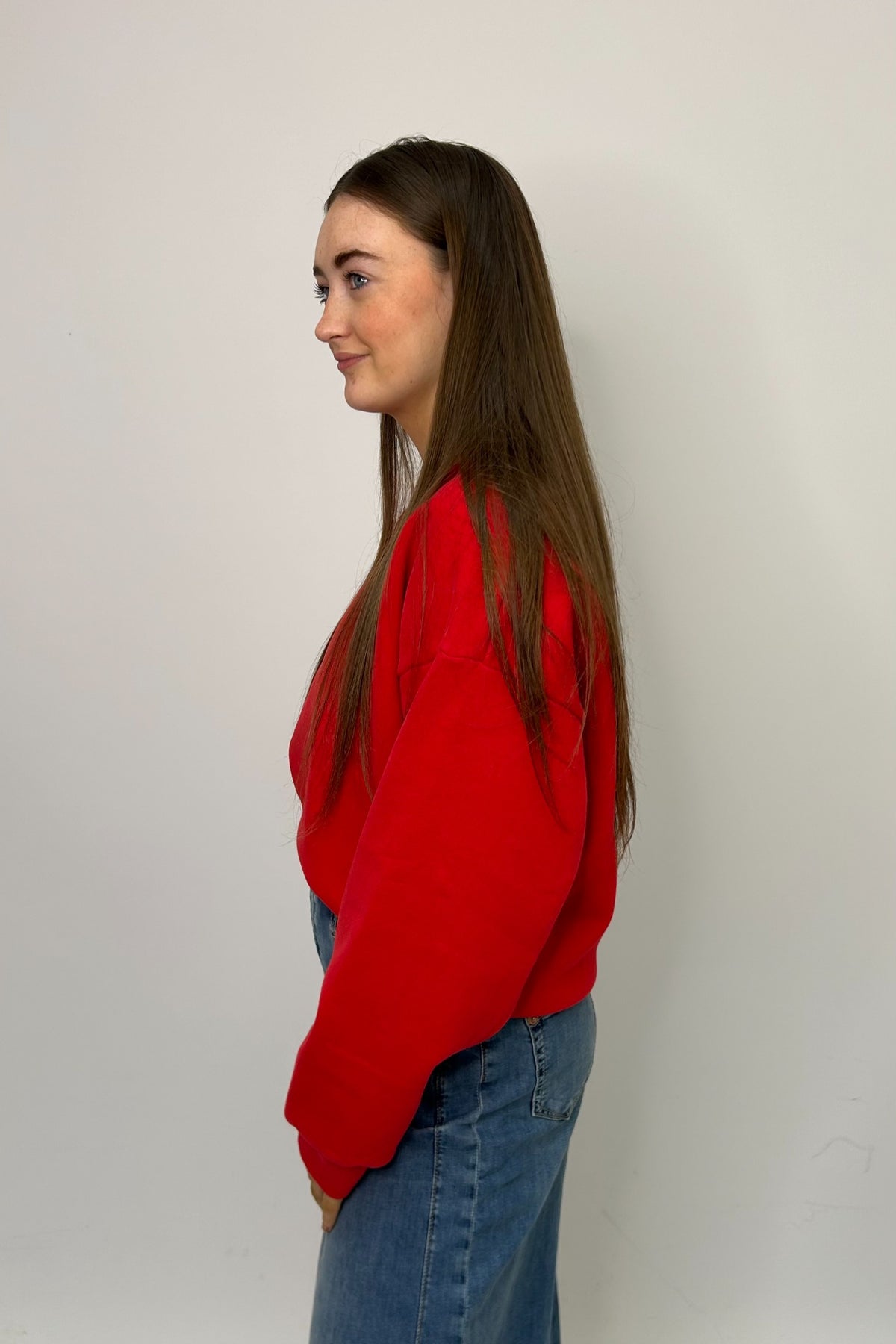 Regular price £99.95This is a gorgeous red sweatshirt, this is great item for your spring/summer wardrobe. This will be great to layer with on those colder days. This sweatshirt features a round neckline, long sleeves, boxy shape and slightly cropped style.