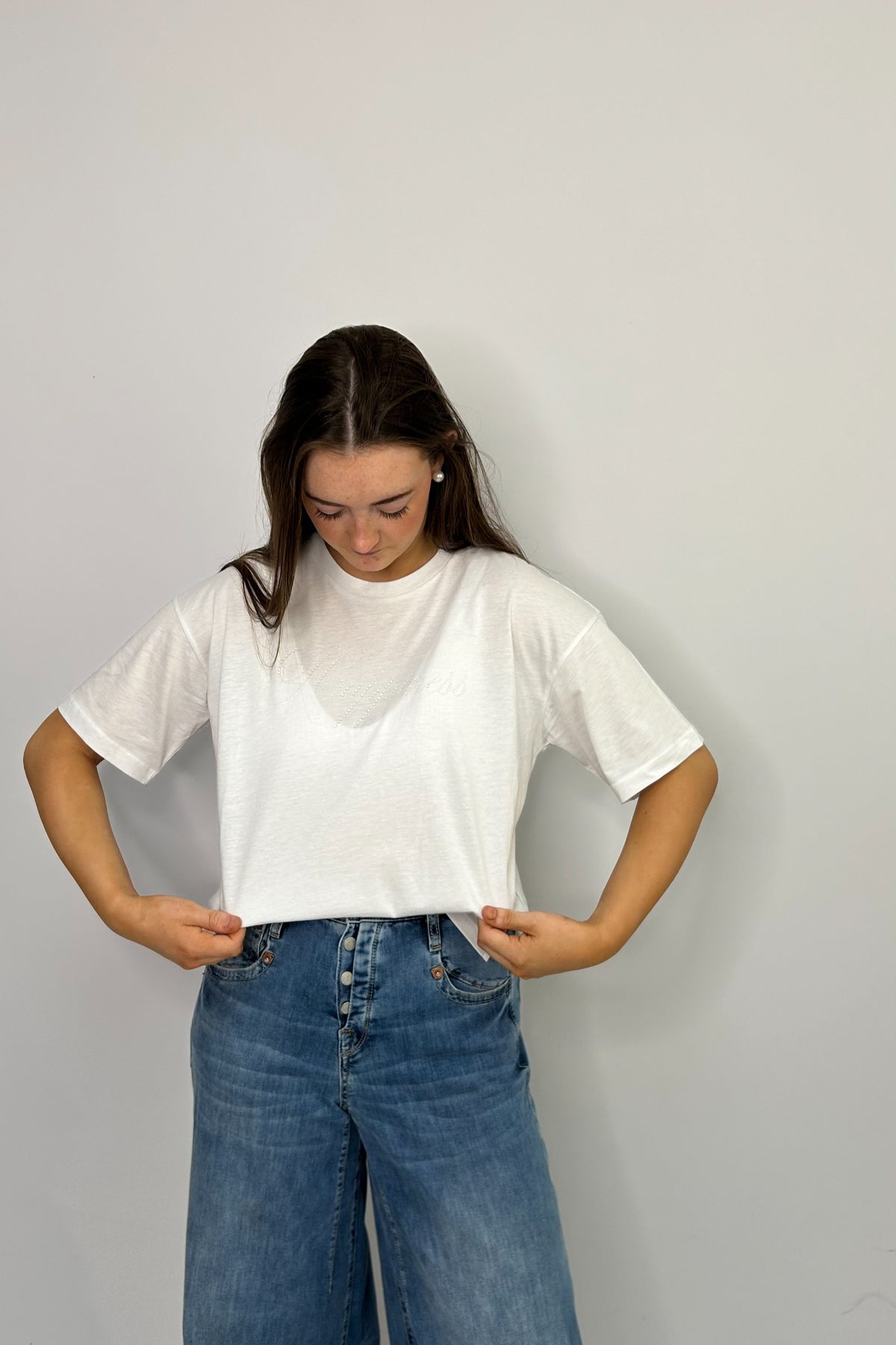 Regular price £69.95This is a lovely white t-shirt with happiness on the front in gem stones. This is the perfect essential for your spring/summer wardrobe. This t-shirt features a round neckline, short sleeves and a regular fit.