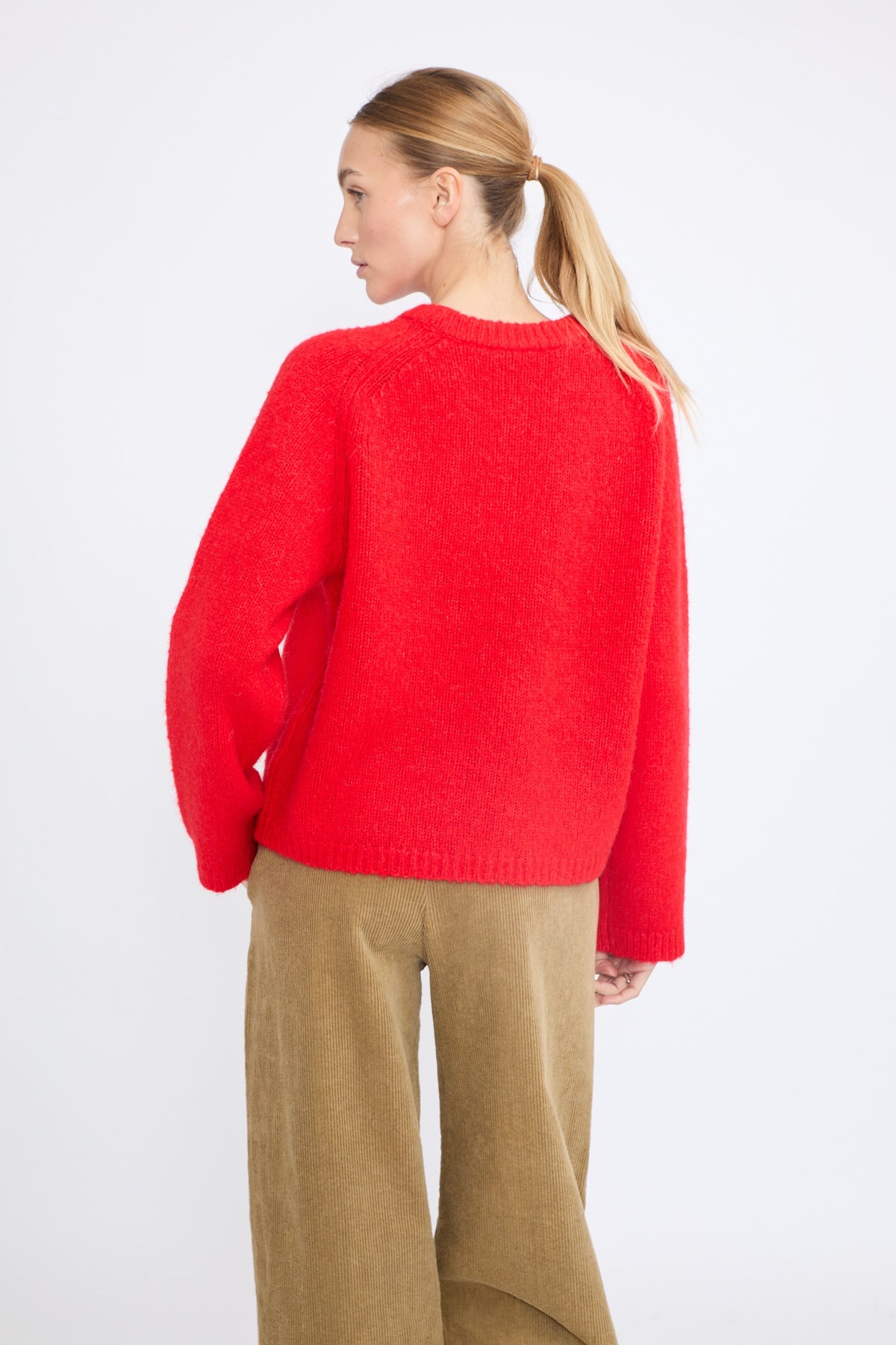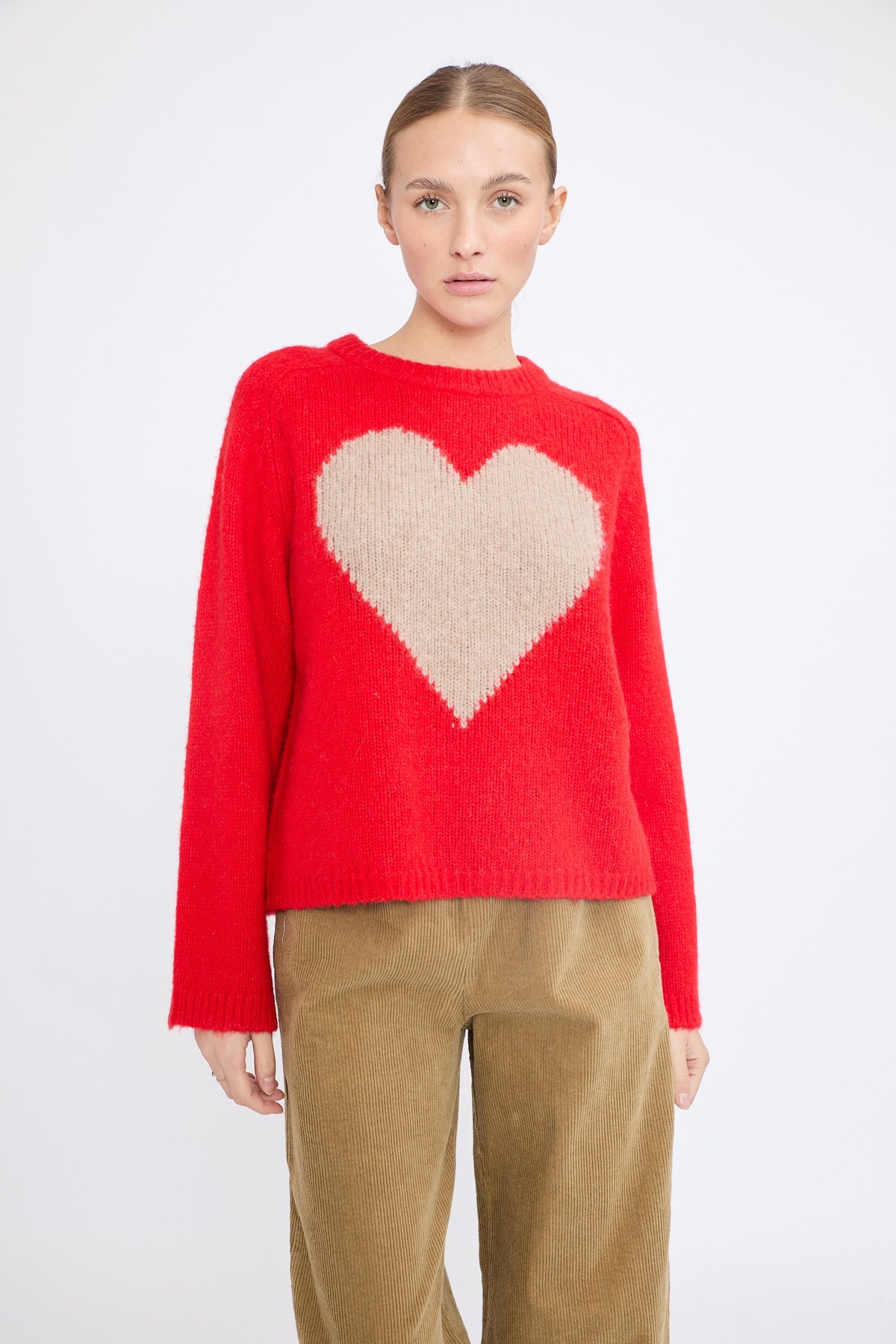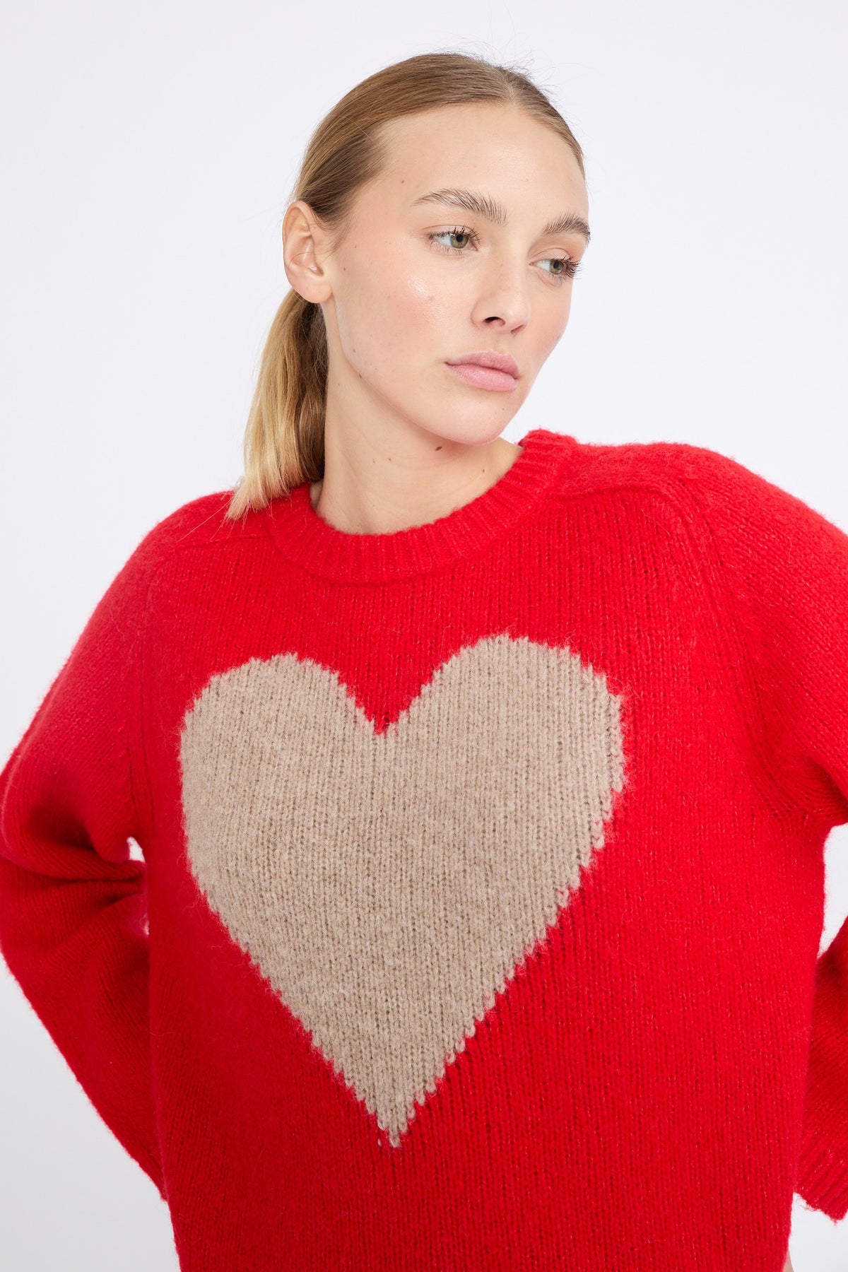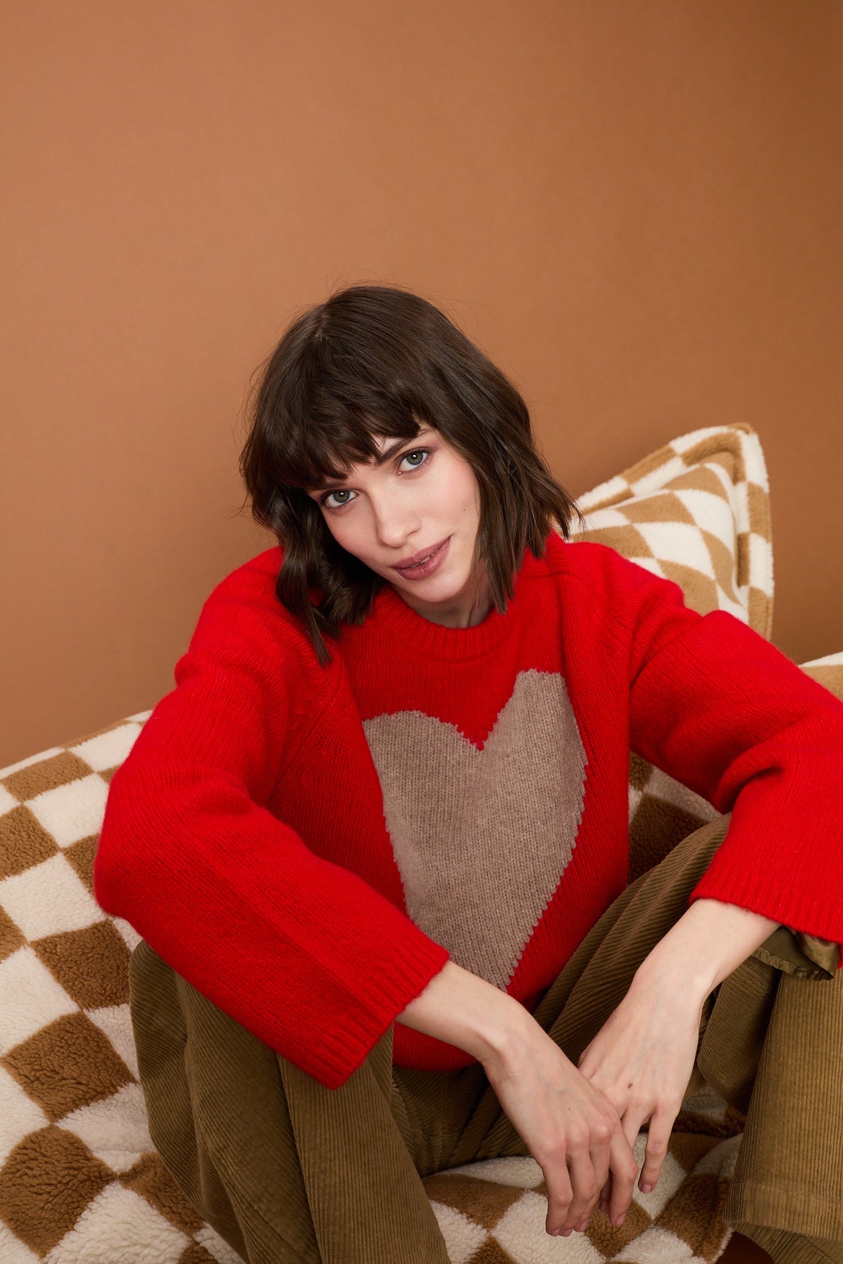 A cosy sweater with an oversized vibe and a bold heart motif front and centre. Soft, warm, and playfully chic, it pairs perfectly with jeans or skirts. The sweater that warms both your look and your day. This sweater features a straight and slightly loose fit, round neckline, contrasting heart and soft and warm wool blend.