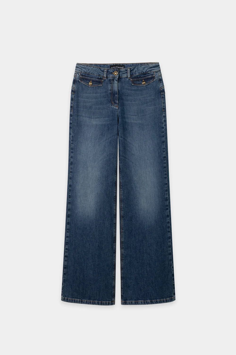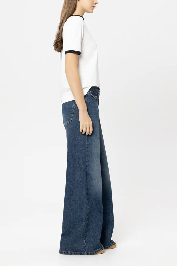 Regular price £265.00Flared jeans in stretch fabric with a pronounced wide leg. There are decorative flap pockets with decorative buttons under the waistband.