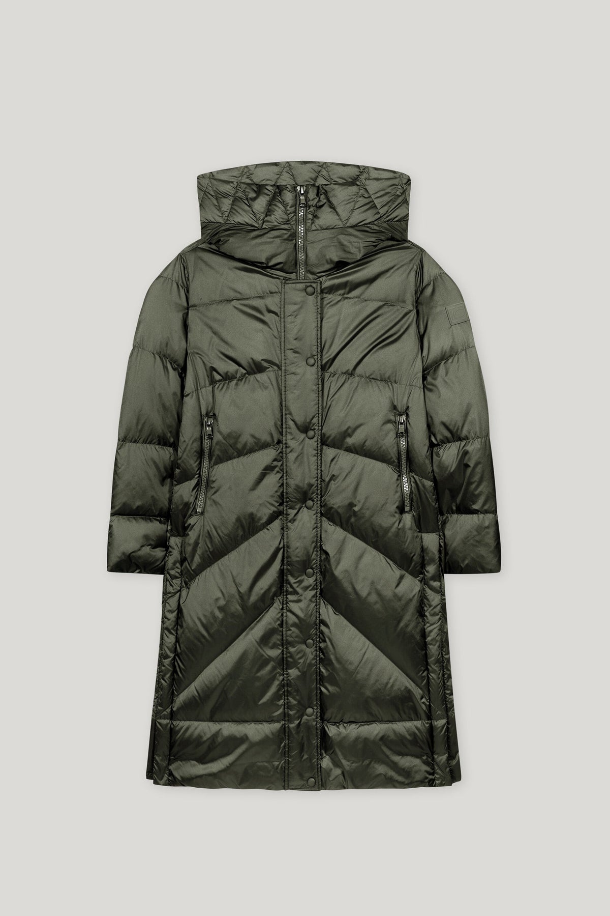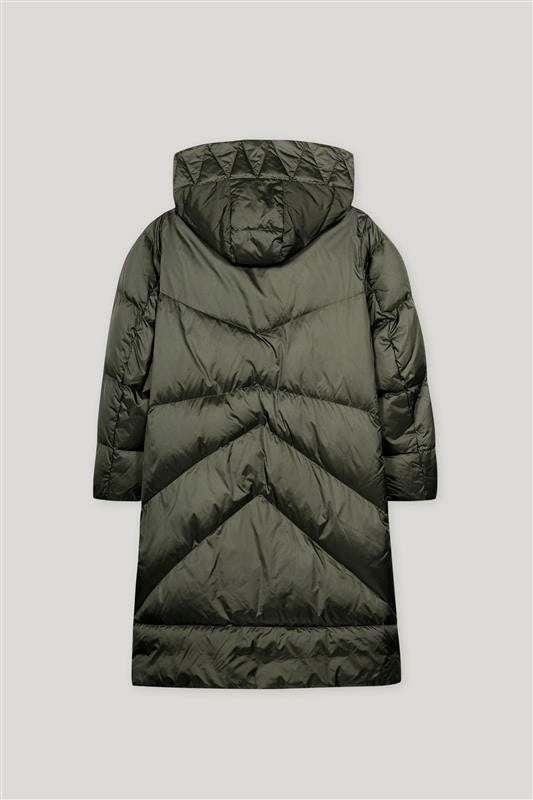 Regular price £699.00This is a lovely warm coat for this winter weather and matching in with this seasons colours. It's Warm, quilted down coat with a fixed hood, concealed two-way front zipper and two zipped side pockets. The hem is slit up the side and has a press stud placket.
