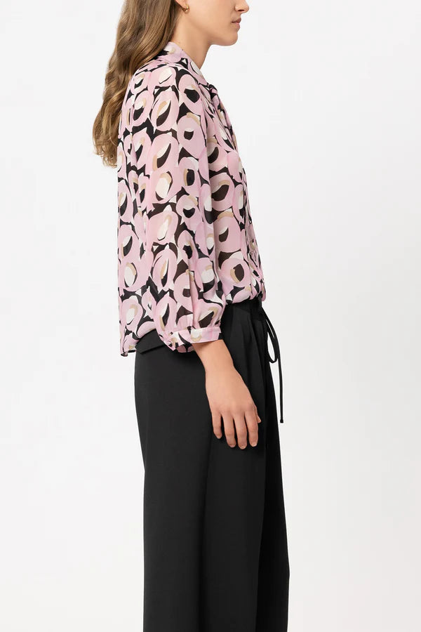 Regular price £265.00Semi-transparent shirt blouse made of flowing viscose crêpe with an exclusive retro print, flap detail and balloon sleeves. The buttons on the cuffs and button placket are covered with fabric.